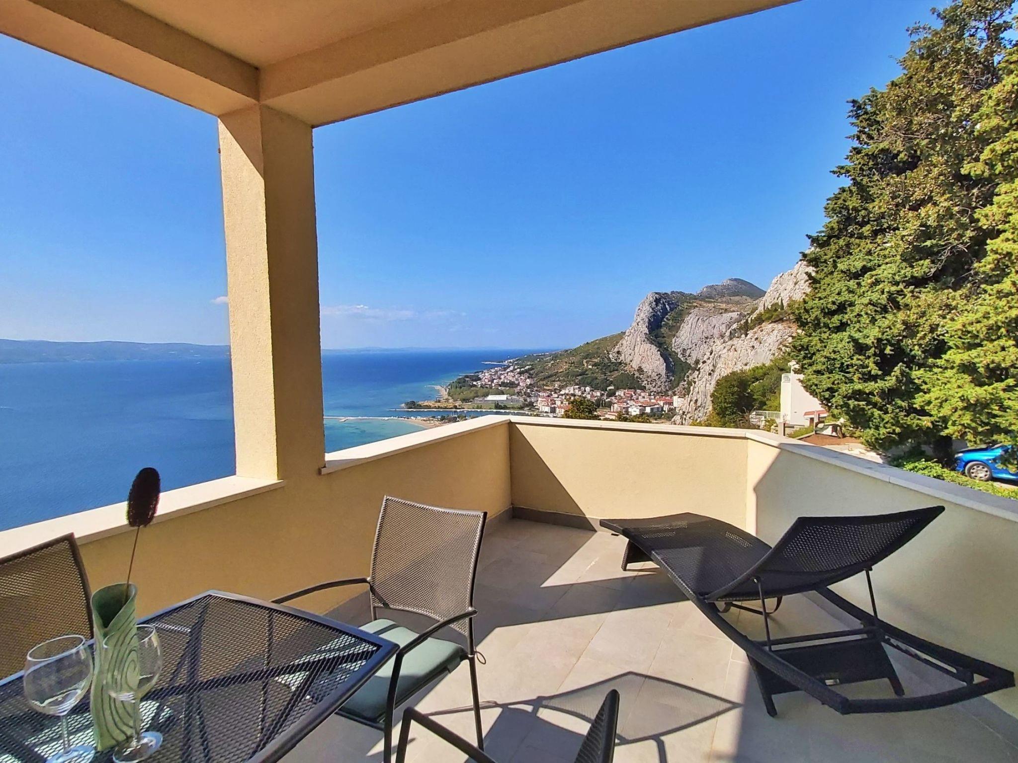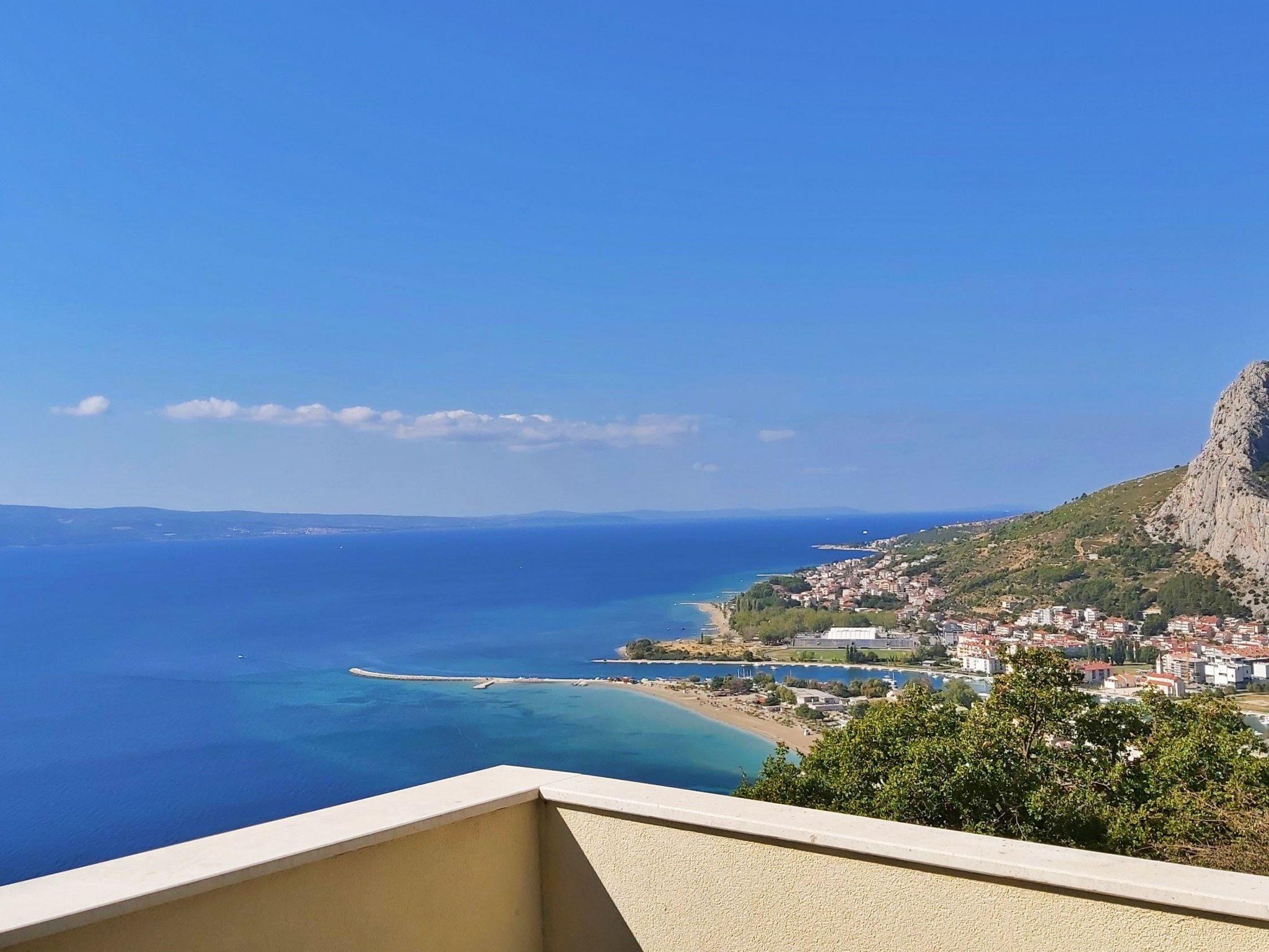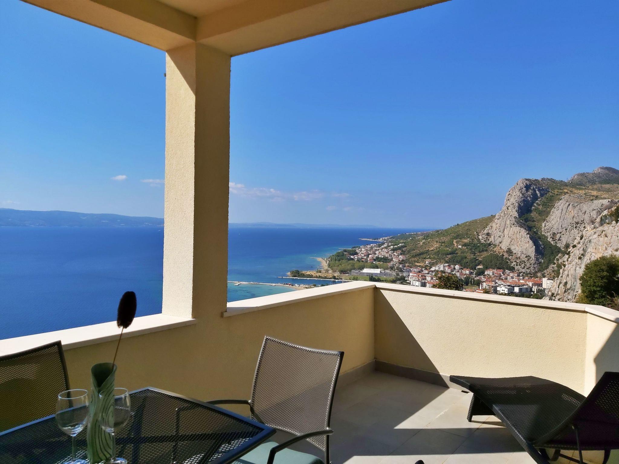 The apartment can accommodate up to 4 persons (2+2) and it’s layout features one bedroom with a double bed, a living room with a view of the sea, with an extendable couch for two extra sleeping possibilities. In addition, the apartment has a fully equipped kitchen (microwave, oven, refrigerator, pots, pans, cutlery etc. included) and a dining area and one bathroom.The apartment also features a beautiful, large balcony with a stunning view of the sea and Omis town and its surroundings. The balcony has outdoor furniture. Wi-Fi, SAT/TV and air-conditioning are available as additional amenities.
