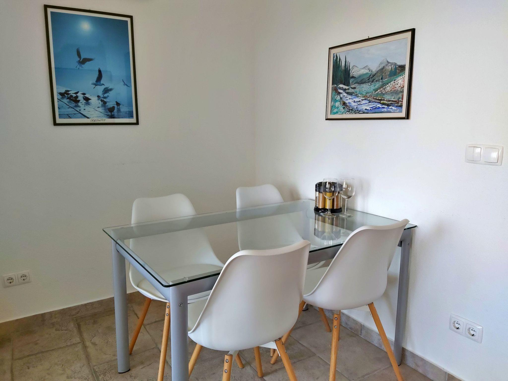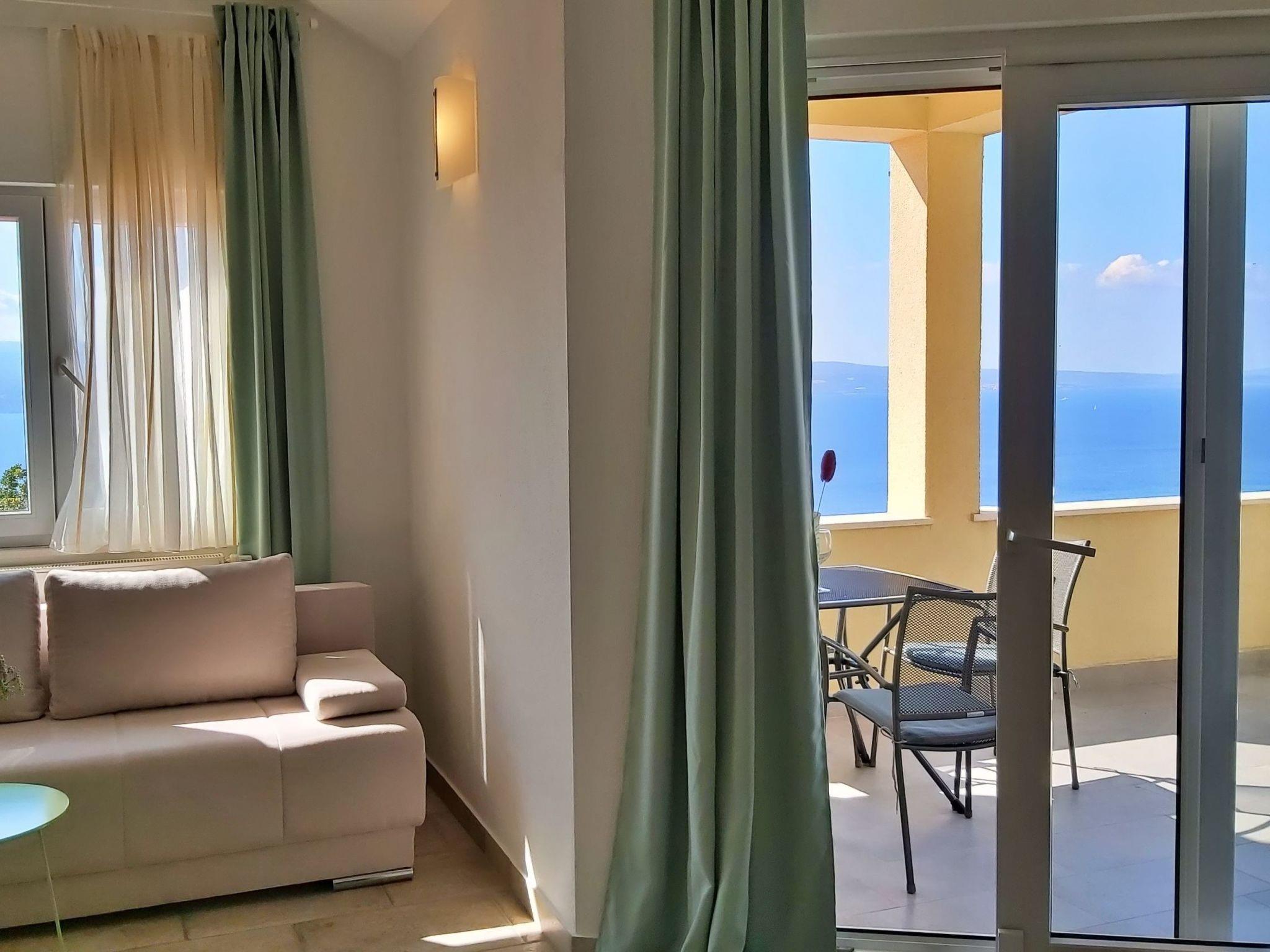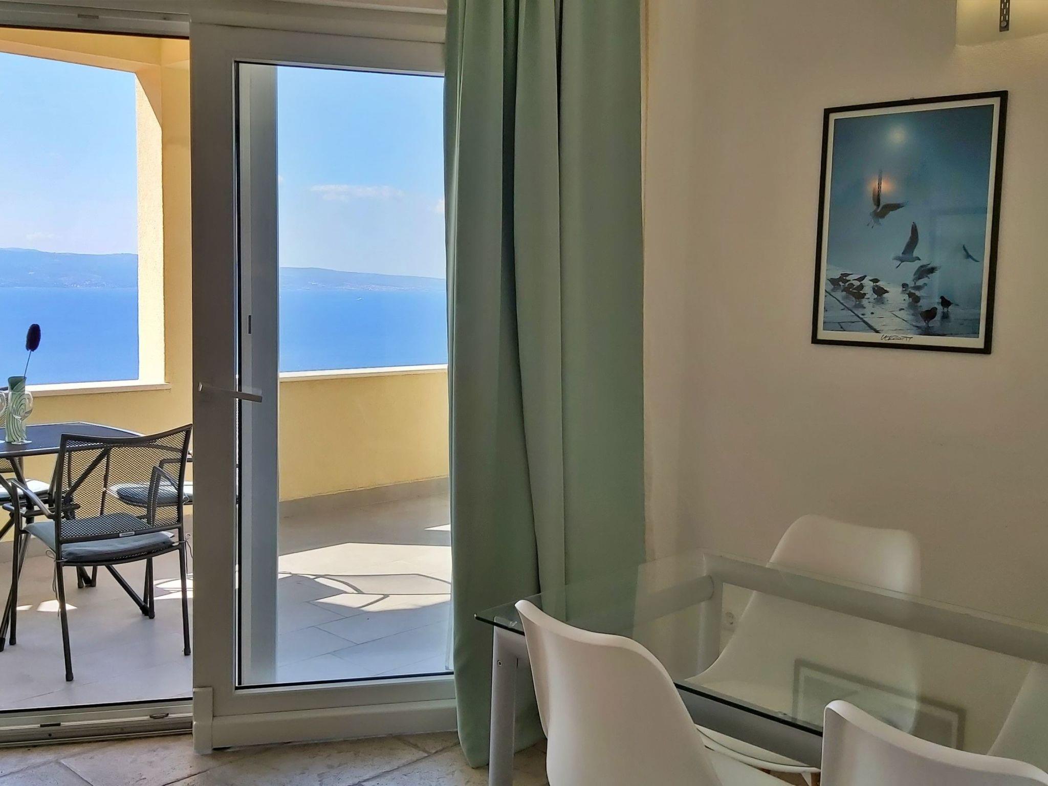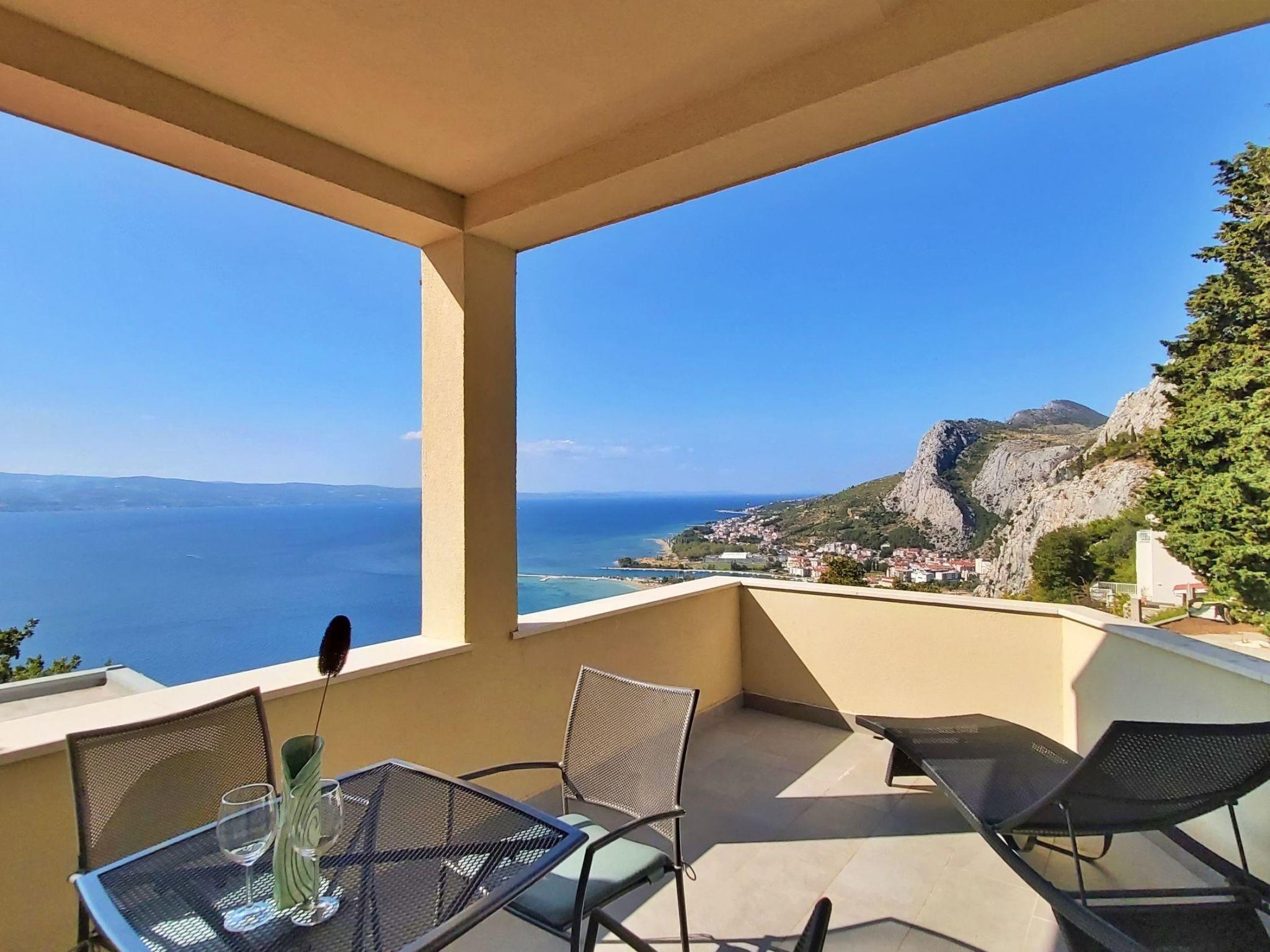 The apartment can accommodate up to 4 persons (2+2) and it’s layout features one bedroom with a double bed, a living room with a view of the sea, with an extendable couch for two extra sleeping possibilities. In addition, the apartment has a fully equipped kitchen (microwave, oven, refrigerator, pots, pans, cutlery etc. included) and a dining area and one bathroom.The apartment also features a beautiful, large balcony with a stunning view of the sea and Omis town and its surroundings. The balcony has outdoor furniture. Wi-Fi, SAT/TV and air-conditioning are available as additional amenities.