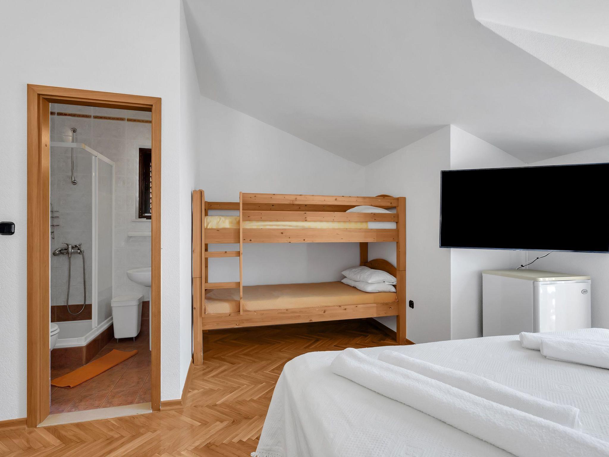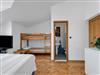 Inside, you will be spoilt with a comfortable box-spring bed (160 x 200 cm) and a robust solid wood bunk bed (90 x 200 cm). Other furnishings include a spacious wardrobe, two bedside cabinets, a coffee table with two wooden chairs, a flat-screen TV, an air conditioning unit and a fridge with freezer compartment. The private bathroom is directly accessible from the room and is equipped with a shower, a washbasin with hot and cold water supply and a WC.