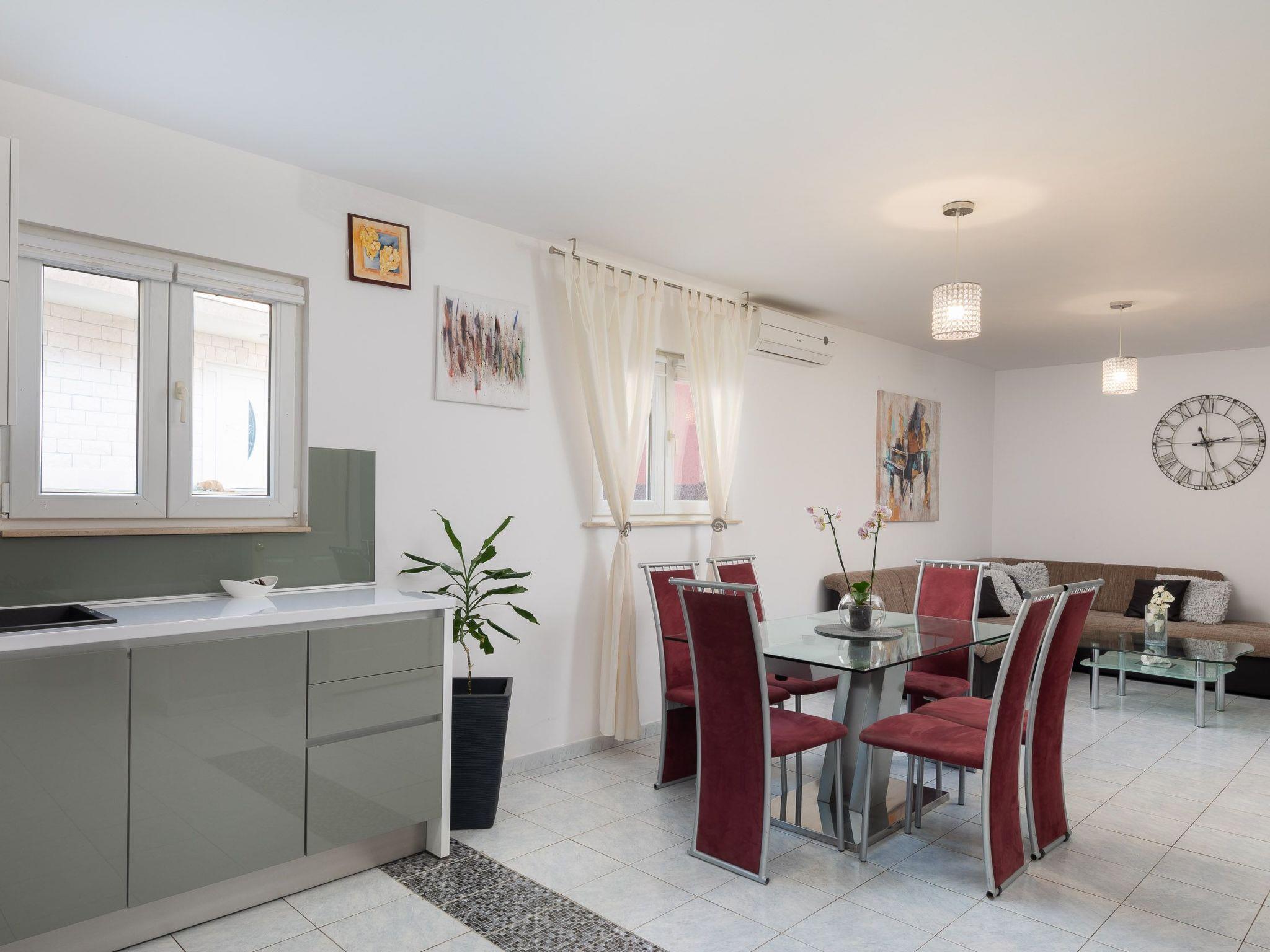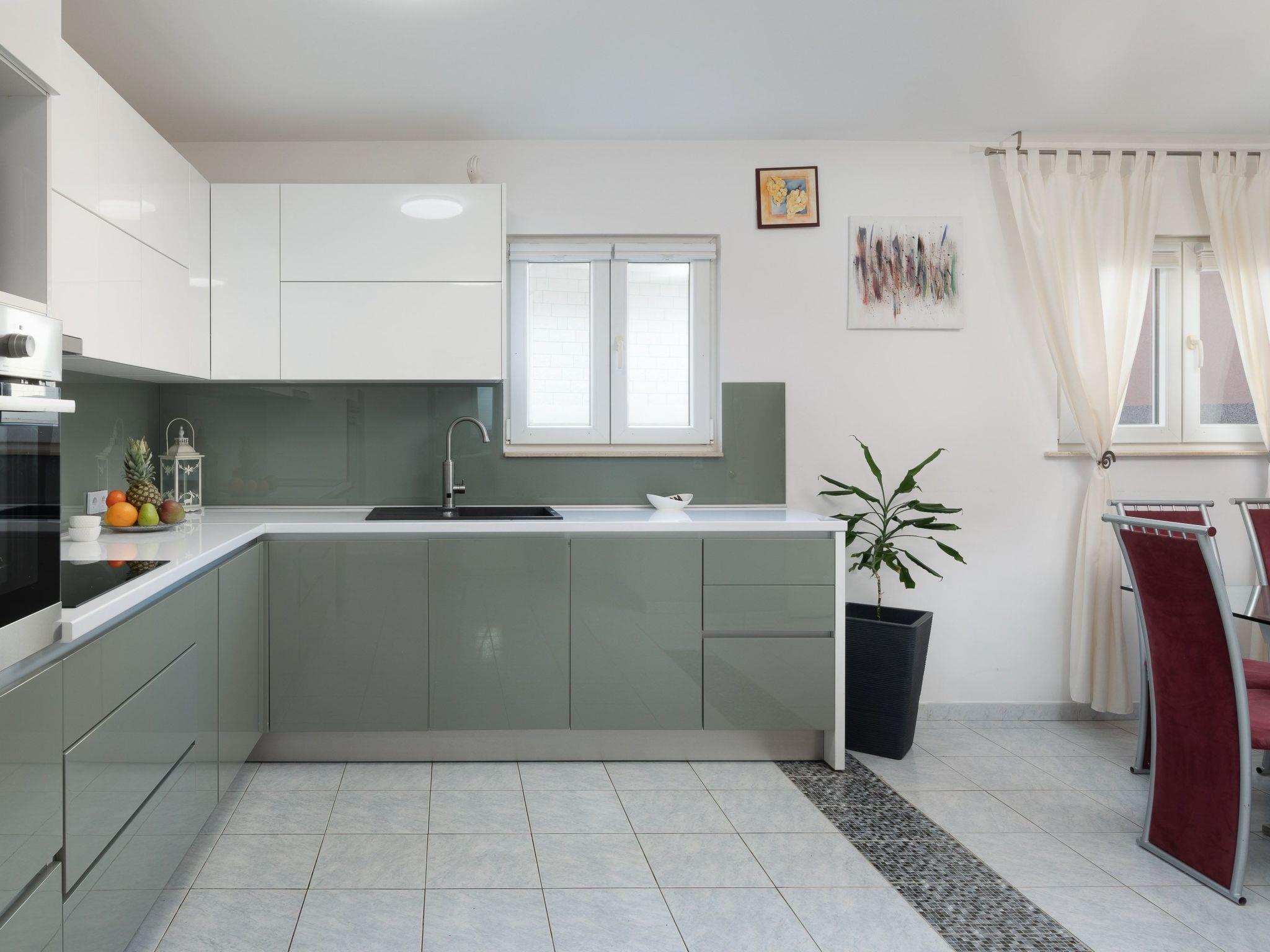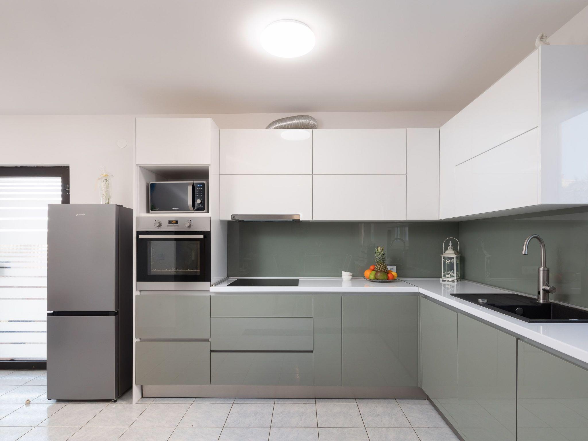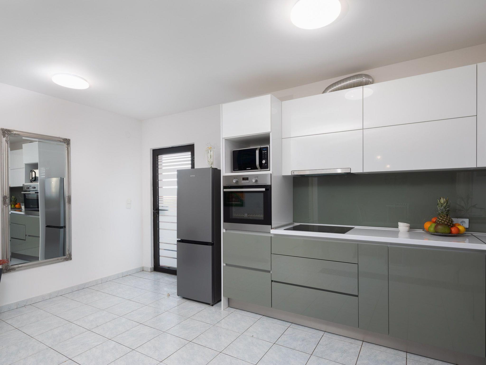 Ground floor of the house consists of three bedrooms with double beds, kitchen fully equipped with dishwasher, oven and stove top, fridge, coffee machine, electric kettle, microwave and dining area. Kitchen is connected with spacious living room with big sofa, TV and air conditioning. There is also one bathroom with walk in shower and washing machine.
