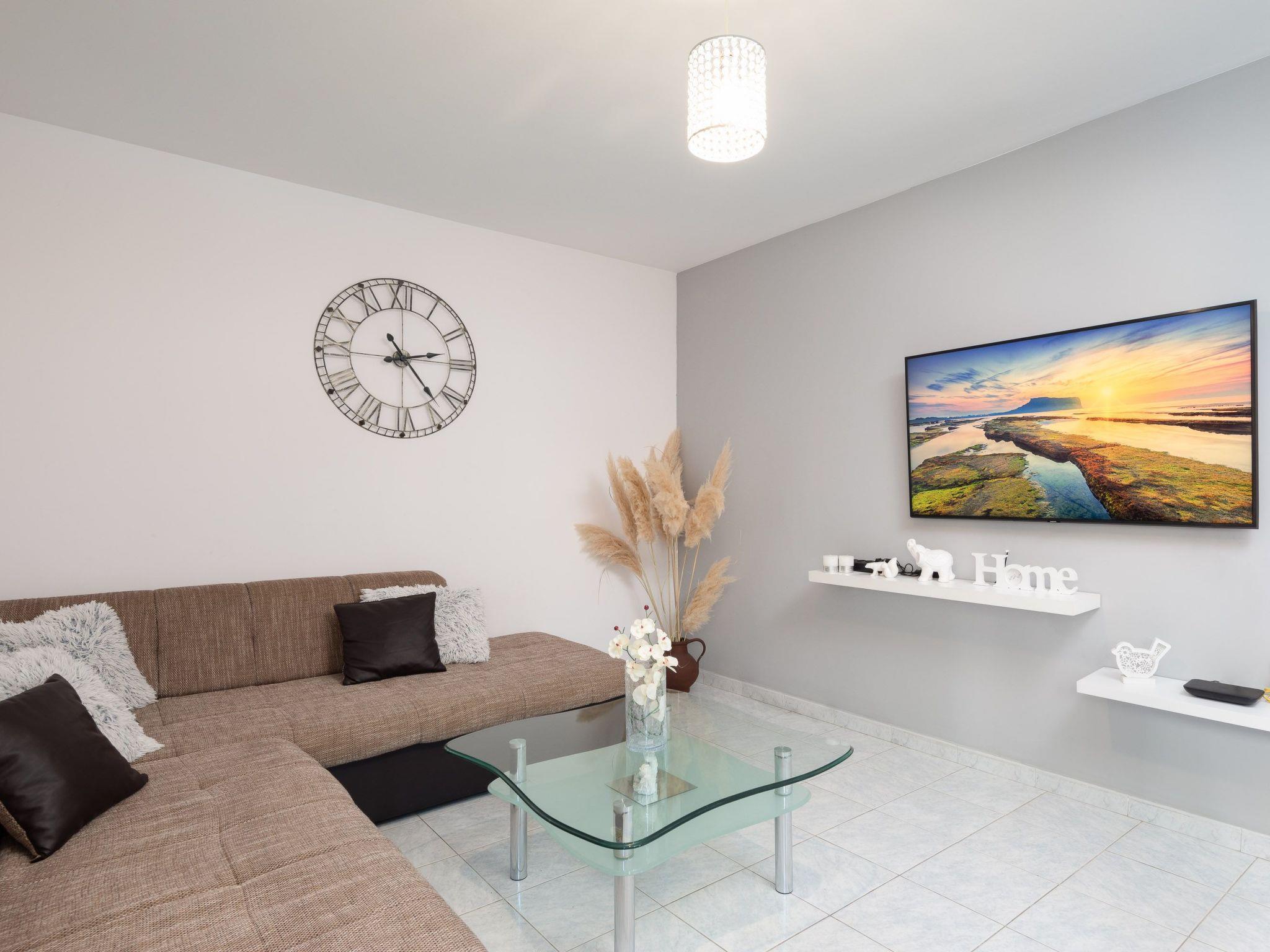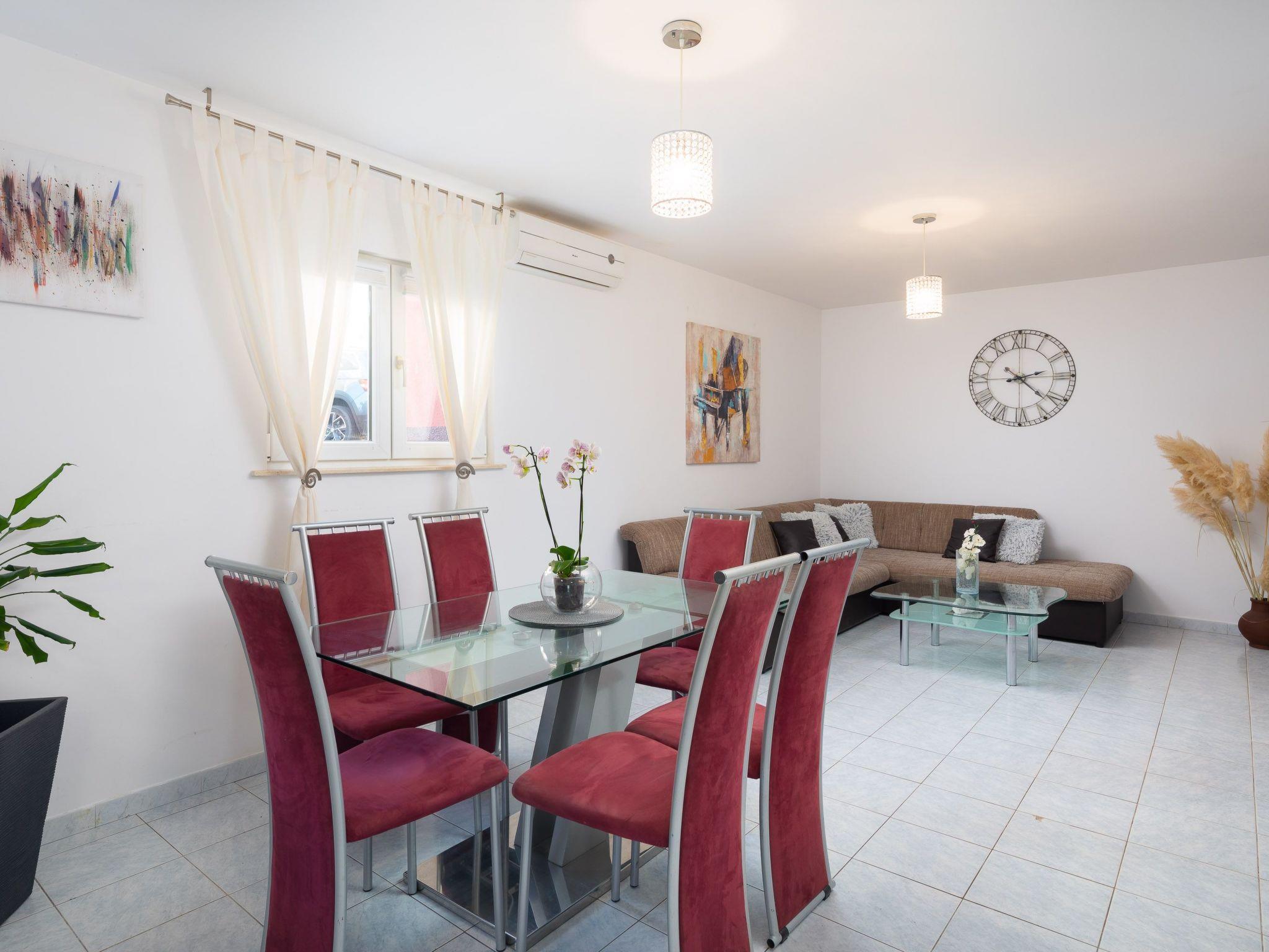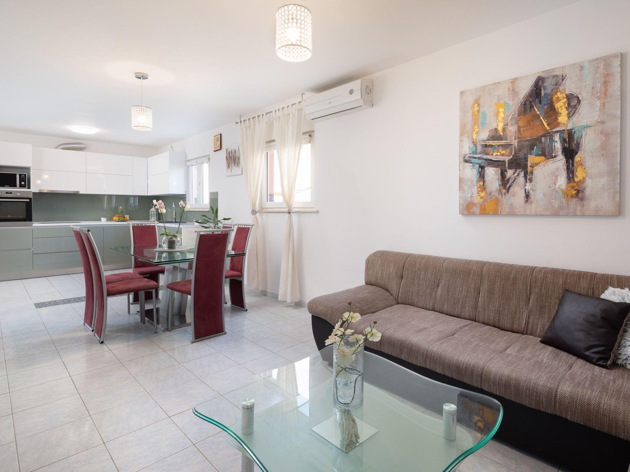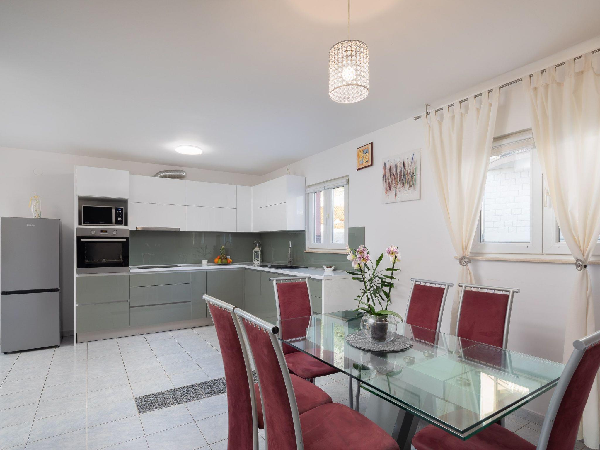Ground floor of the house consists of three bedrooms with double beds, kitchen fully equipped with dishwasher, oven and stove top, fridge, coffee machine, electric kettle, microwave and dining area. Kitchen is connected with spacious living room with big sofa, TV and air conditioning. There is also one bathroom with walk in shower and washing machine.