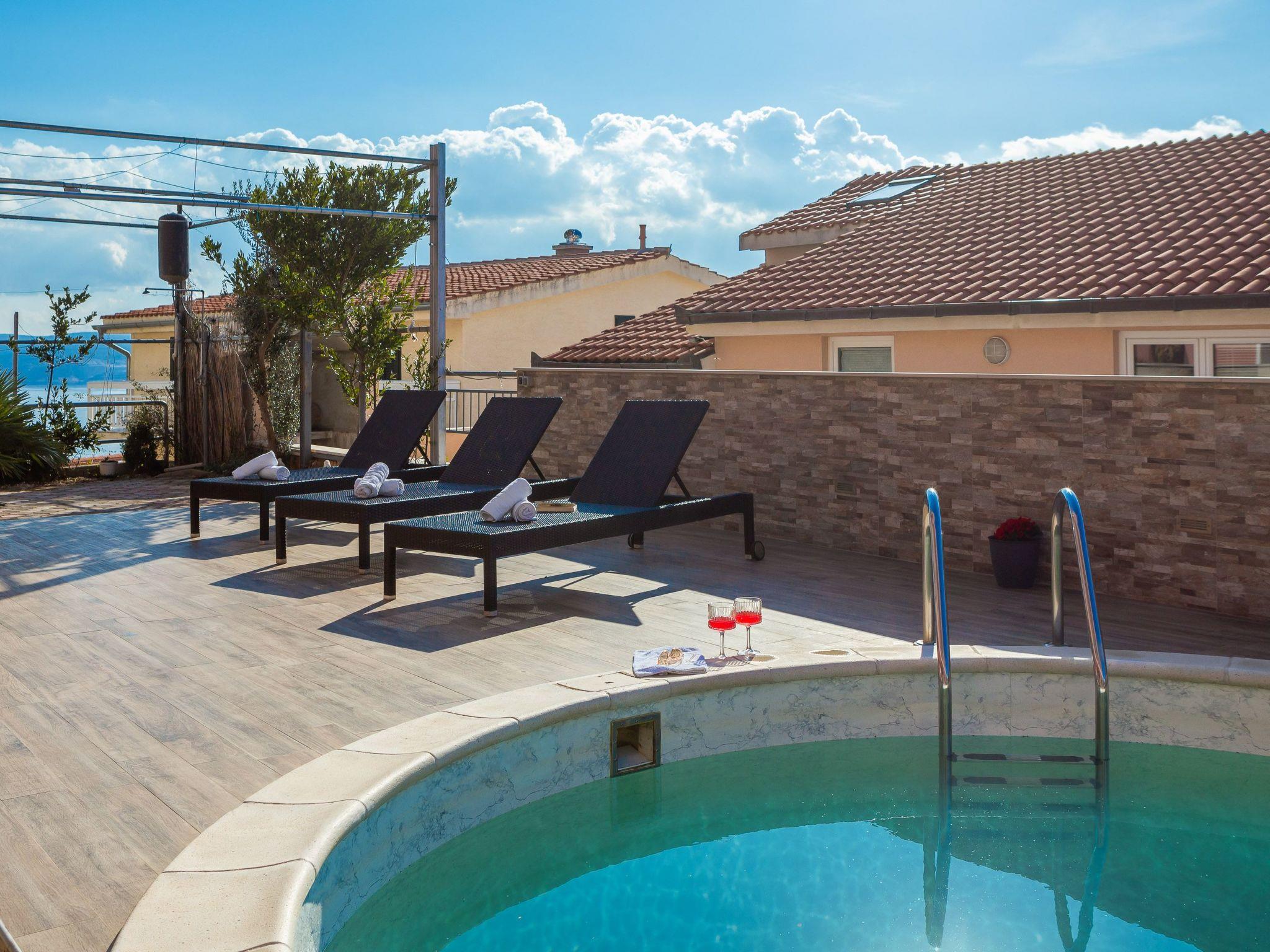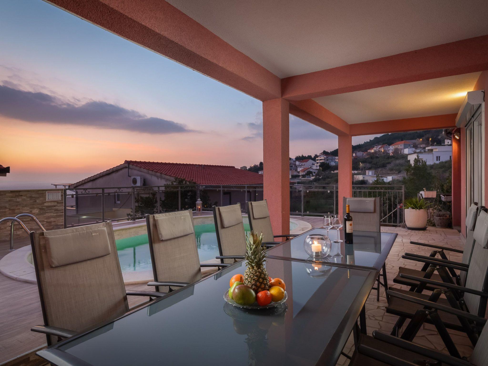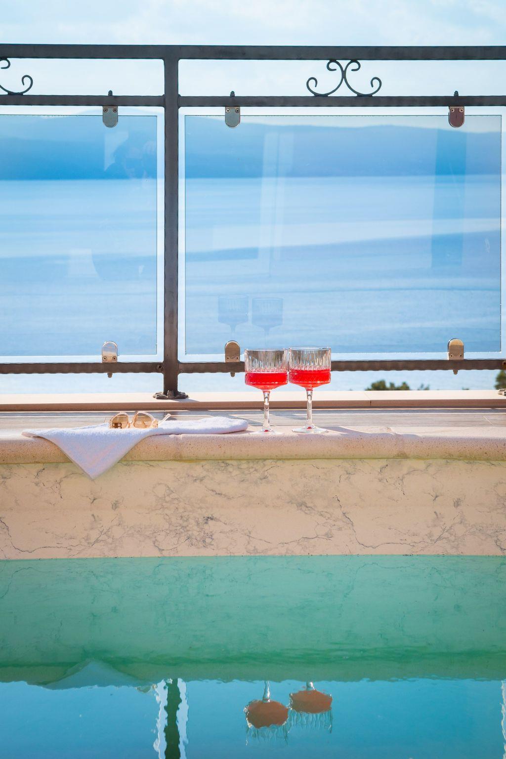 Outdoor area of the house has a beautiful sea view and consists of swimming pool, sunbathing area with sun beds, outdoor table and chairs and BBQ.