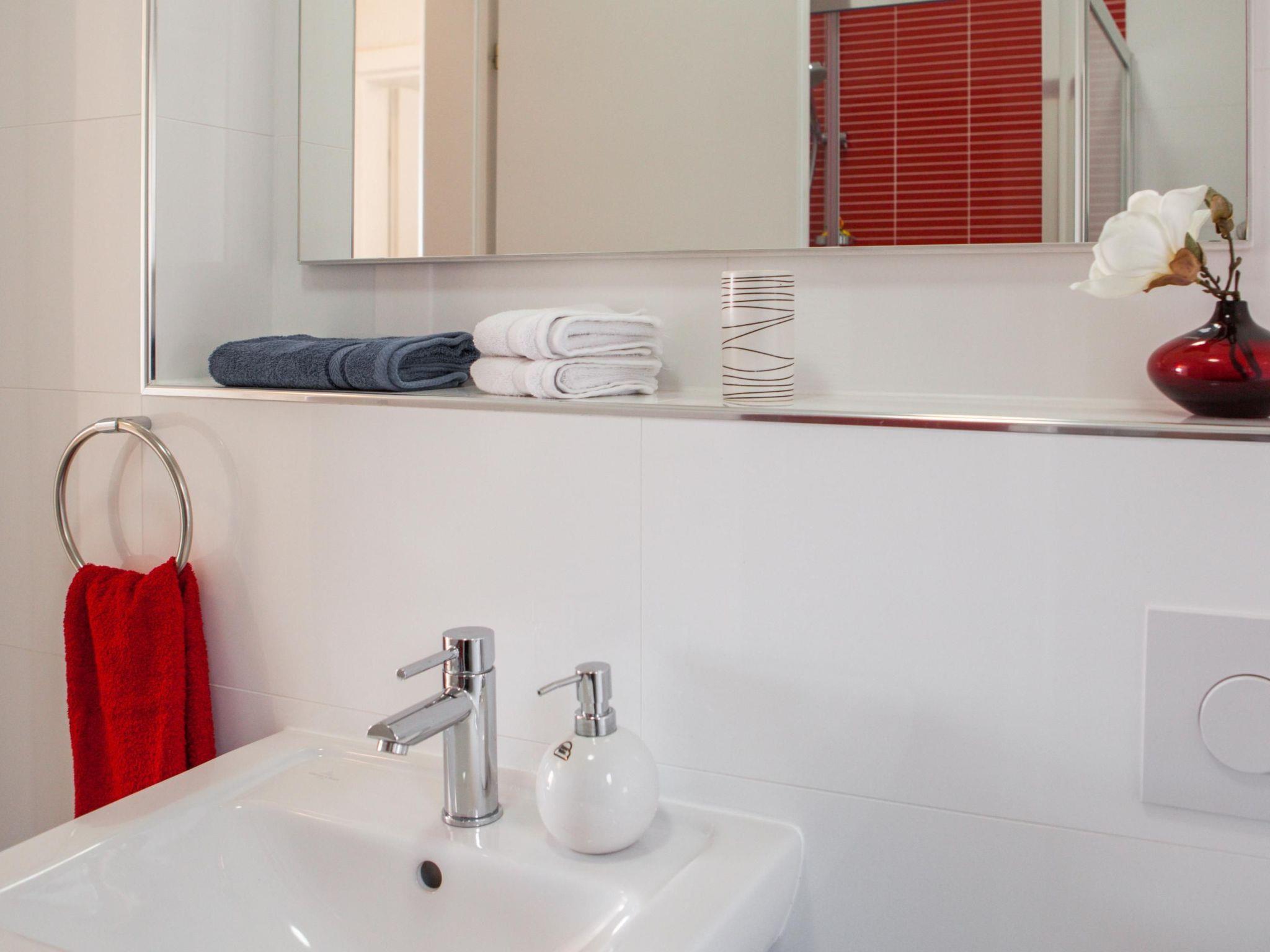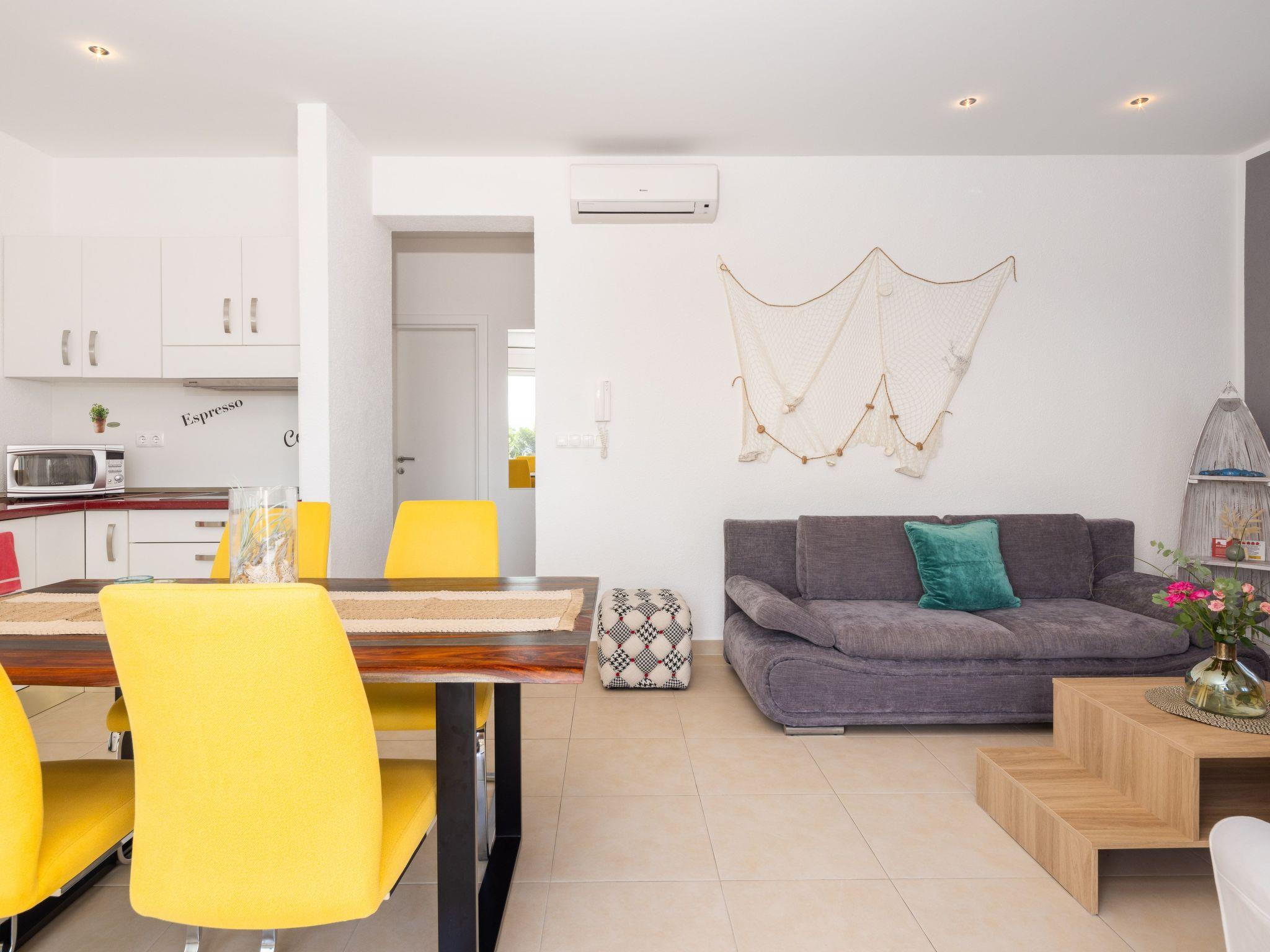 The interior of this holiday flat is air-conditioned, spacious and comfortably furnished and offers you all the modern comforts you need for a relaxing holiday. The fully equipped flat has a living and dining room with a sofa bed for two people, an armchair and a flat-screen satellite TV. There is also a kitchenette and a dining area with a dining table and chairs. The flat also has a bedroom with a double bed and a bathroom with a walk-in shower and WC.