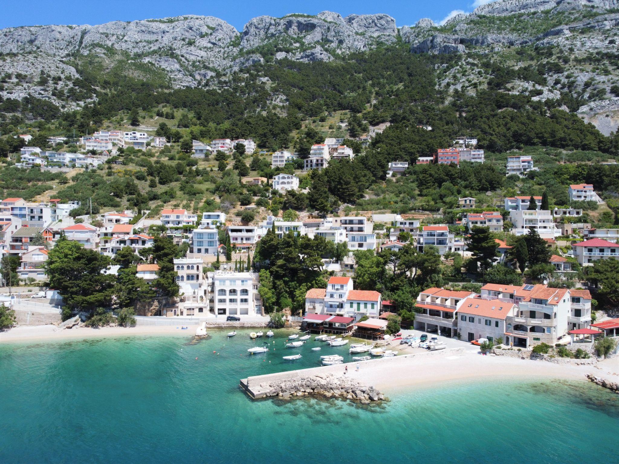 Pisak 16 km from Omiš: 2-family house "Mirela". 500 m from the centre of Pisak, in a quiet, sunny position on a slope, 50 m from the sea, 50 m from the beach. For shared use: property 500 m2 (fenced) with trees. In the house: internet access. Parking at the house on the premises. Shop 520 m, supermarket 19 km, restaurant, café 500 m, bus stop 1.6 km, pebble beach 500 m, rocky beach 50 m.