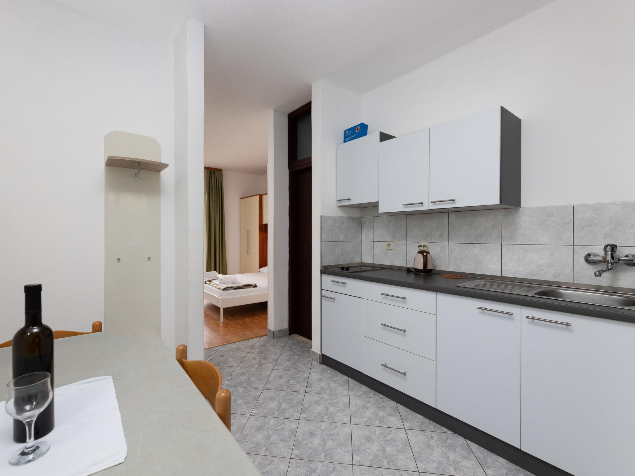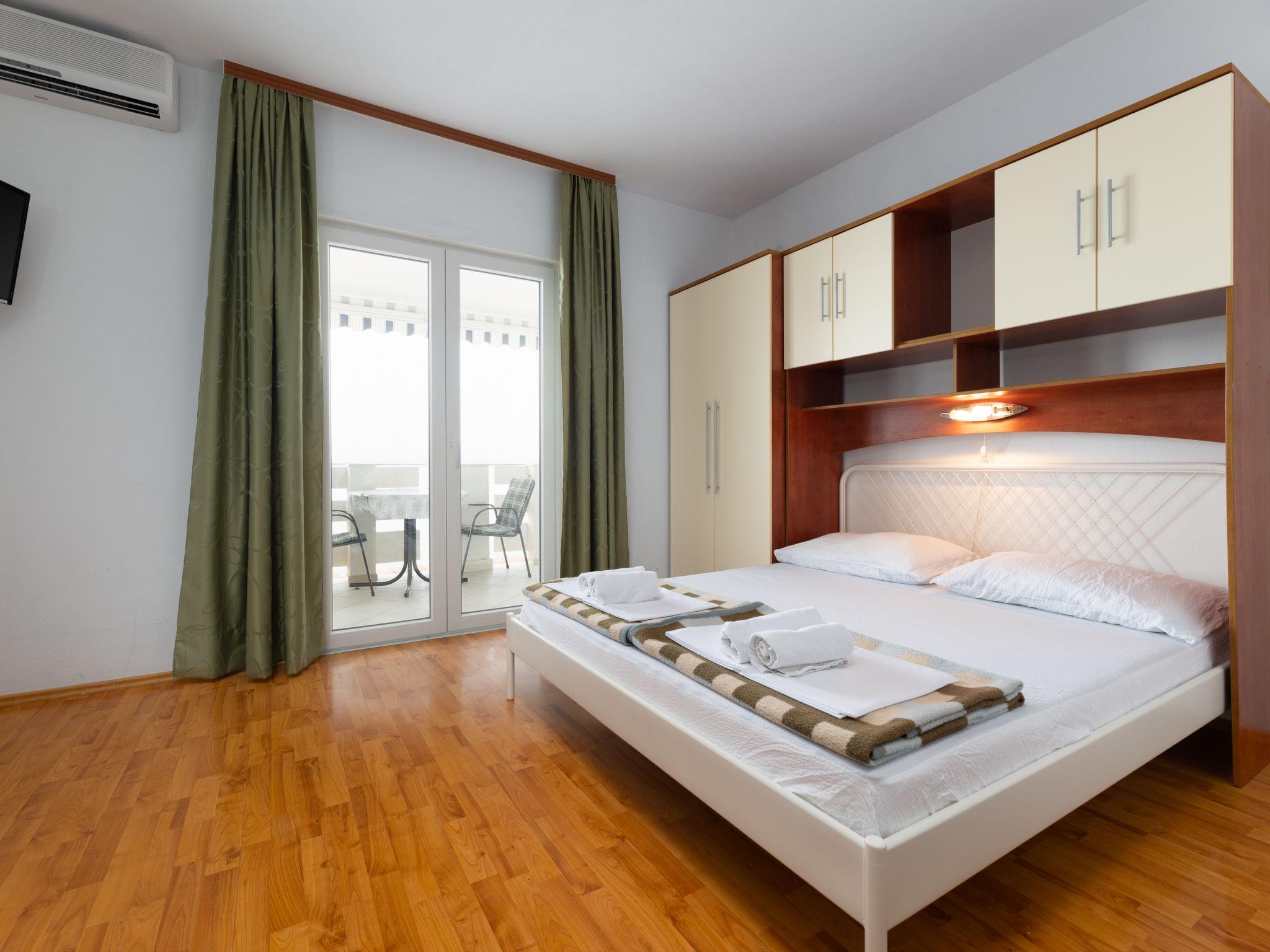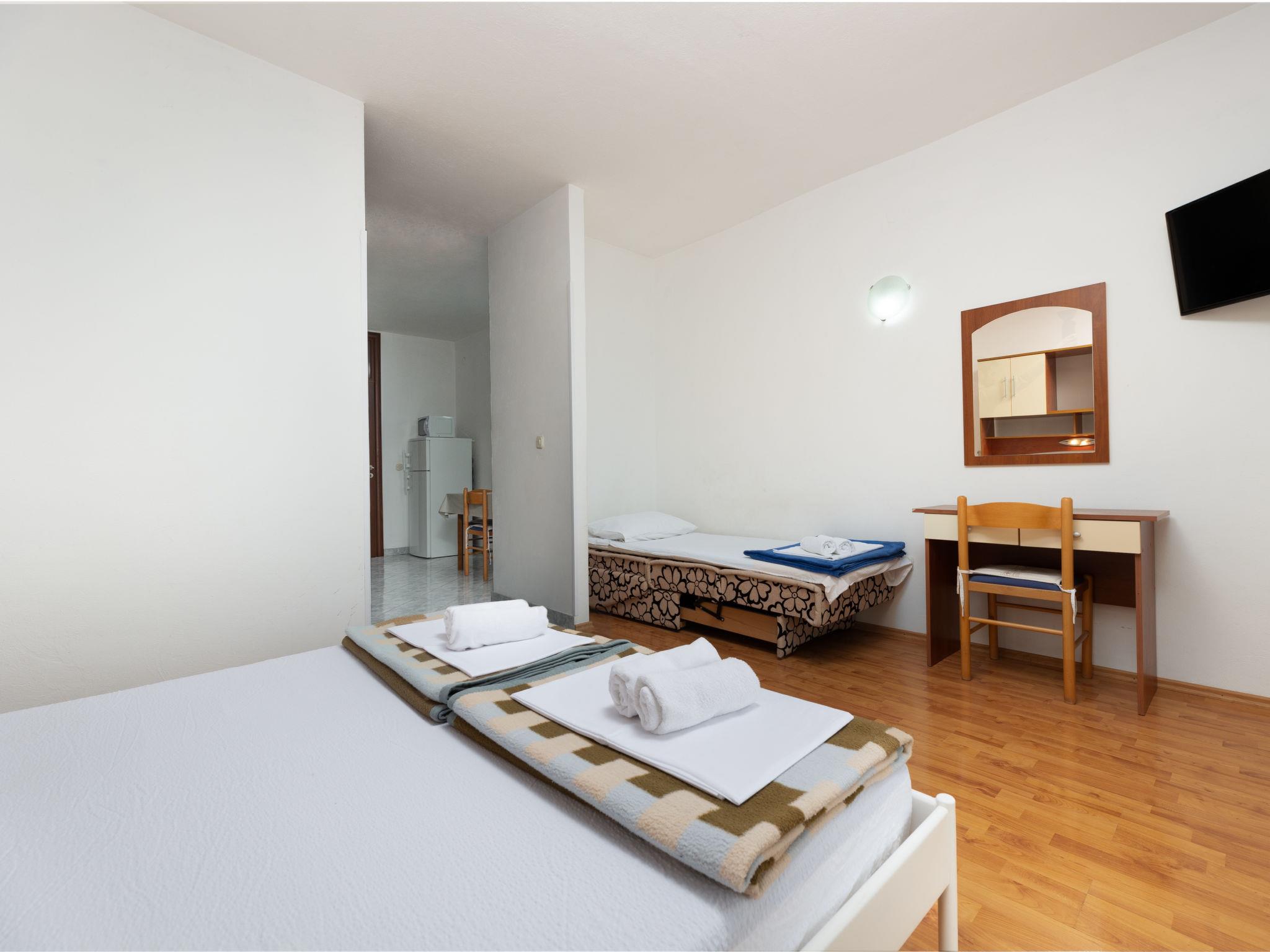 "A4", 1-room studio 22 m2 on 2nd floor, south facing position. Living/sleeping room with 1 sofabed (80 cm, length 200 cm), 1 french bed (180 cm, length 200 cm), satellite TV (flat screen), air conditioning. Exit to the terrace. Open kitchen (2 ceramic glass hob hotplates, microwave, freezer). Shower/WC. Terrace 8 m2, roofed. Balcony furniture. Marvellous view of the sea. Facilities: Internet (WiFi, free).