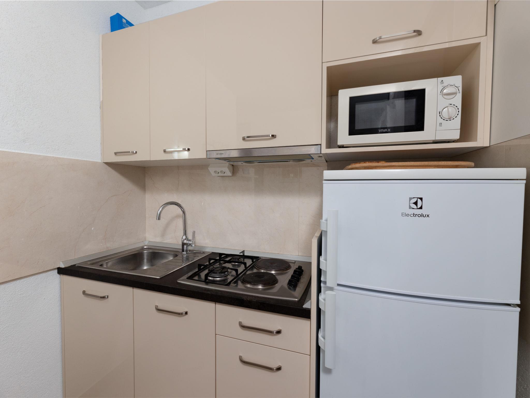"A1", 3-room apartment 33 m2 on 2nd floor, south facing position. 1 room with 2 beds (90 cm, length 200 cm). 1 room with 1 french bed (180 cm, length 200 cm), satellite TV (flat screen), air conditioning. Exit to the terrace. Kitchen (4 hot plates, microwave, freezer) with dining table. Shower/WC. Terrace 13 m2, roofed. Balcony furniture. Marvellous view of the sea. Facilities: Internet (WiFi, free).
