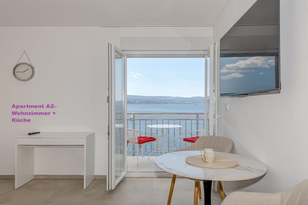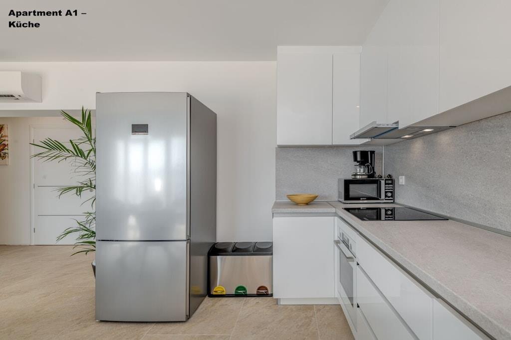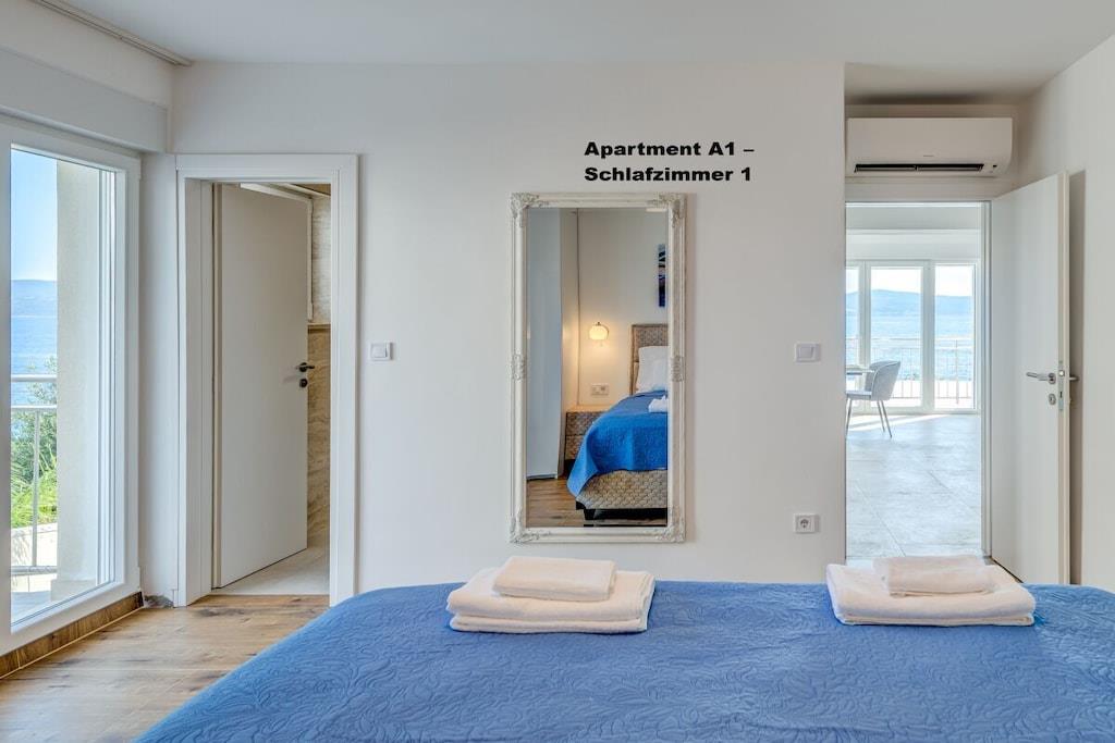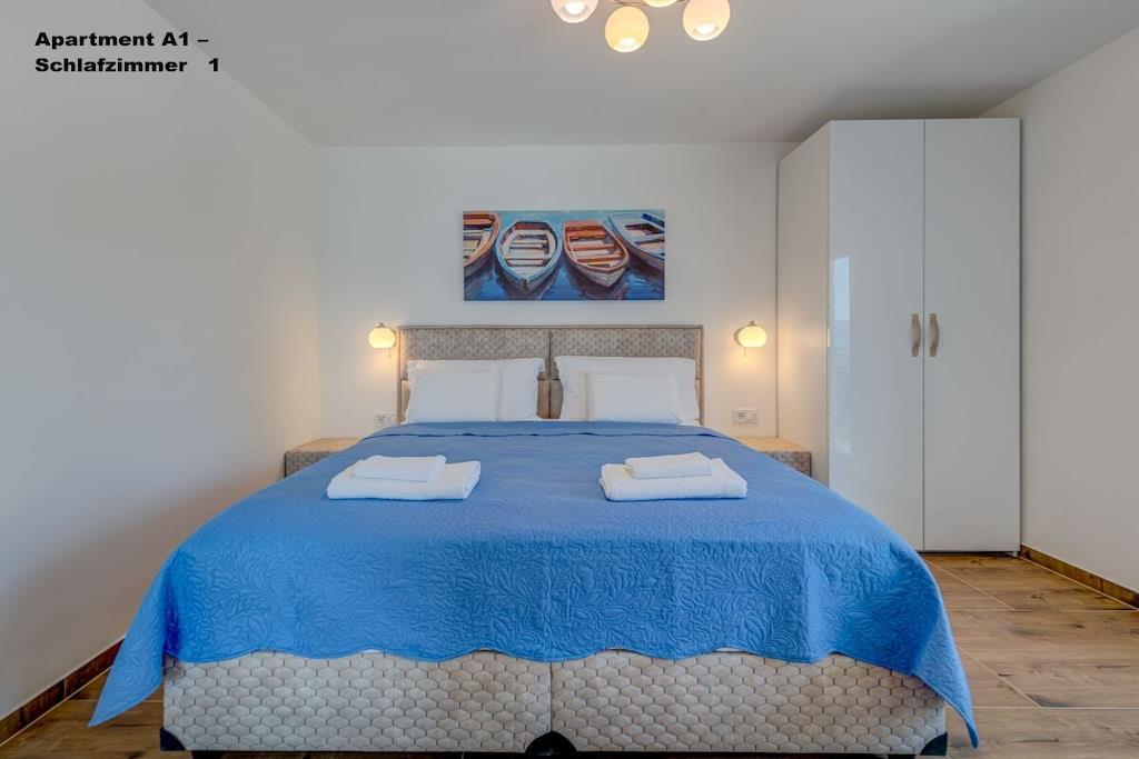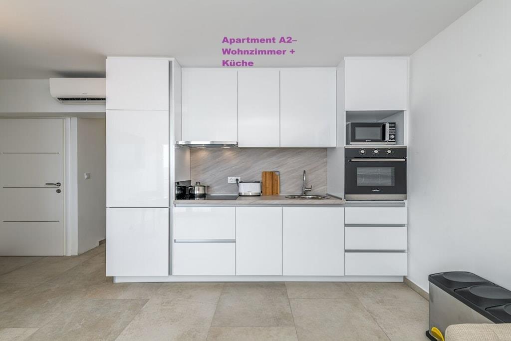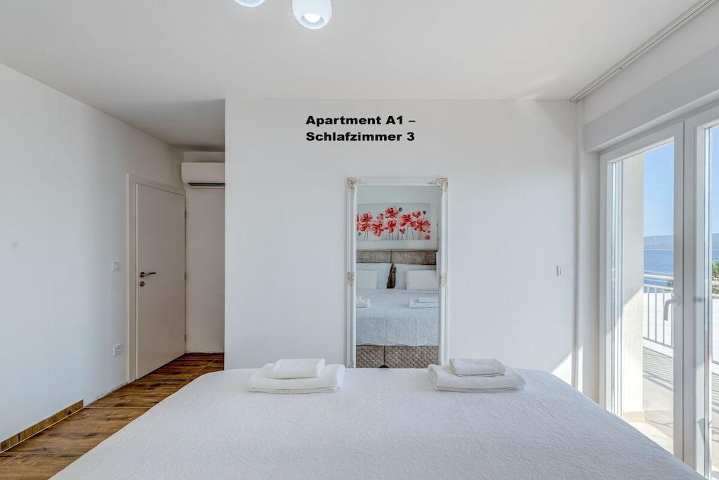 1. sal: 1 Lejlighed A6 til 6 personer, 100m² Pris uden for sæsonen: EURO260, juli og august: EURO360 pr. nat. 3 soveværelser, hver med eget badeværelse, toilet og aircondition. Stue med fuldt udstyret køkken inklusive opvaskemaskine, vaskemaskine osv. Smart TV Hvert værelse med privat balkon, havudsigt og aircondition. 2. sal: 1 Lejlighed A2 til 2 personer, 40m² Pris uden for sæsonen: EURO100, juli og august: EURO150 pr. nat. Fra 14. til 30. september 2025: EURO90 pr. nat. Separat soveværelse, 1 dobbeltseng, aircondition, balkon Stue med fuldt udstyret køkken inklusive opvaskemaskine, vaskemaskine osv. Smart TV Balkon med havudsigt 1x Lejlighed A4 til 4 personer Pris uden for sæsonen: EUR 180, sæson juli og august: EUR 250 pr. nat. 2 separate soveværelser, hver med en dobbeltseng, toilet, aircondition og balkon Stue med fuldt udstyret køkken inklusive opvaskemaskine, vaskemaskine osv. Smart TV 3. sal: 1x Lejlighed A2 til 2 personer Pris uden for sæsonen: EUR 100, sæson juli og august: EUR 150 pr. nat. Separat soveværelse med 1 dobbeltseng, aircondition, balkon Stue med fuldt udstyret køkken inklusive opvaskemaskine, vaskemaskine osv. Smart TV Balkon med havudsigt 1x Lejlighed A4 til 4 personer Pris uden for sæsonen: EUR 180, sæson juli og august: EUR 250 pr. nat. 2 separate soveværelser, hver med egen dobbeltseng, toilet, aircondition og balkon. Stue med fuldt udstyret køkken inklusive opvaskemaskine, vaskemaskine osv. Smart TV