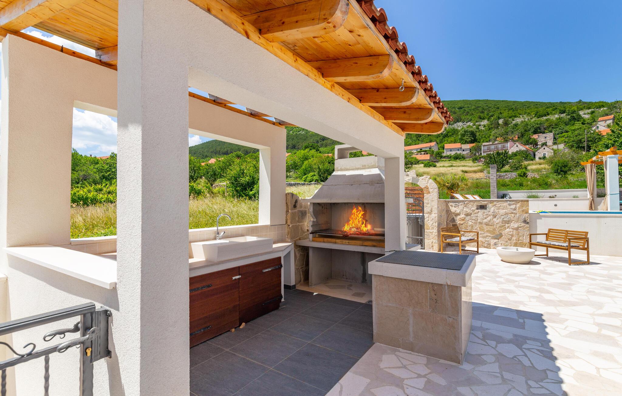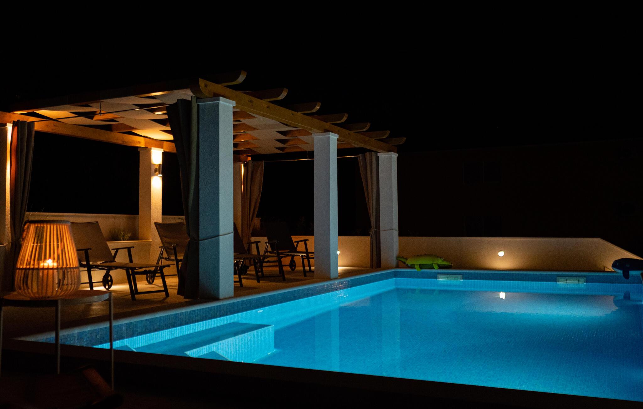 Det fantastiske udendørsområde er perfekt til at nyde det vidunderlige klima fuldt ud. Komfortable havemøbler lægger op til at spise og lade batterierne op under åben himmel. Snup en frisk dukkert til hjertens lyst i poolen, forkæl jer selv med en drink i den hyggelige lounge, og flyd væk på varme sommernætter i den stemningsfuldt oplyste pool.