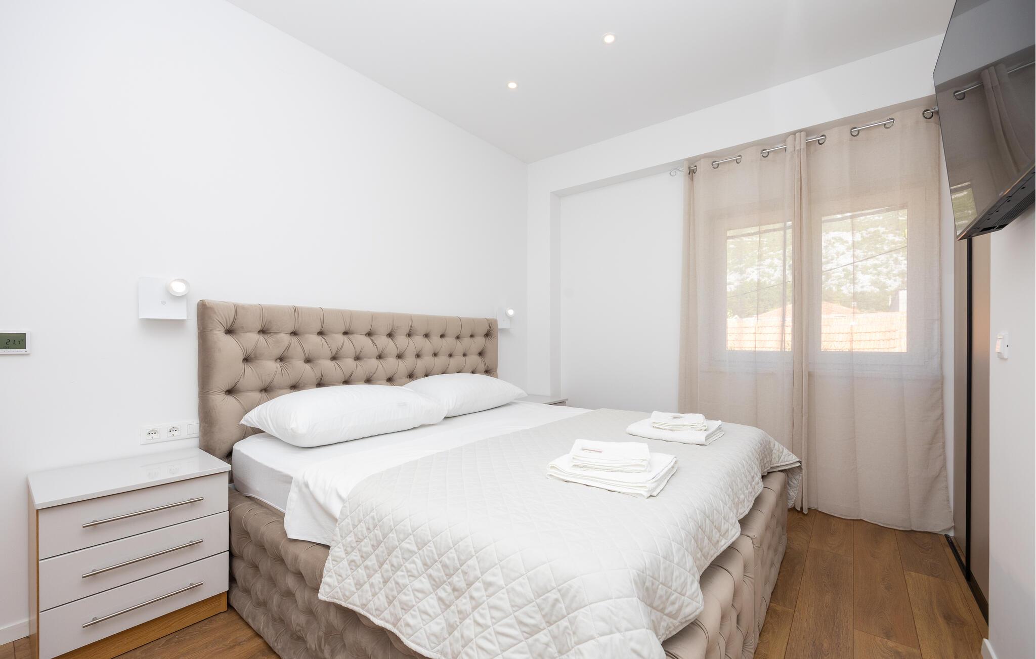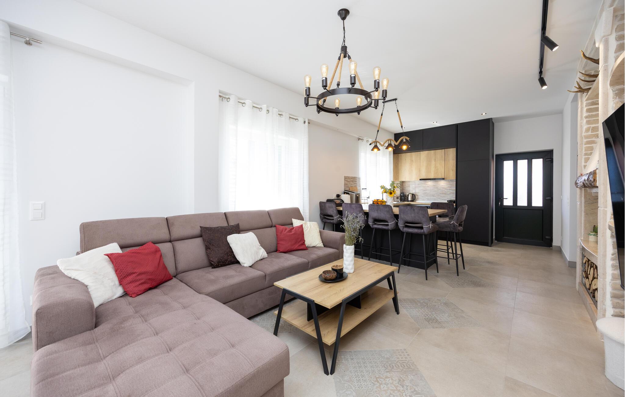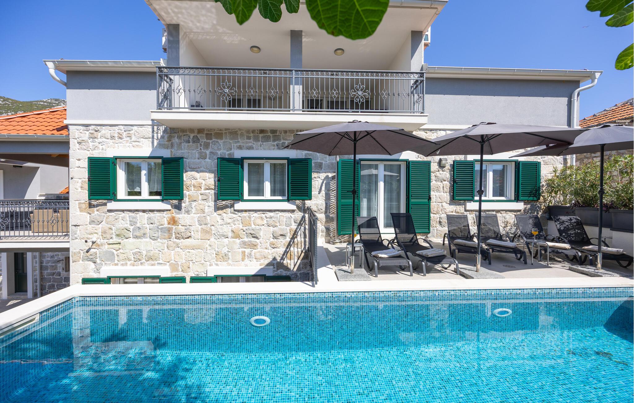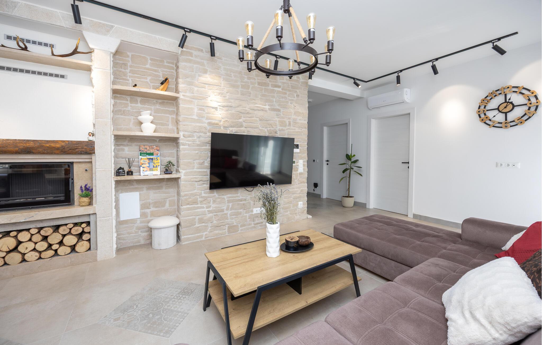 Oplev uforglemmelige ferier i dette luksuriøse feriehus med pool og spabad. Dette indbydende hus kombinerer moderne elegance og rustikke elementer på perfekt vis. Naturstenslook i stuerne, stilfulde møbler og pejs skaber en harmonisk atmosfære, hvor I hurtigt kan genoplade batterierne. Slap af med en kop kaffe eller et hjemmelavet måltid med et glas vin. Hvis I har lyst til motion, er der træningsmaskiner i fitnessrummet. Gå ud på terrassen ved de første solstråler og nyd den vidunderlige udsigt over de grønne, skovklædte bakker. Nyd en god morgenmad og fordyb jer derefter i en god bog. Svøm et par afslappende baner i poolen eller slap af i spabadet. Mød jer til en grillfest om aftenen og afslut dagen i en afslappet atmosfære. Tilbring afslappende timer på strandene ved Omiš Riviera, som er ideelle til svømning, solbadning og snorkling. Udforsk byen Omiš, hvor historiske gader, Cetina-flodens udmunding og det nærliggende hav smelter sammen til en unik atmosfære. Tag på vandretur gennem det omkringliggende bjerglandskab omkring Ostrvica og nyd en storslået udsigt. De, der leder efter noget mere aktivt, kan prøve rafting på Cetina-floden eller deltage i en klatretur.