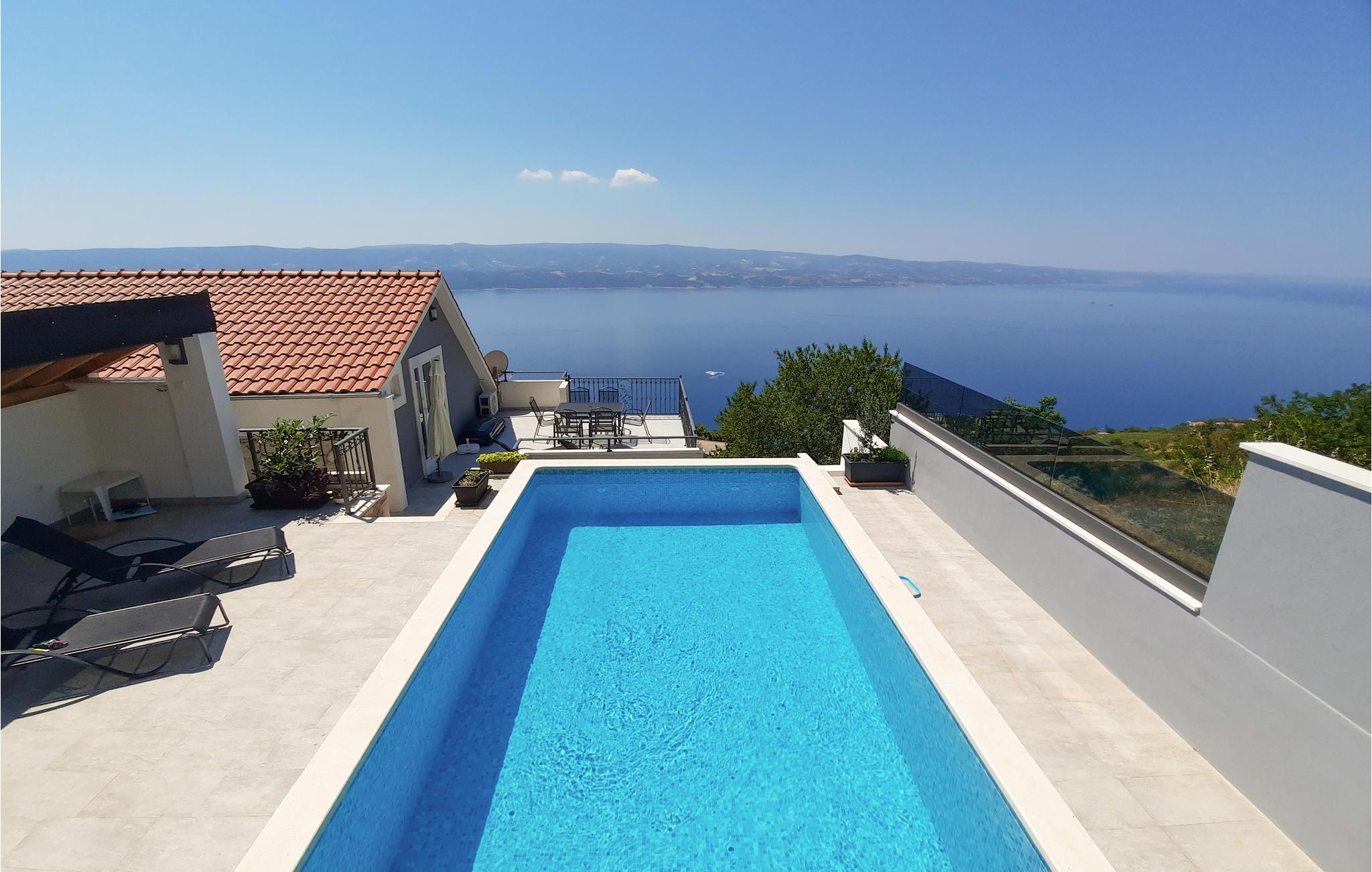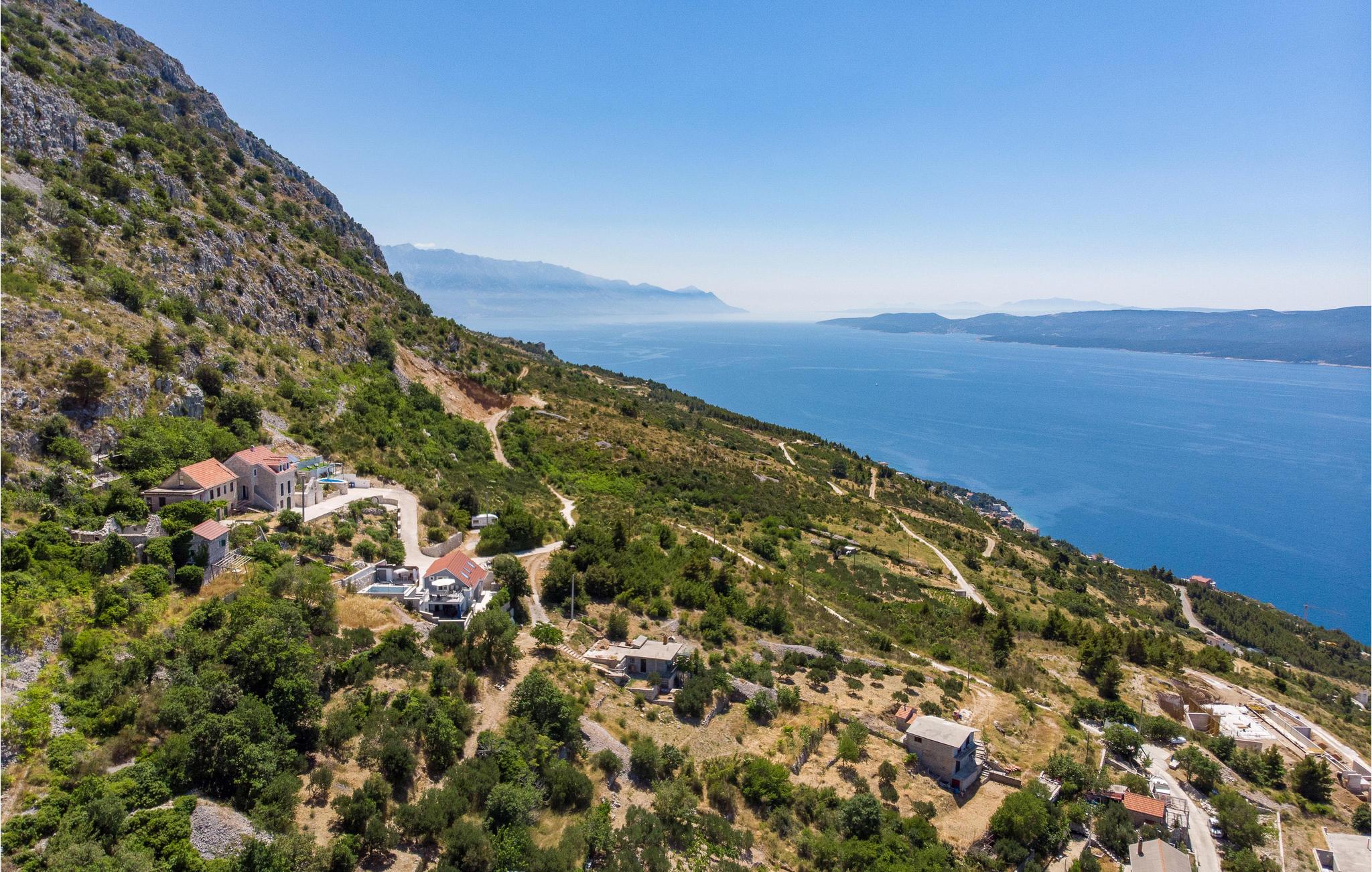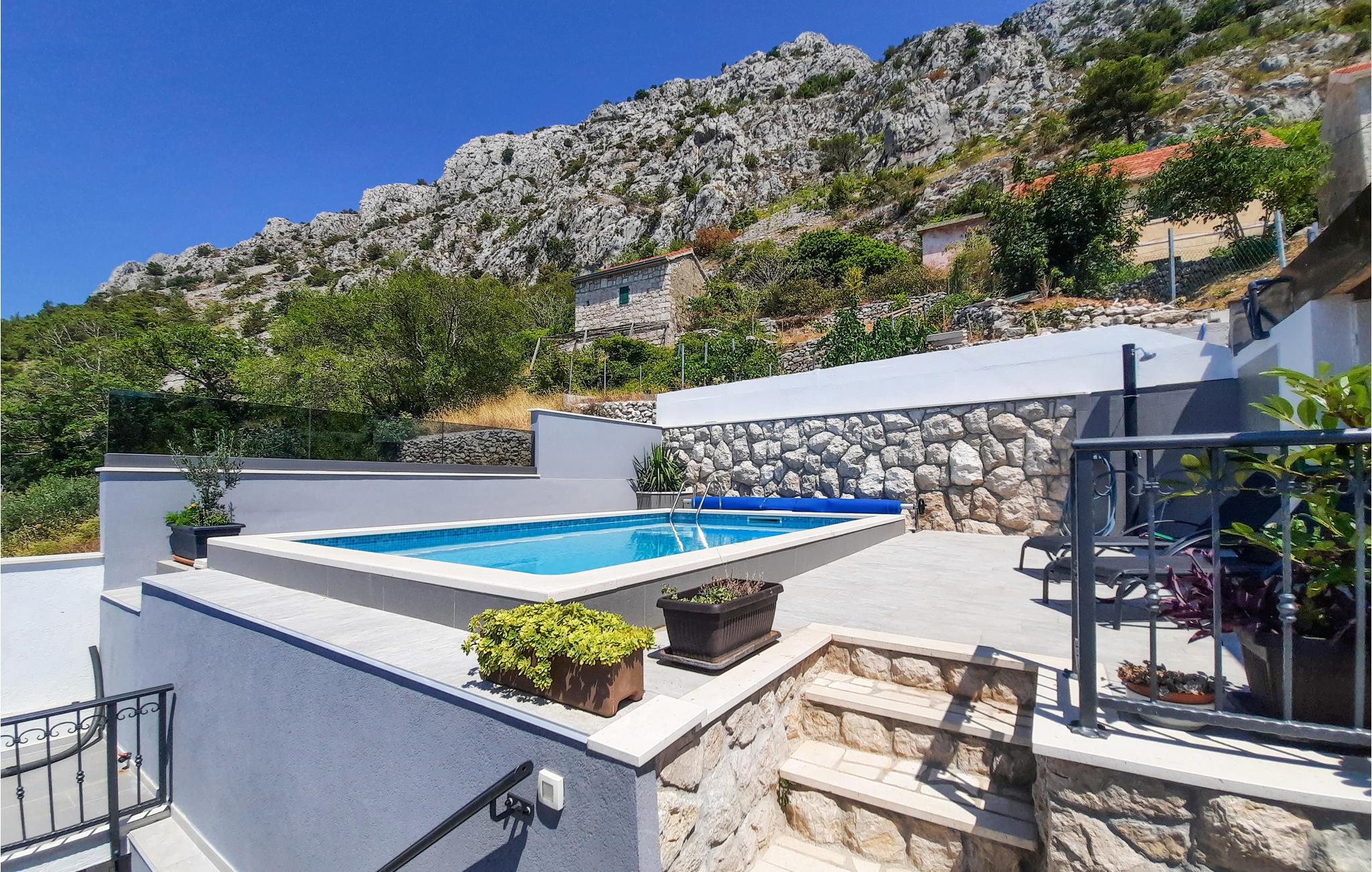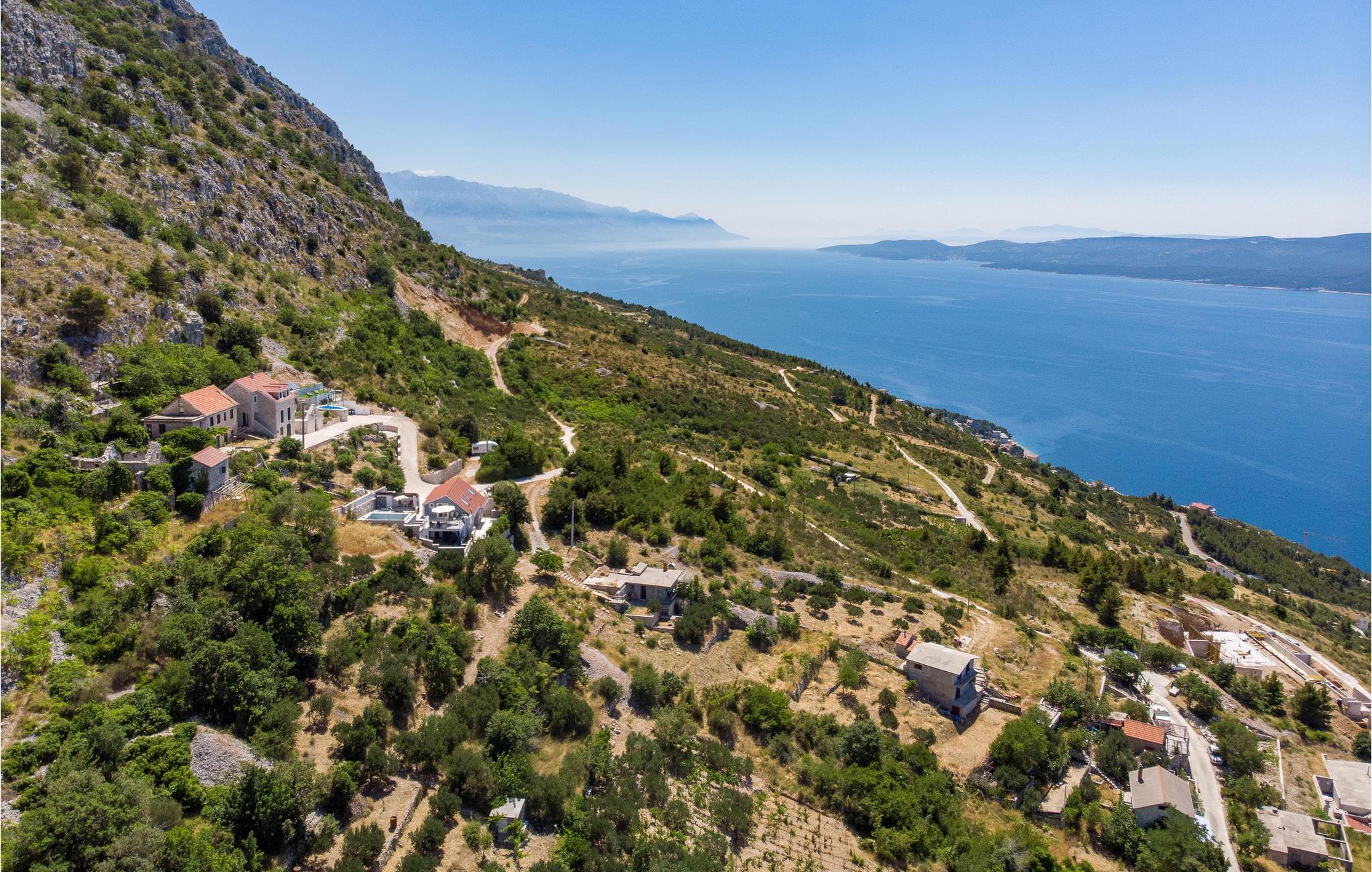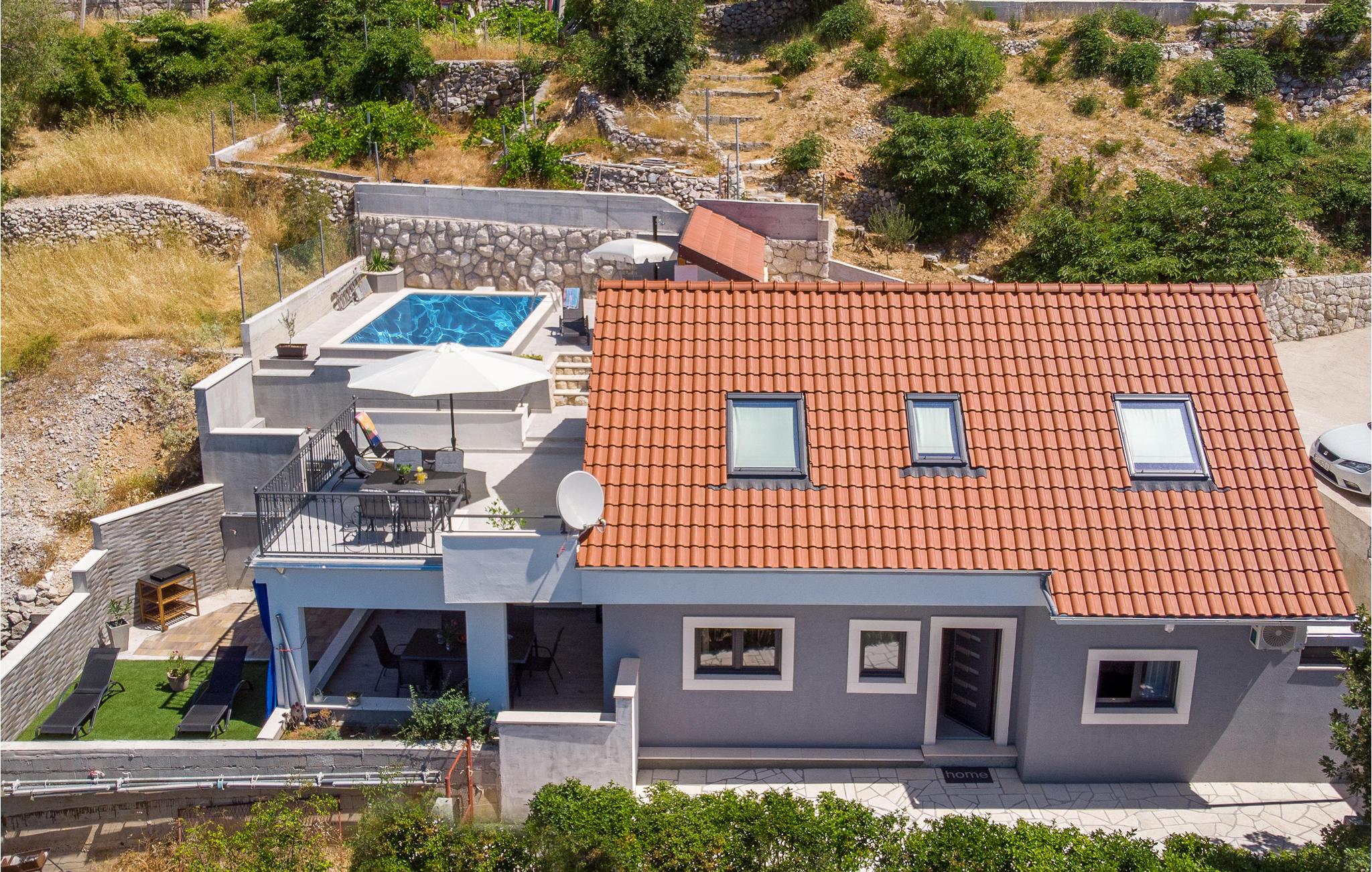 en smuk beliggenhed, i et kuperet terræn ved foden af bjerget, byder dette smukke hus velkommen med en swimmingpool og en vidunderlig panoramaudsigt over havet. Velkommen til dette skønne feriehus i landsbyen Stanici, som I kan nå via smalle og snoede veje. I jeres personlige oase af ro kan I finde jer godt tilpas på de to etager og få adgang til de to etager via indvendige og udvendige trapper. Møblerne er komfortable, lyse og venlige og tilbyder jer de perfekte rammer til at føle jer godt tilpas. Nyd flere terrasser, hvor I kan sidde, læse en bog eller grille og spise om aftenen. Hop i poolen og tag derefter solbad. Aftenerne runder jeres feriedag af med uforglemmelige solnedgange og et glas vin. De nærliggende stenstrande anses for at være de smukkeste på Rivieraen, og den maleriske piratby Omis ligger ved mundingen af Cetina-floden, hvis kløfter giver mulighed for adskillige adrenalinsportsgrene såsom rafting, vandreture, klatring, canyoning, paragliding og meget mere . Tag et dykkerkursus og oplev den smukke undervandsverden, eller lej en båd for at udforske området fra vandoverfladen. Det er lige meget om det er ren afslapning eller varierede aktiviteter. Enhver ferierejsendes hjerte vil med garanti slå hurtigere her.