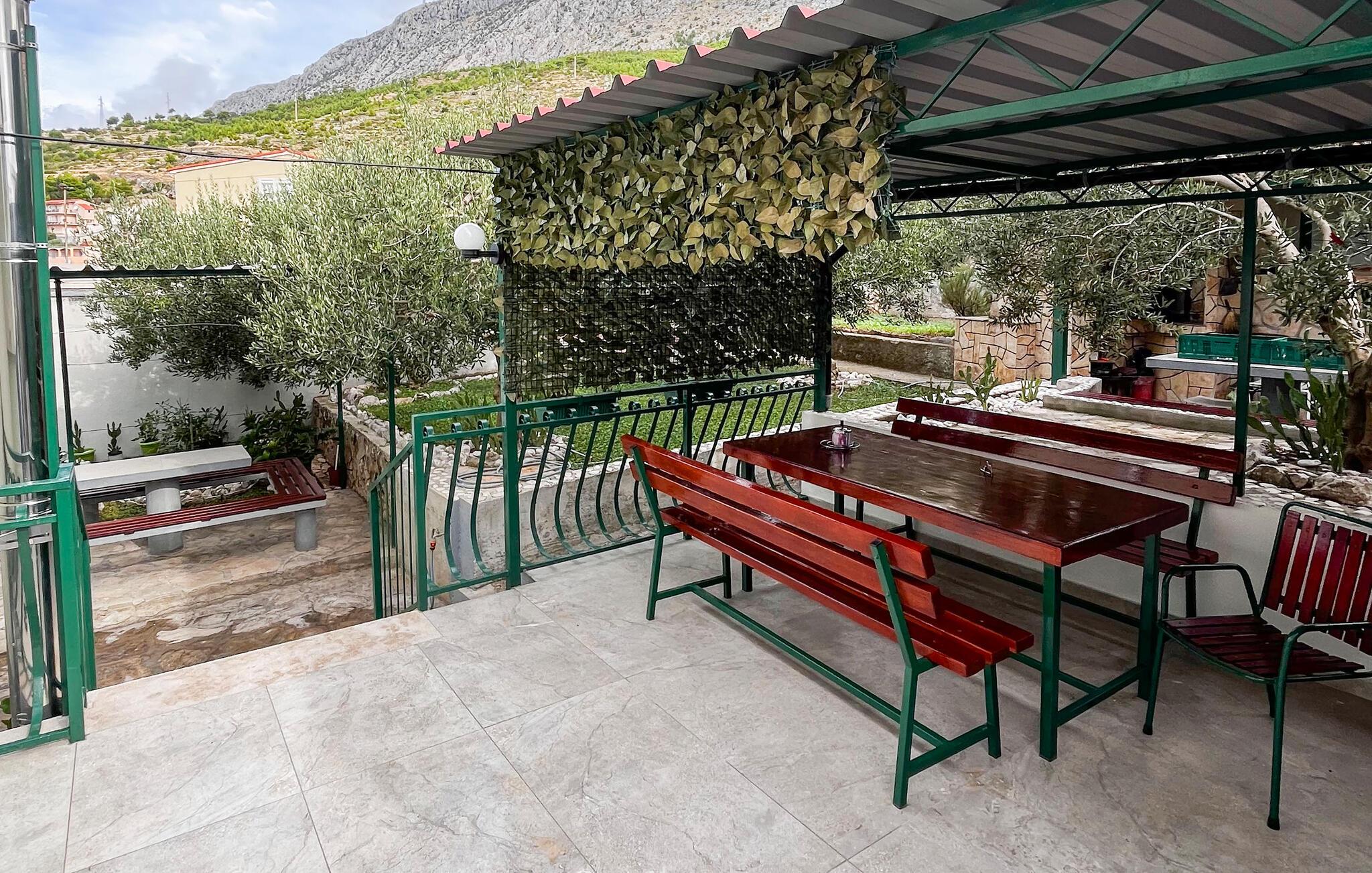 Træd ud på den overdækkede balkon og nyd den storslåede udsigt over hustagene til det glitrende hav. Nyd jeres morgenkaffe i den blide havbrise eller afslut dagen med et glas vin. I finder skyggefulde steder i den kærligt anlagte have med oliventræer og stenmure. Benyt jer af terrassen med siddepladser og murstensgrill til hyggelige timer udendørs.