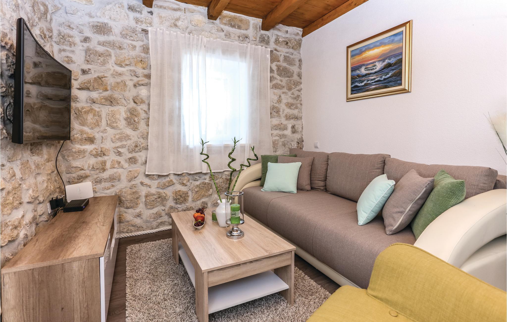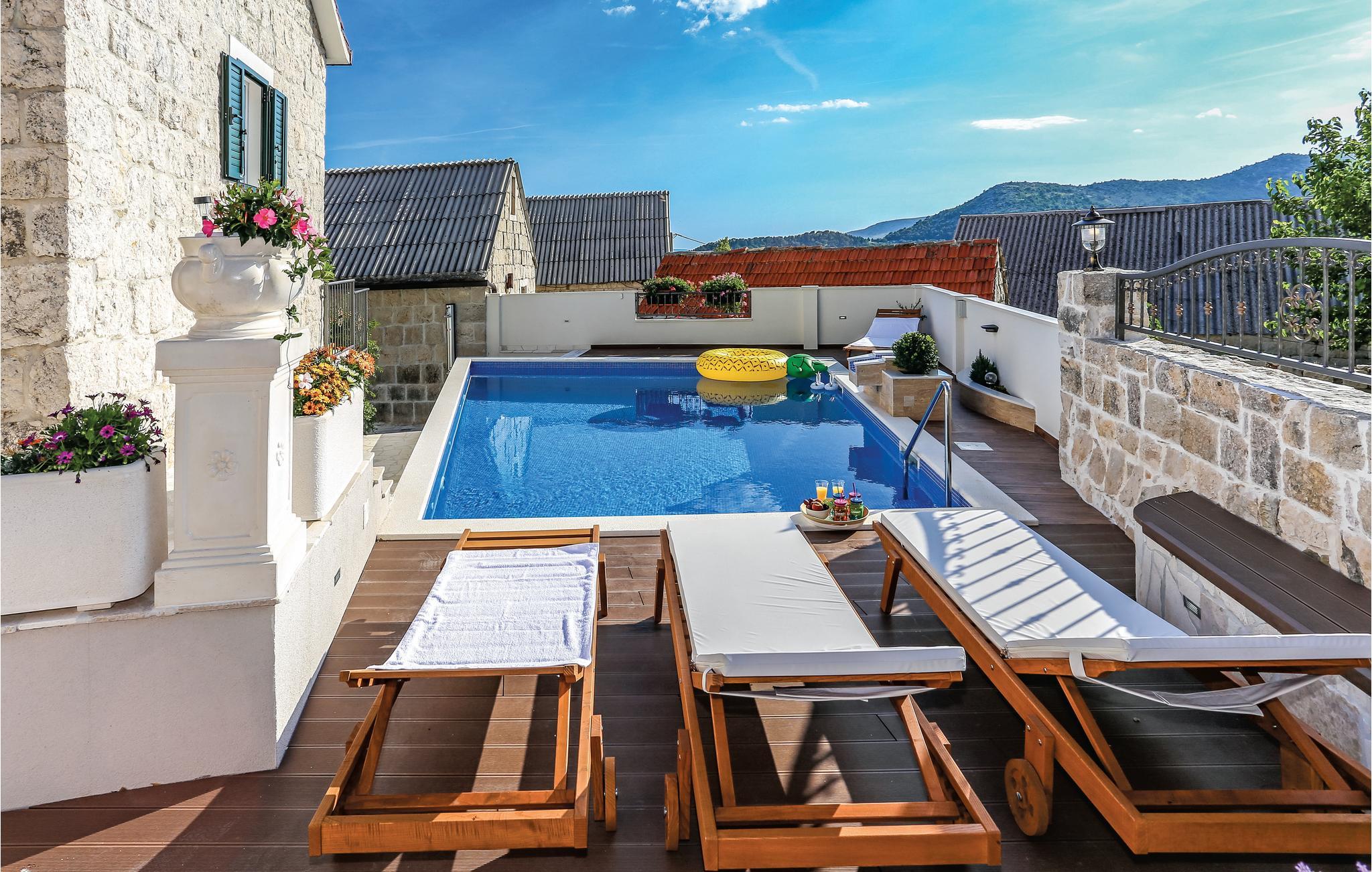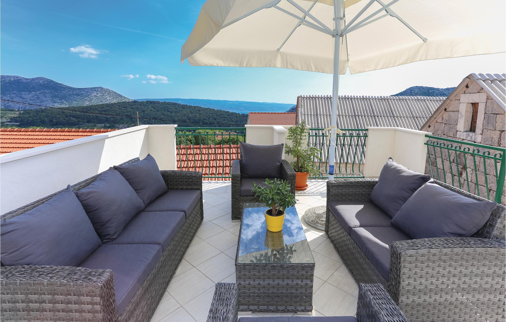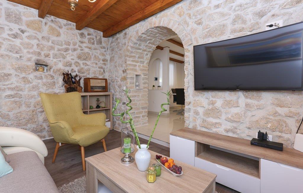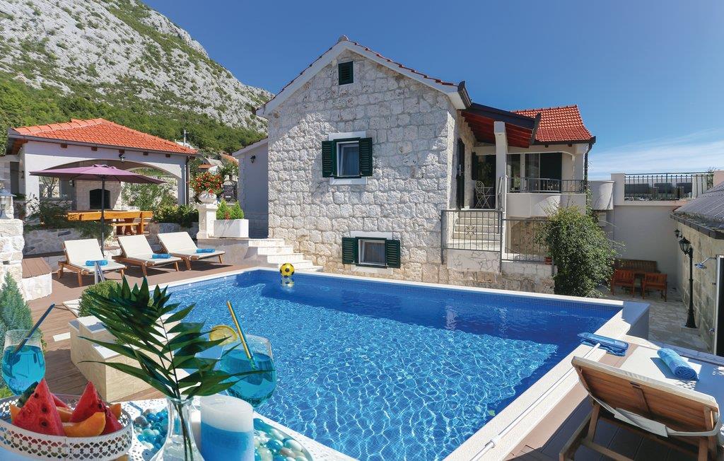 Skønt gennemrenoveret hus af sten, der ligger i landsbyen Gata, for foden af bjerget Mosor, med en betagende udsigt over det smukke landskab i Omis bagland. Huset er fordelt på to etager, som er forbundet via udendørs trappe – i stueplan er der en lille enkel lejlighed med et soveværelse, på første sal er der en mere komfortabel lejlighed med to soveværelser. I haven dominerer den dejlige swimmingpool, som I kan hoppe i lige så tit og lige når I har lyst. Der er også en konoba med en grill, hvor I kan slappe af med et godt glas vin, mens maden bliver færdig over gløderne. I bor ikke lagt fra en vandresti og mange aktivitetsmuligheder: I kan cykle, rafte og zip-line over Cetinafloden og gå lange ture. For længe siden var Gata den vigtigste by I Poljicka republikken, så besøg museet og se de mange velbevarede eksempler fra den spændende tid i byens historie.