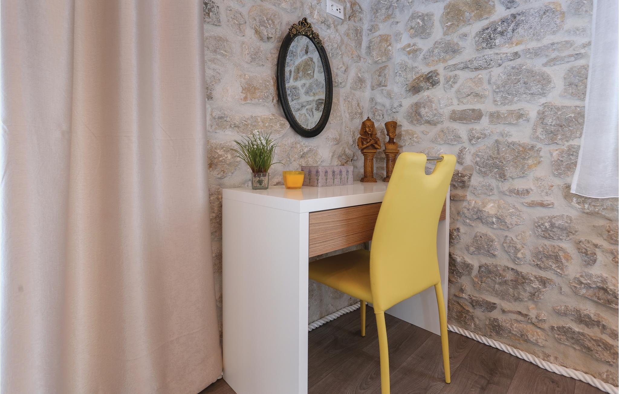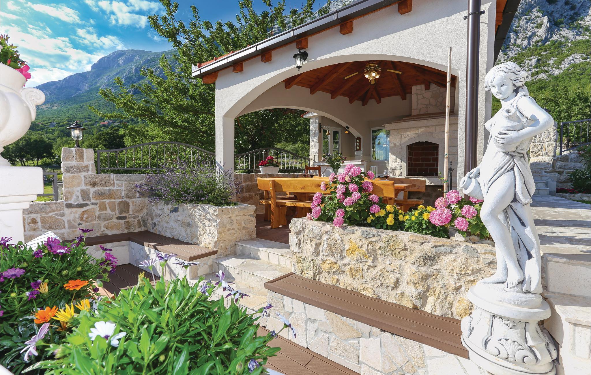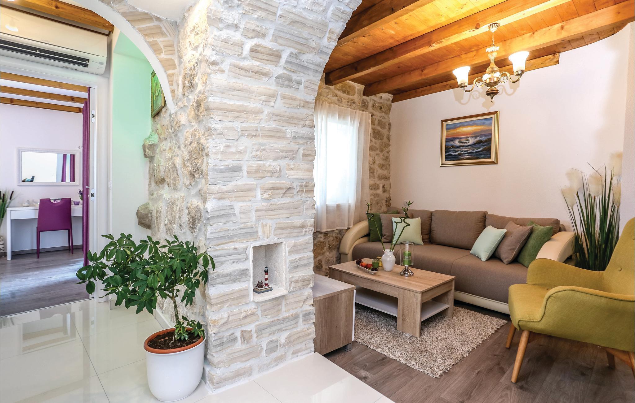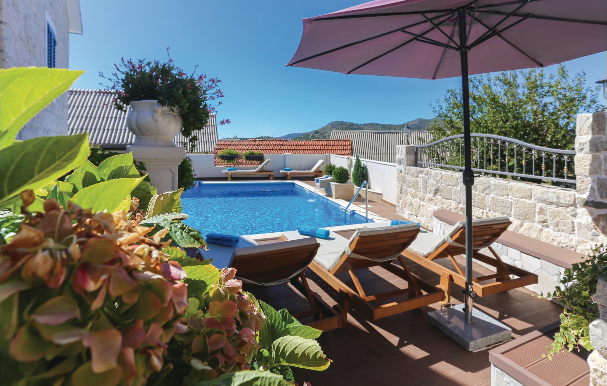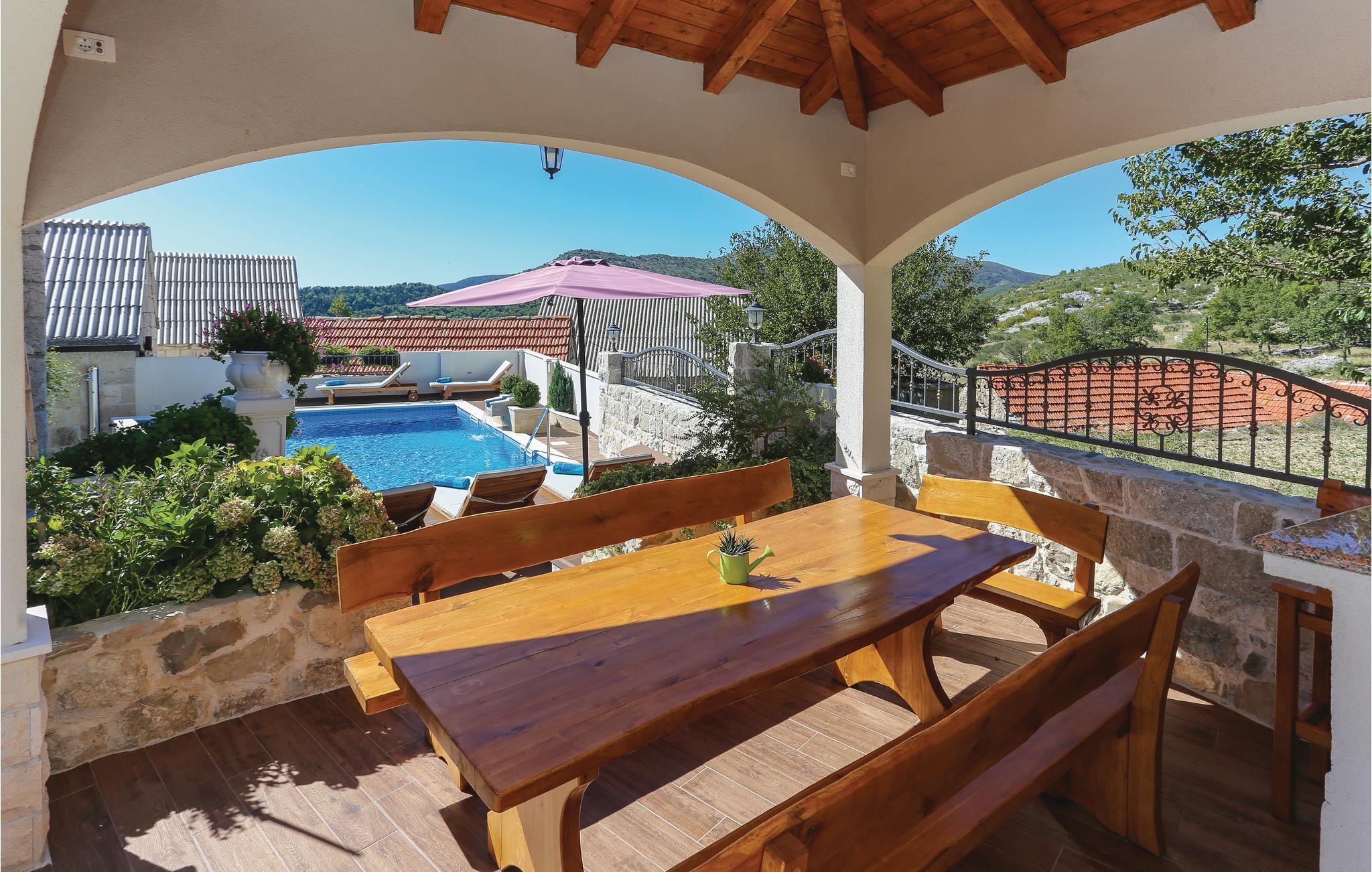 Skønt gennemrenoveret hus af sten, der ligger i landsbyen Gata, for foden af bjerget Mosor, med en betagende udsigt over det smukke landskab i Omis bagland. Huset er fordelt på to etager, som er forbundet via udendørs trappe – i stueplan er der en lille enkel lejlighed med et soveværelse, på første sal er der en mere komfortabel lejlighed med to soveværelser. I haven dominerer den dejlige swimmingpool, som I kan hoppe i lige så tit og lige når I har lyst. Der er også en konoba med en grill, hvor I kan slappe af med et godt glas vin, mens maden bliver færdig over gløderne. I bor ikke lagt fra en vandresti og mange aktivitetsmuligheder: I kan cykle, rafte og zip-line over Cetinafloden og gå lange ture. For længe siden var Gata den vigtigste by I Poljicka republikken, så besøg museet og se de mange velbevarede eksempler fra den spændende tid i byens historie.