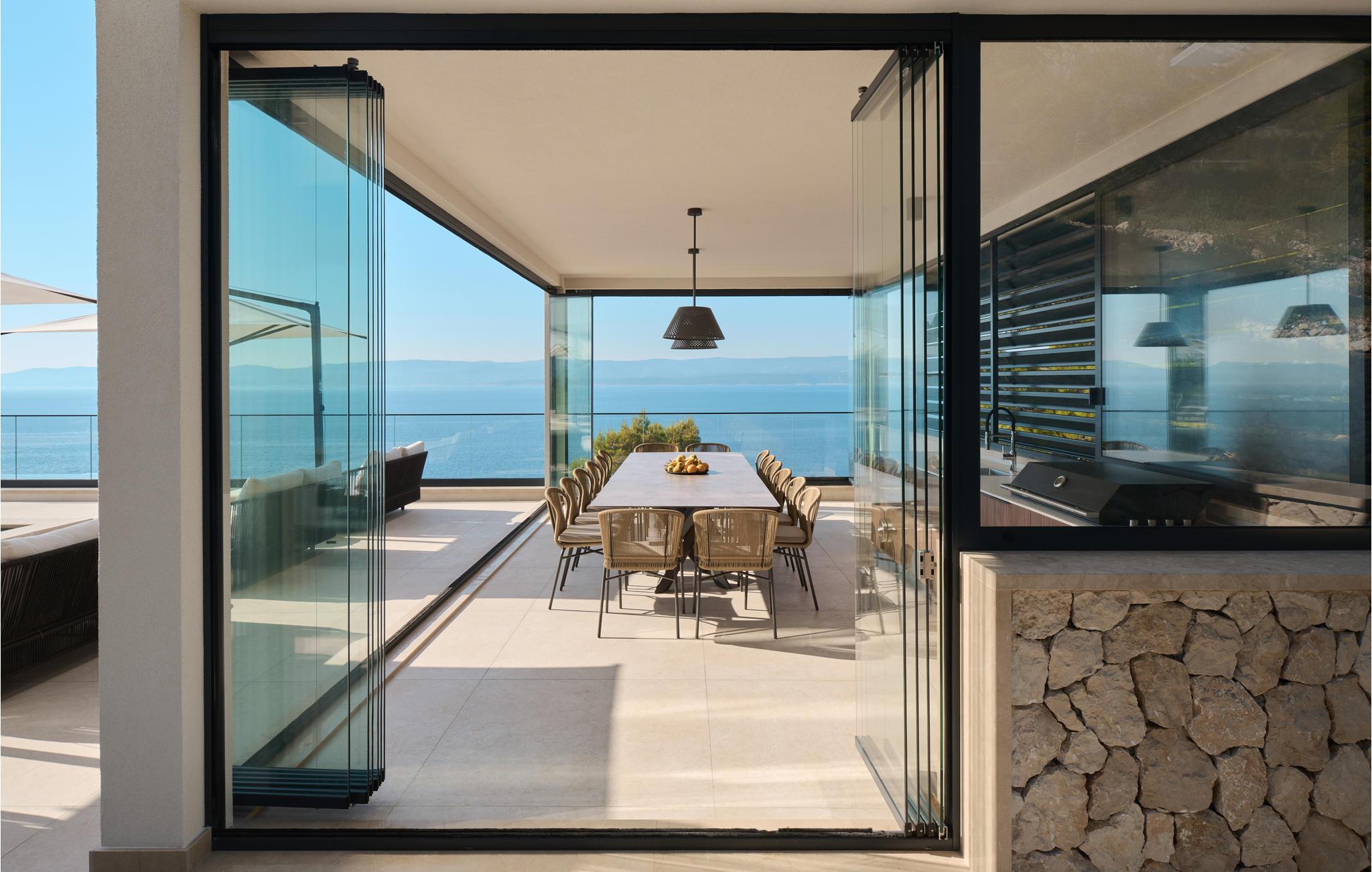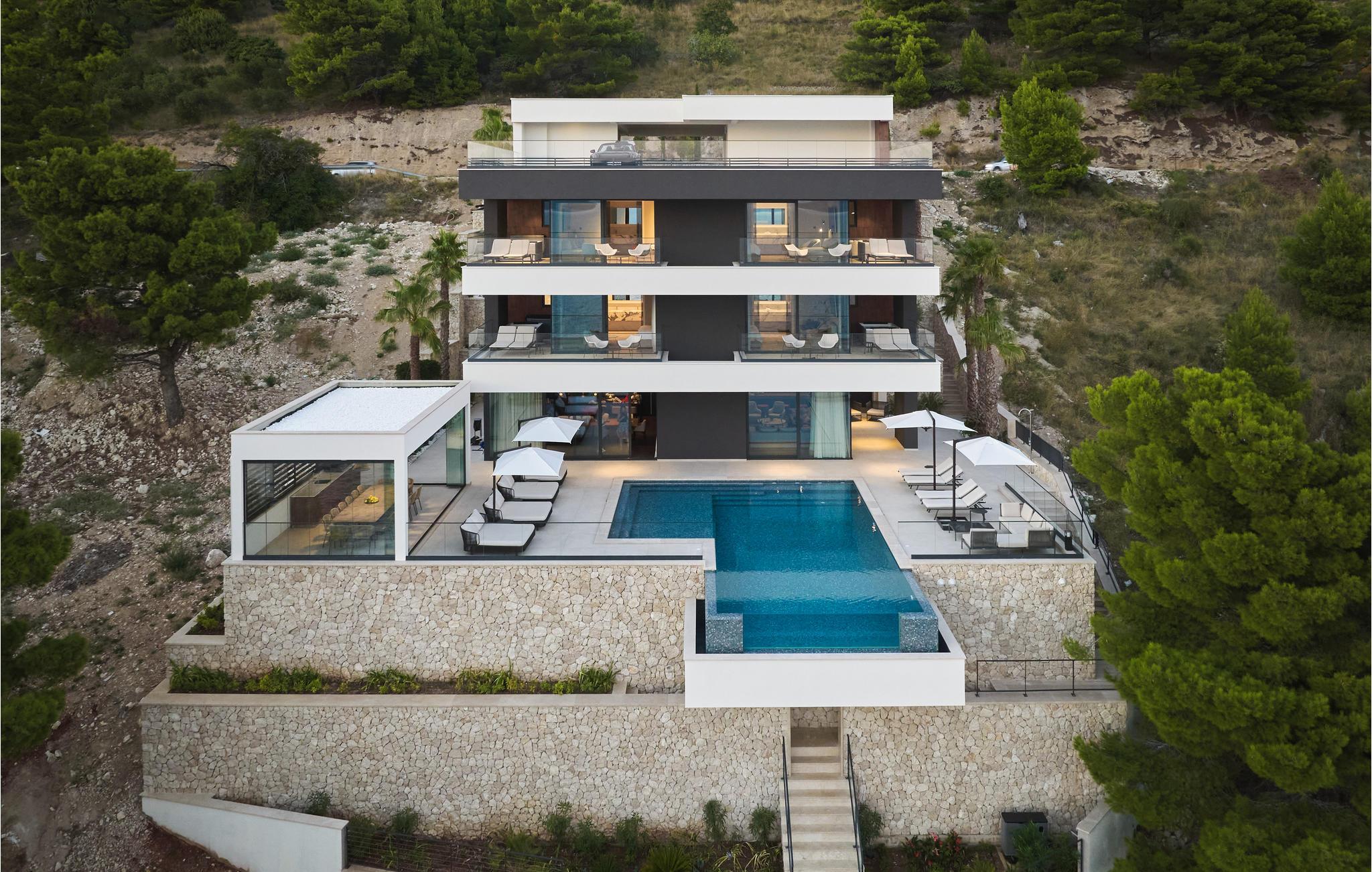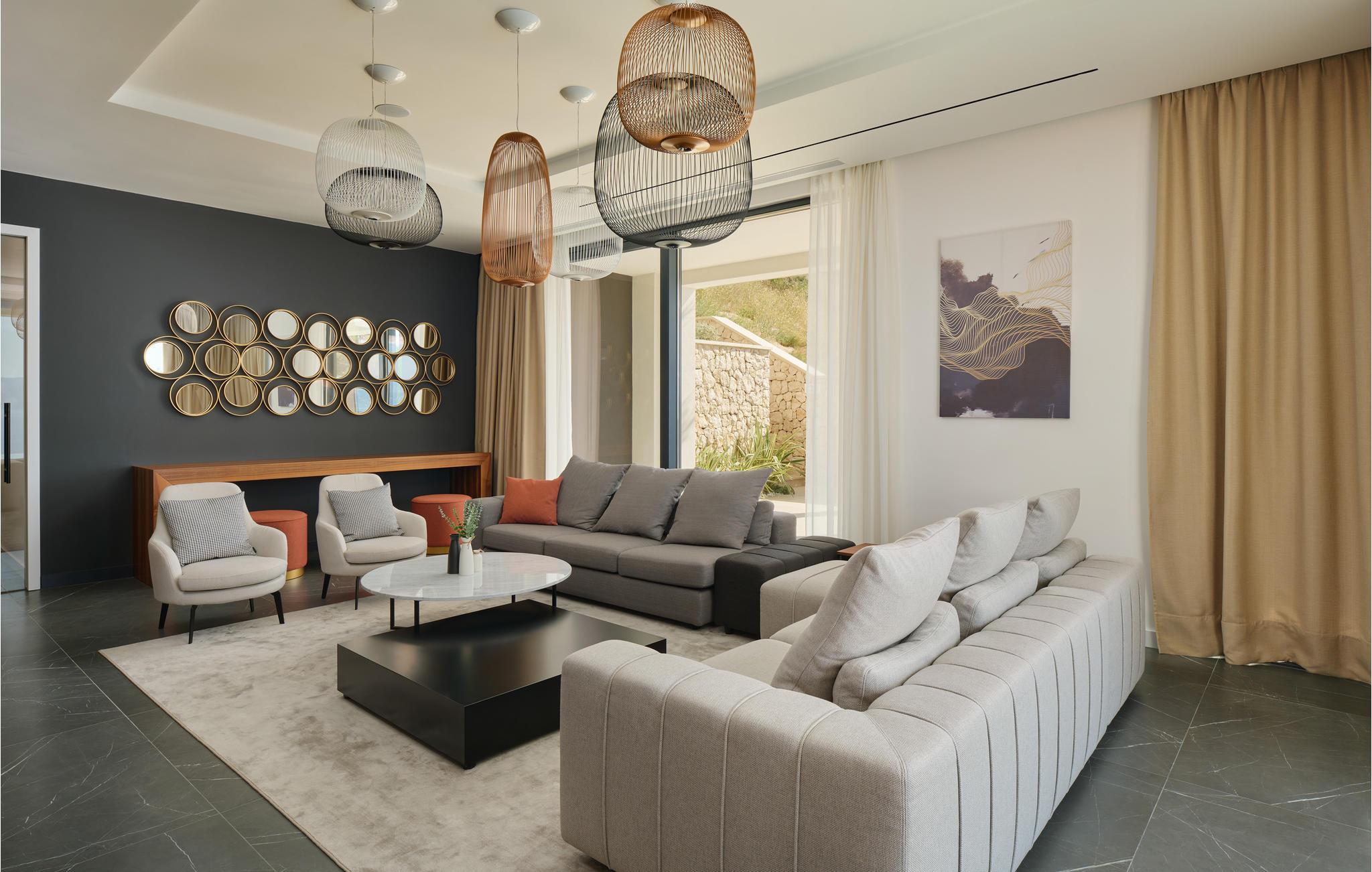 På den store terrasse kan I nyde en betagende panoramaudsigt over havet og de omkringliggende bakker. Infinity-poolen synes at smelte problemfrit sammen med det dybblå hav, som om himmel og vand er ét. Slap af på de stilfulde liggestole under parasollerne eller afslut dagen med en forfriskende drink i loungeområdet.