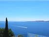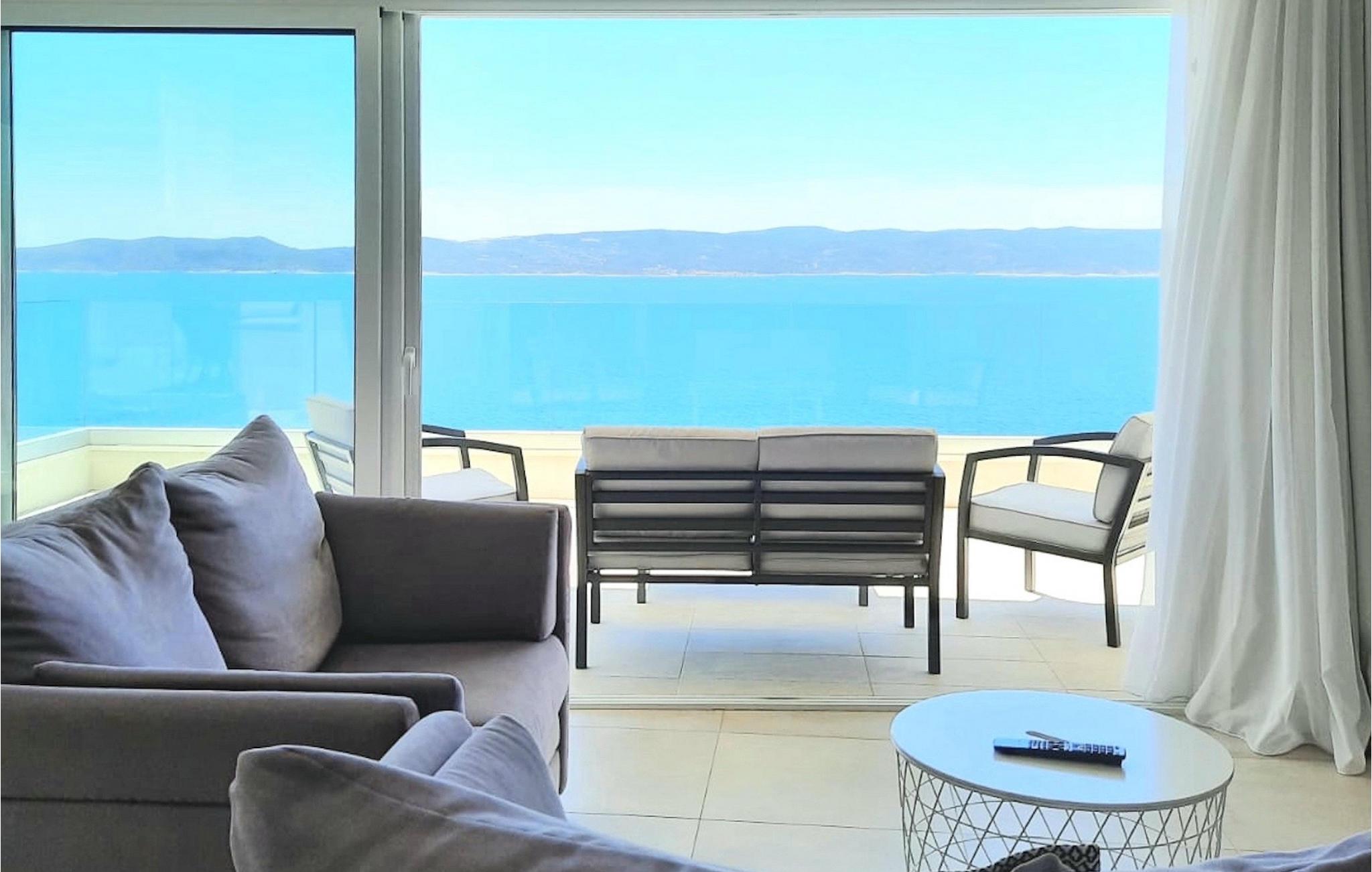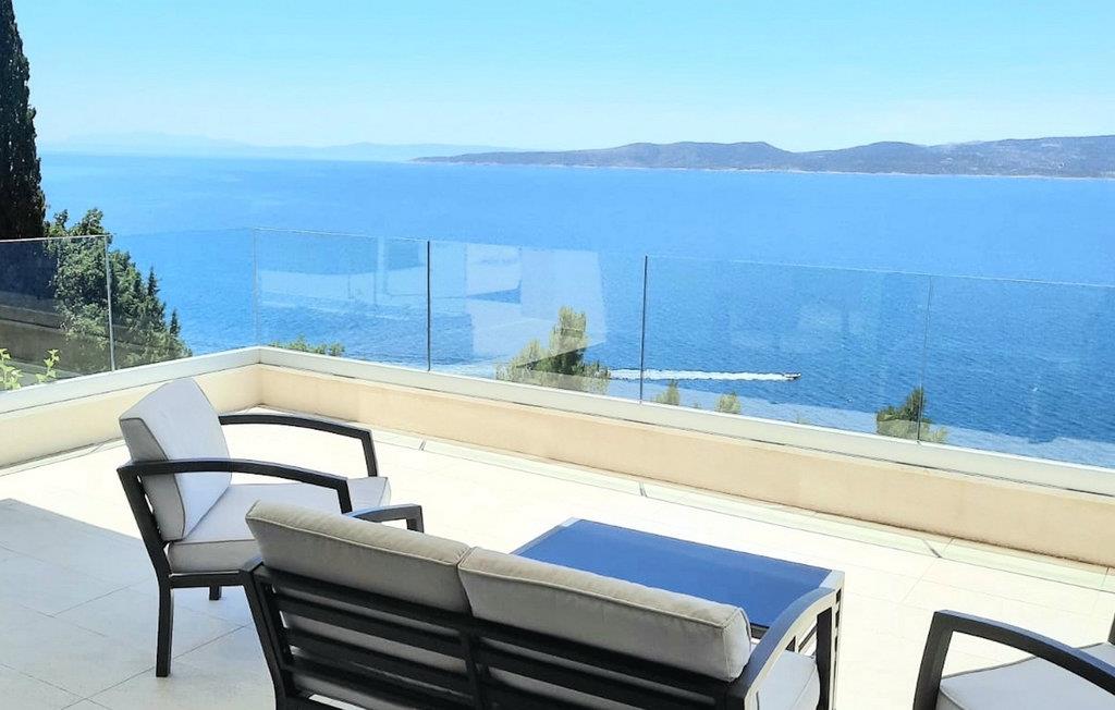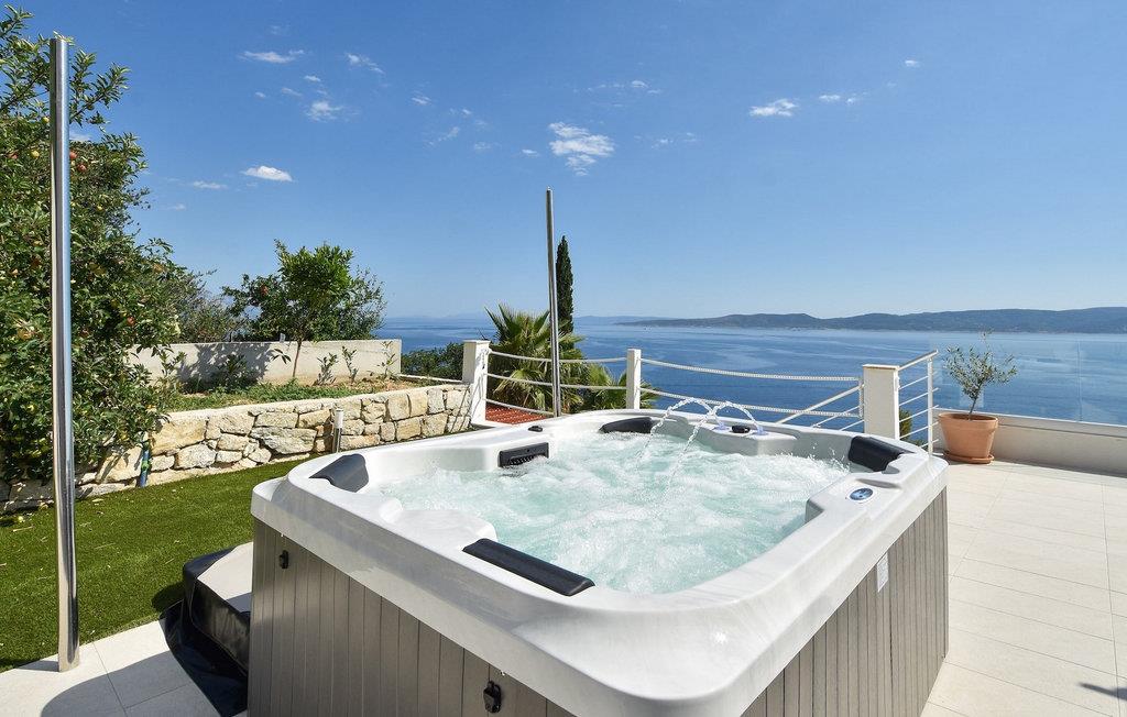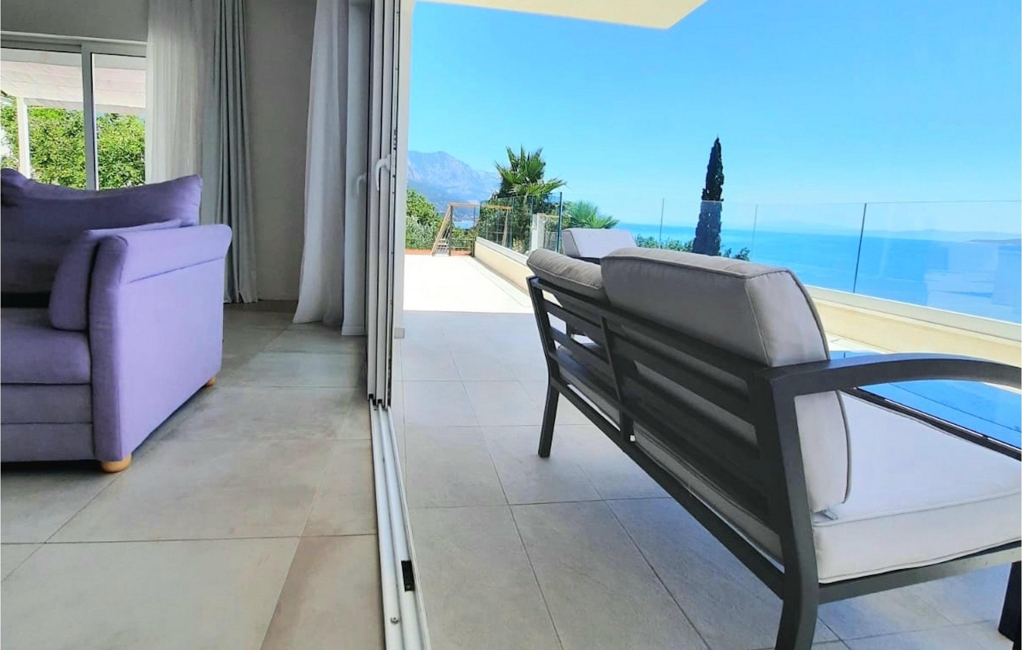 Villaen har to terrasser, som begge byder på fænomenal panoramaudsigt over havet. Der er en privat pool på den nederste terrasse, hvorom der er arrangeret liggestole, for maksimal nydelse i eller ved siden af poolen. Den overdækkede del af terrassen nær poolen er udstyret med et højt bord og stole og en grill, til de øjeblikke, hvor du har brug for ly for solen. Palmer, oliventræer og andre planter omkring terrasserne tjener til at skabe en endnu mere komplet middelhavsatmosfære. Hvis du klatrer op ad trappen til den øverste terrasse, venter endnu en overraskelse på dig - en udendørs jacuzzi! I slutningen af dagen kan du derfor nyde at se solnedgangen fra jacuzzien med et glas af din yndlingsdrink. Således er der på den ene del et spisebord til at nyde fælles måltider, og på den anden side finder du et loungeområde med direkte udsigt over havet, som et perfekt sted for en morgenkaffe. Glasdøre på disse områder af den øverste terrasse giver direkte adgang til stuen i villaens stueetage. Med mange lyskilder virker den åbne plantegning af stuen, spisestuen og det fuldt udstyrede køkken endnu mere rummelig og luftig. Det neutrale arrangement af villaens ydre og indre komplementerer hinanden perfekt og skaber kontinuitet i hele rummet.