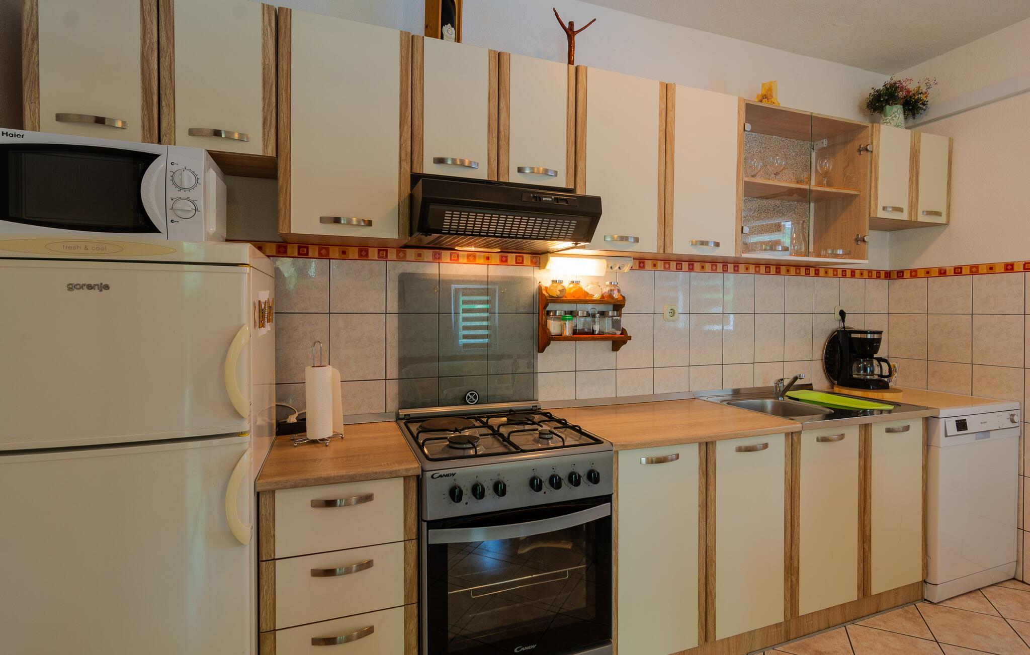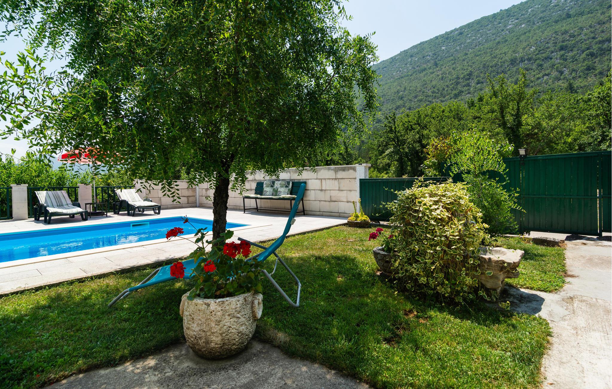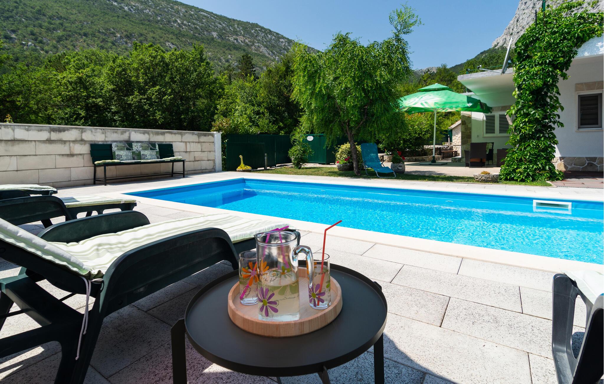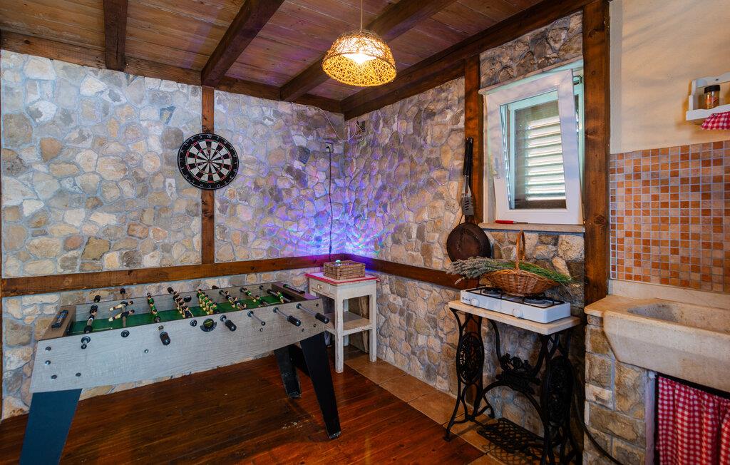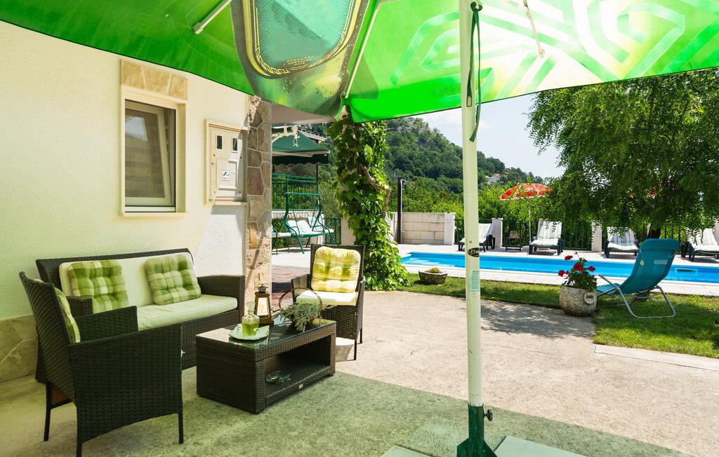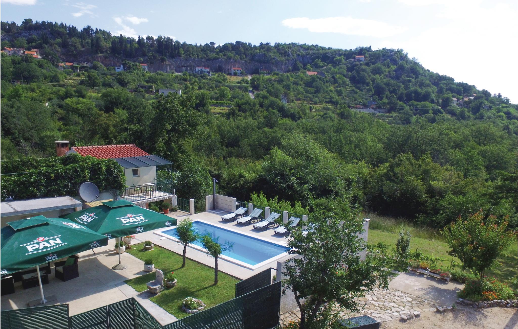 nærheden af Cetina-flodens smukke slugt, hvor I kan dyrke mange former for udendørs aktiviteter som vandring, rafting, kajak, klatring, zip-lining og paragliding. Denne vidunderlige ejendom, der er består af to små huse og en pool, ligger afsides nær en naturpark. Huset i et plan rummer køkken, badeværelse og to soveværelser, mens det to-etagers hus består af et sommerkøkken i stueetagen og et soveværelse med et badeværelse på den separate øverste etage. Flere terrasser omgiver ejendommen, hvor I kan slikke sol og hygge jer sammen. En feriebolig til en helt særlig ferie, som I sent vil glemme.