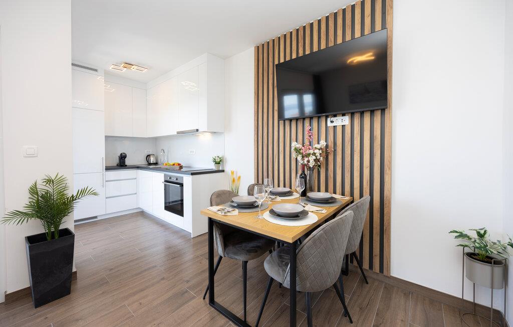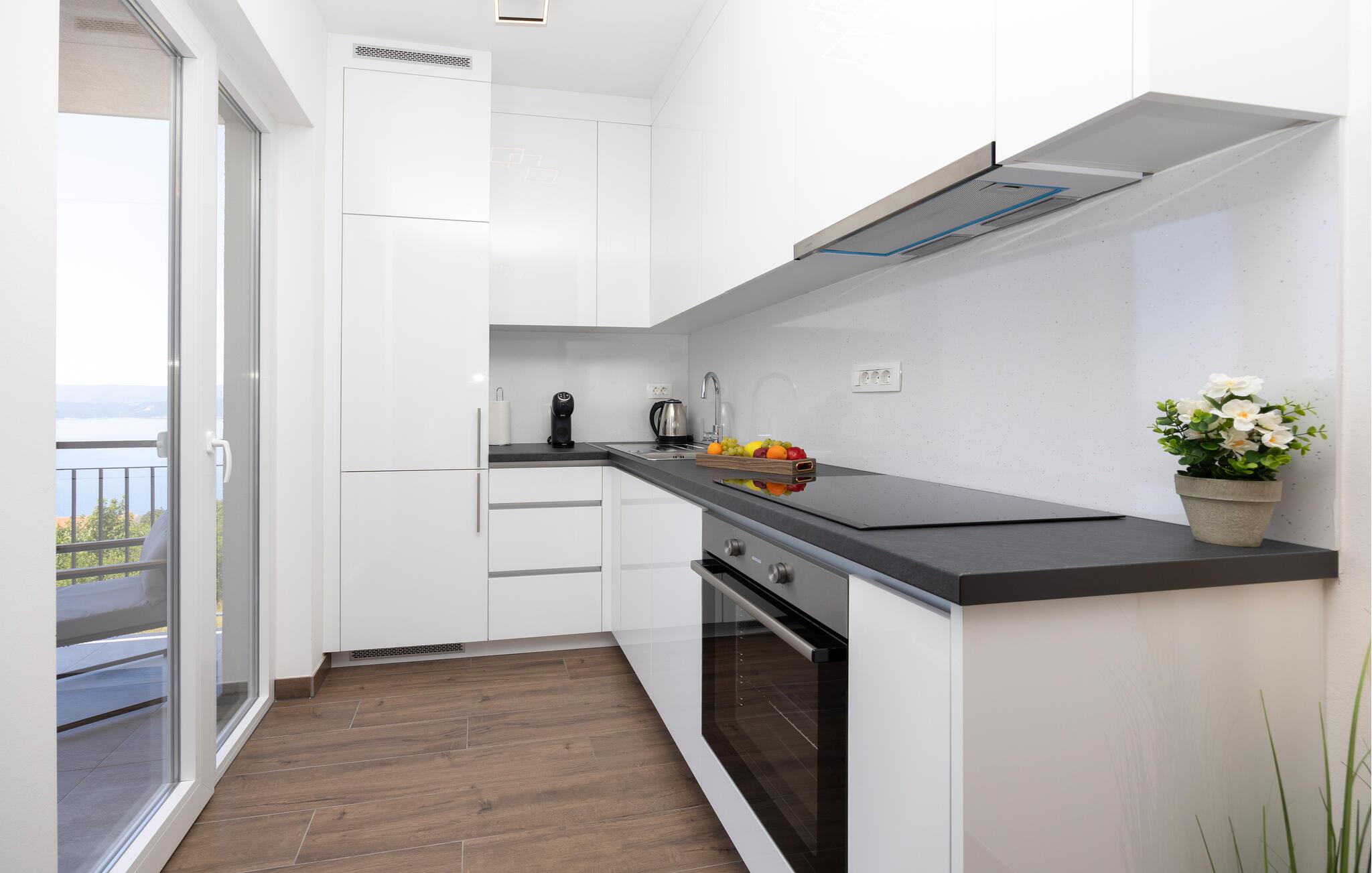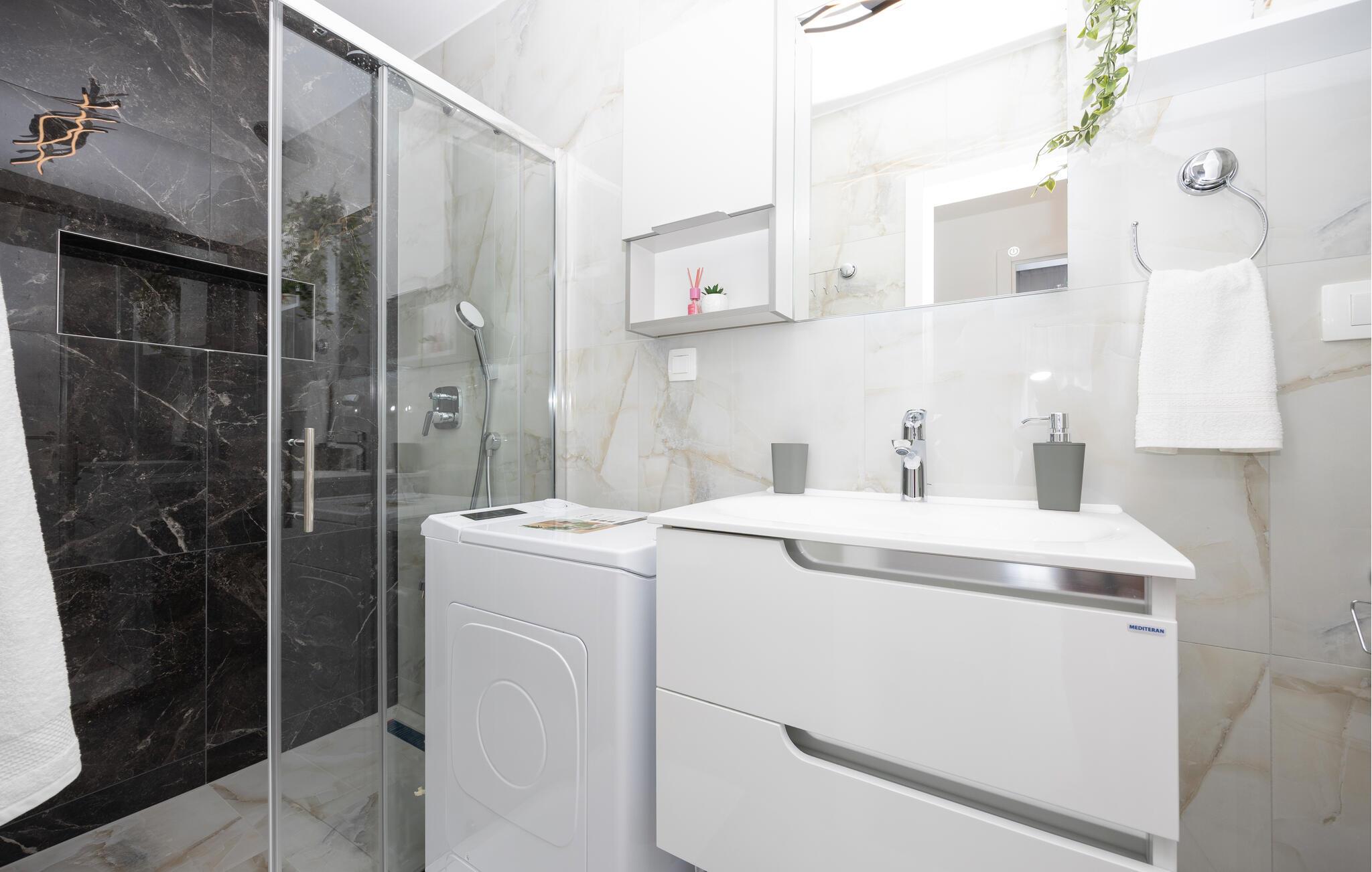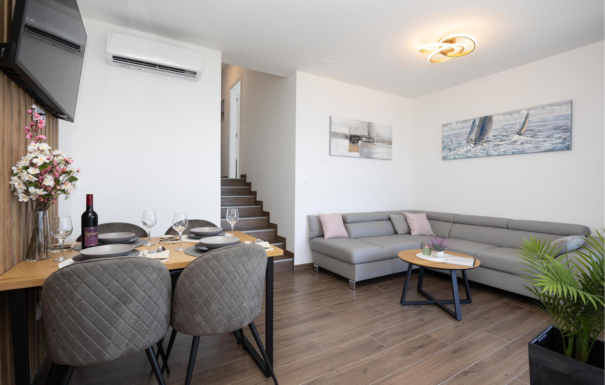Denne moderne lejlighed tilbyder alt hvad I behøver for et behageligt ophold. Nyd den ideelle beliggenhed kun få minutters gang fra stranden og den nære beliggenhed til restauranter, caféer og butikker. Gør det behageligt i den store sofa i opholdsstuen, nyd måltiderne sammen ved spisebordet, og tilbered lækre retter i køkkenet. Lejligheden har også direkte adgang til terrassen med udsigt over Adriaterhavet.