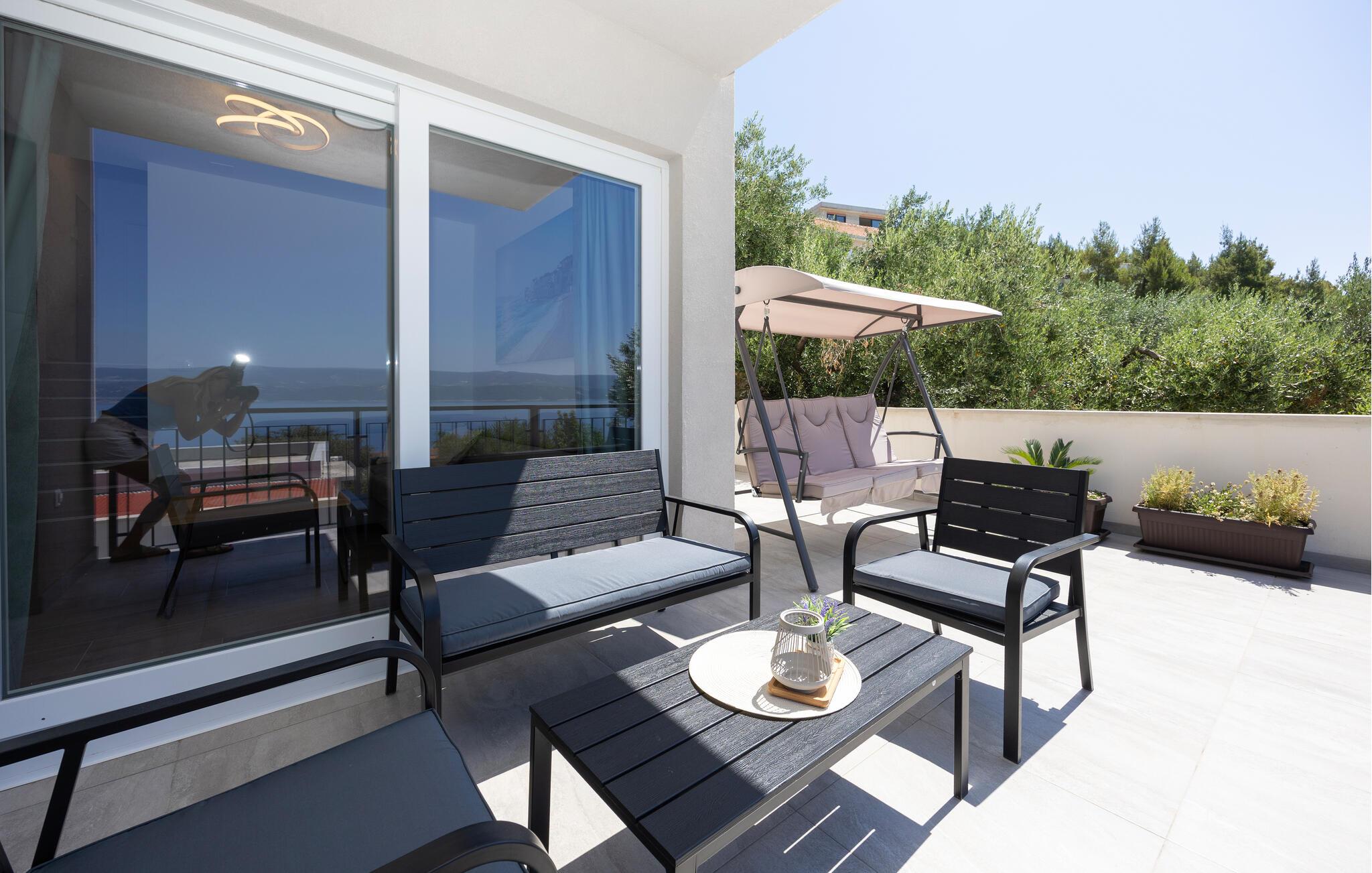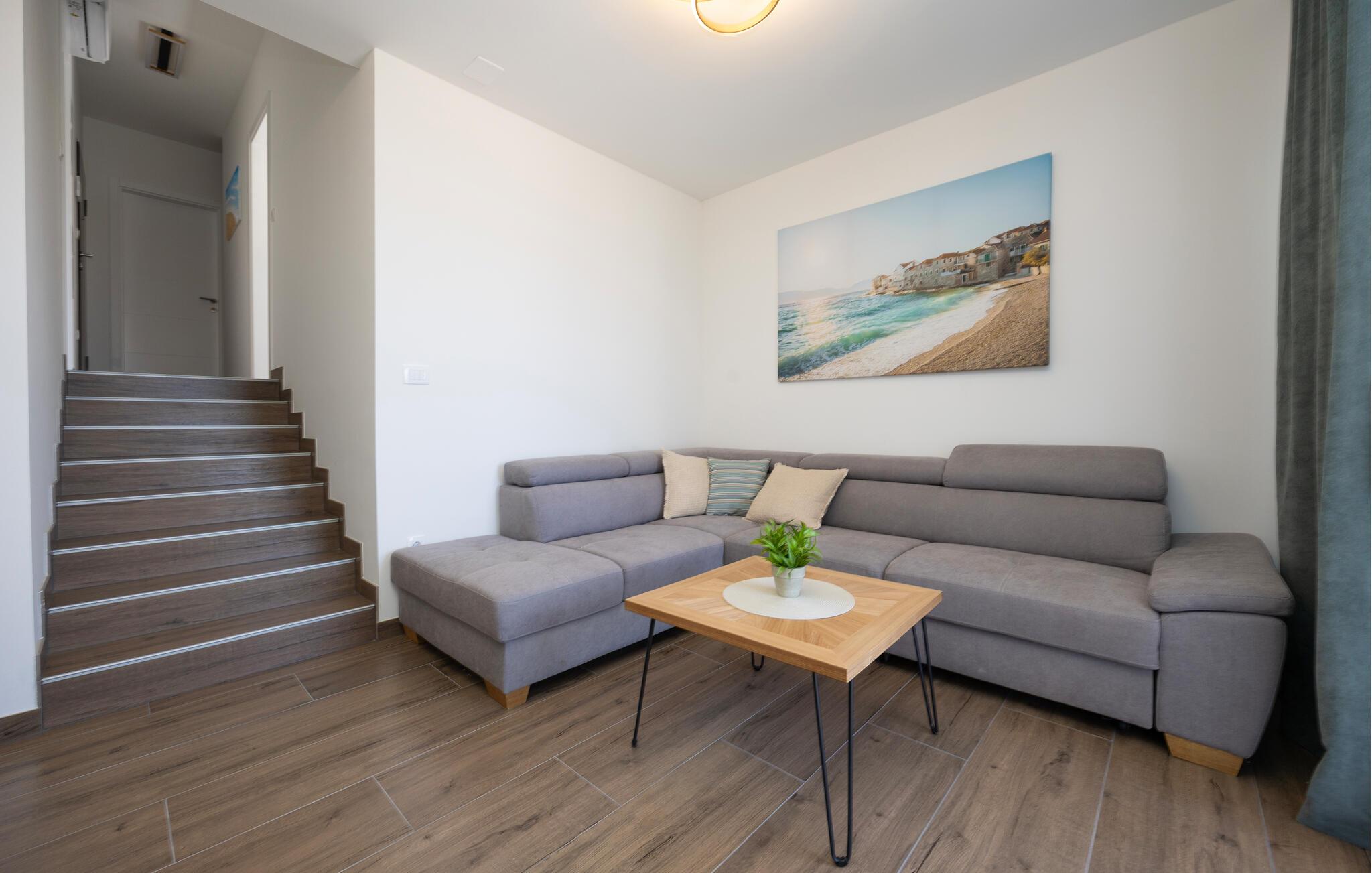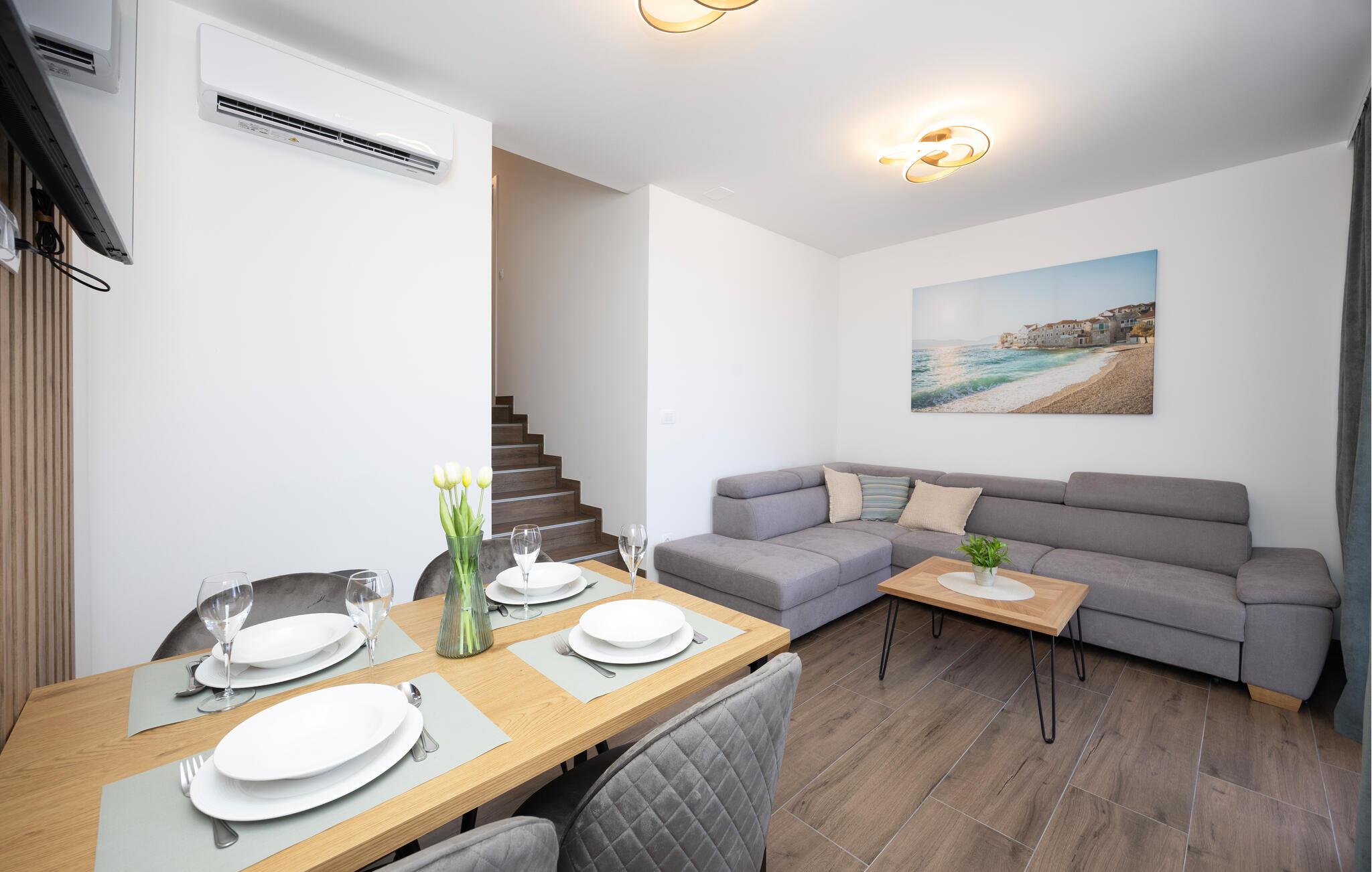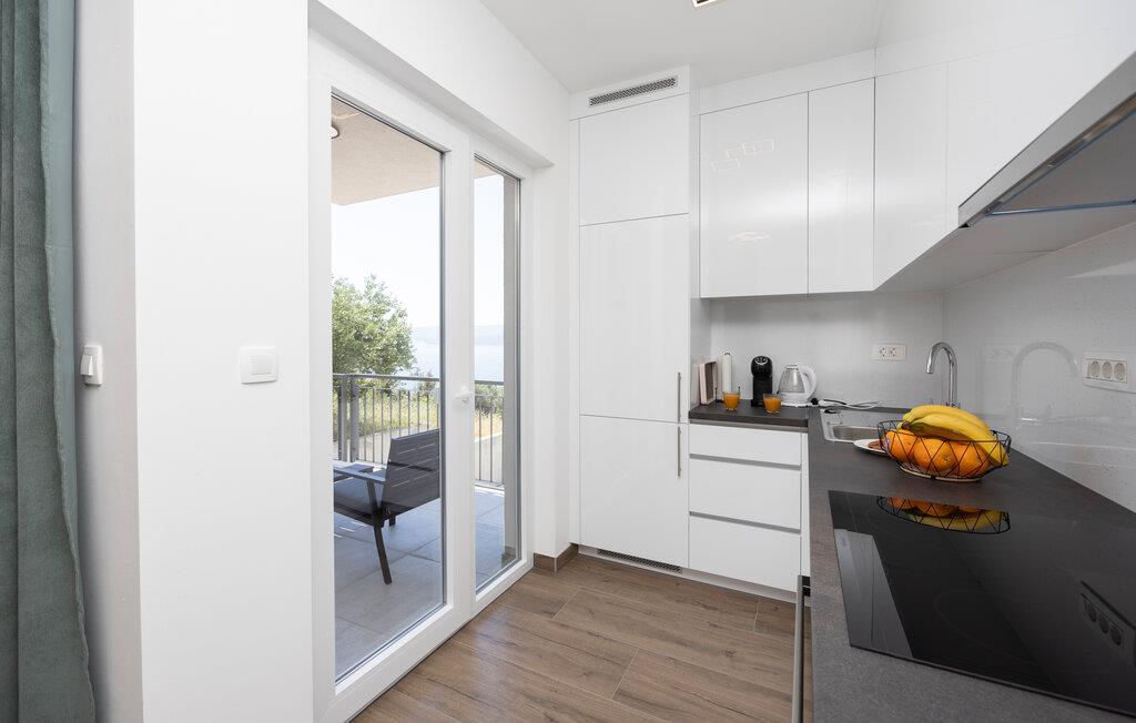Denne moderne lejlighed tilbyder alt hvad I behøver for et behageligt ophold. Nyd den ideelle beliggenhed kun få minutters gang fra stranden og den nære beliggenhed til restauranter, caféer og butikker. Gør det behageligt i den store sofa i opholdsstuen, nyd måltiderne sammen ved spisebordet, og tilbered lækre retter i køkkenet. Lejligheden har også direkte adgang til terrassen med udsigt over Adriaterhavet.
