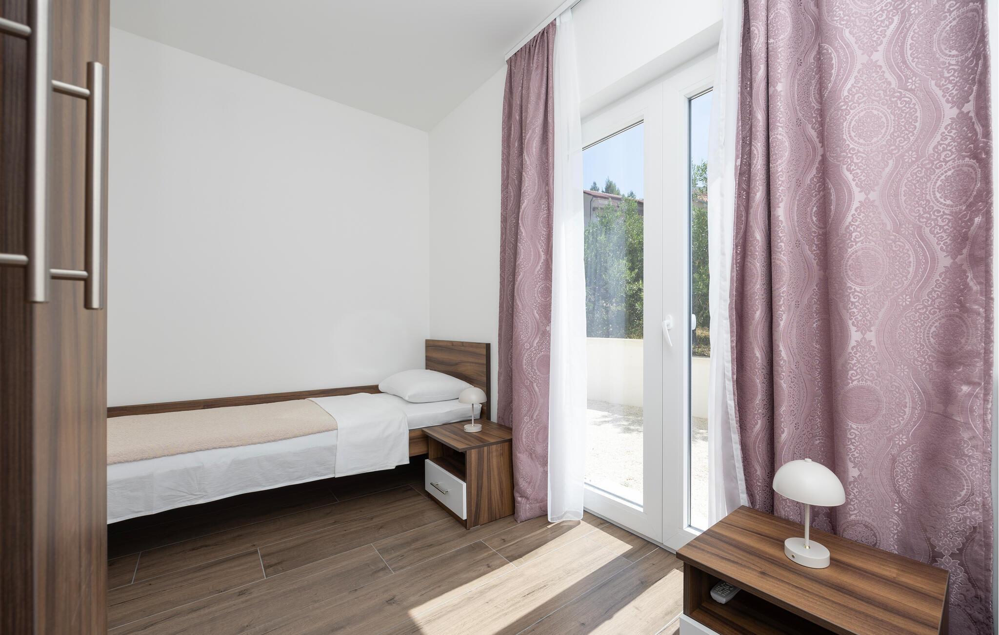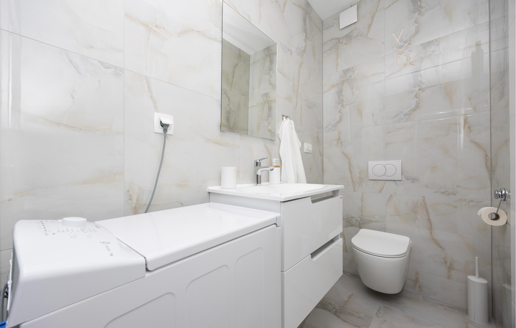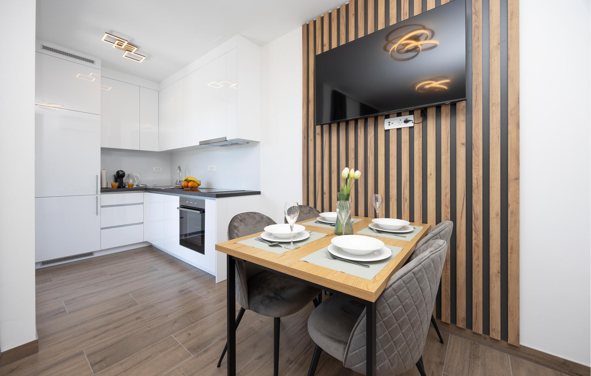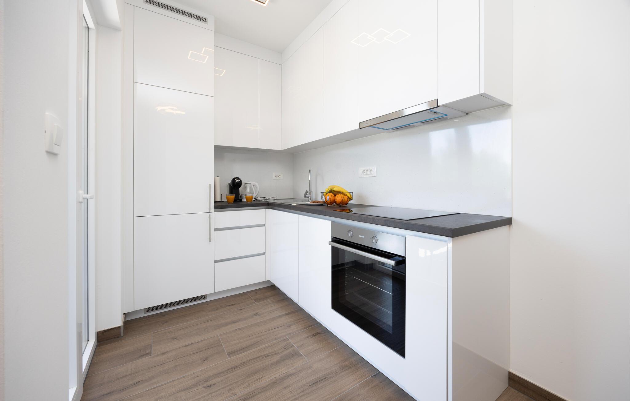 Denne moderne lejlighed tilbyder alt hvad I behøver for et behageligt ophold. Nyd den ideelle beliggenhed kun få minutters gang fra stranden og den nære beliggenhed til restauranter, caféer og butikker. Gør det behageligt i den store sofa i opholdsstuen, nyd måltiderne sammen ved spisebordet, og tilbered lækre retter i køkkenet. Lejligheden har også direkte adgang til terrassen med udsigt over Adriaterhavet.