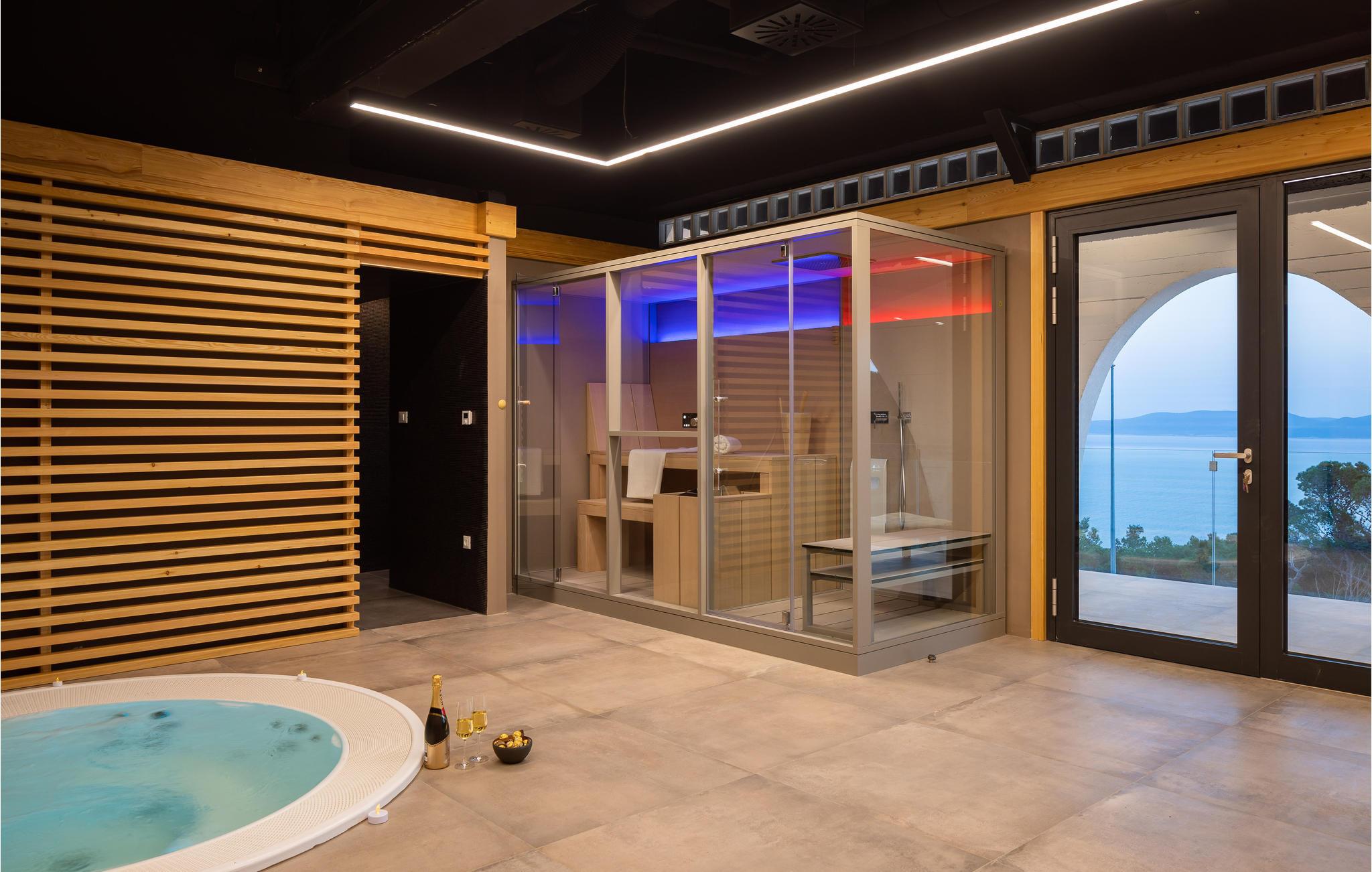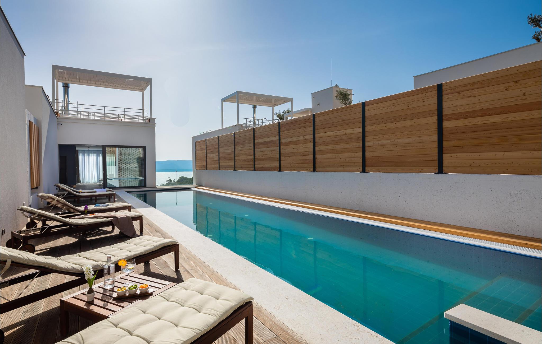 Velkommen til dette stilfuldt indrettede feriehus og glæd jer til en fantastisk ferie. Nyd den vidunderlige panoramaudsigt til havet og øen Brac fra den store, centrale terrasse, som er direkte forbundet med alle værelser og stuen. Hop en tur i den store pool eller svøm et par runder, så dagens motion er klaret. I kan også se frem til det store wellness-område med spabad, sauna, fitnessudstyr og tepidarium. Hvis I vil have en rolig alenestund, er der separate udendørsterrasser til hvert værelse.