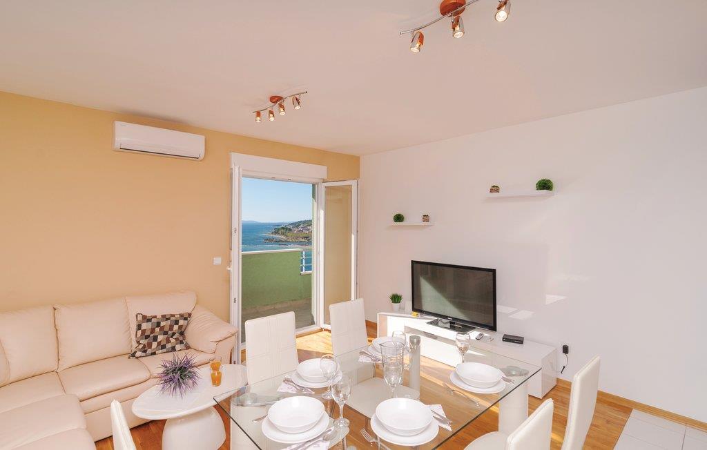Denne dejligt og moderne indrettede ferielejlighed ligger på anden sal i en ejendom, der ligger i et kuperet terræn. I lejligheden er der to soveværelser, badeværelse samt et køkken i åben forbindelse med stuen og udgang til terrassen, hvorfra der både er udsigt over havet og den lille by Omis. En stejl vej, fører ned til de skønne strande og havet. Omis er en livlig ferieby, der bobler af underholdning og aktiviteter i sommermånederne. I kan fx prøve at rafte på floden Cetina, eller suse over den på zip-line.