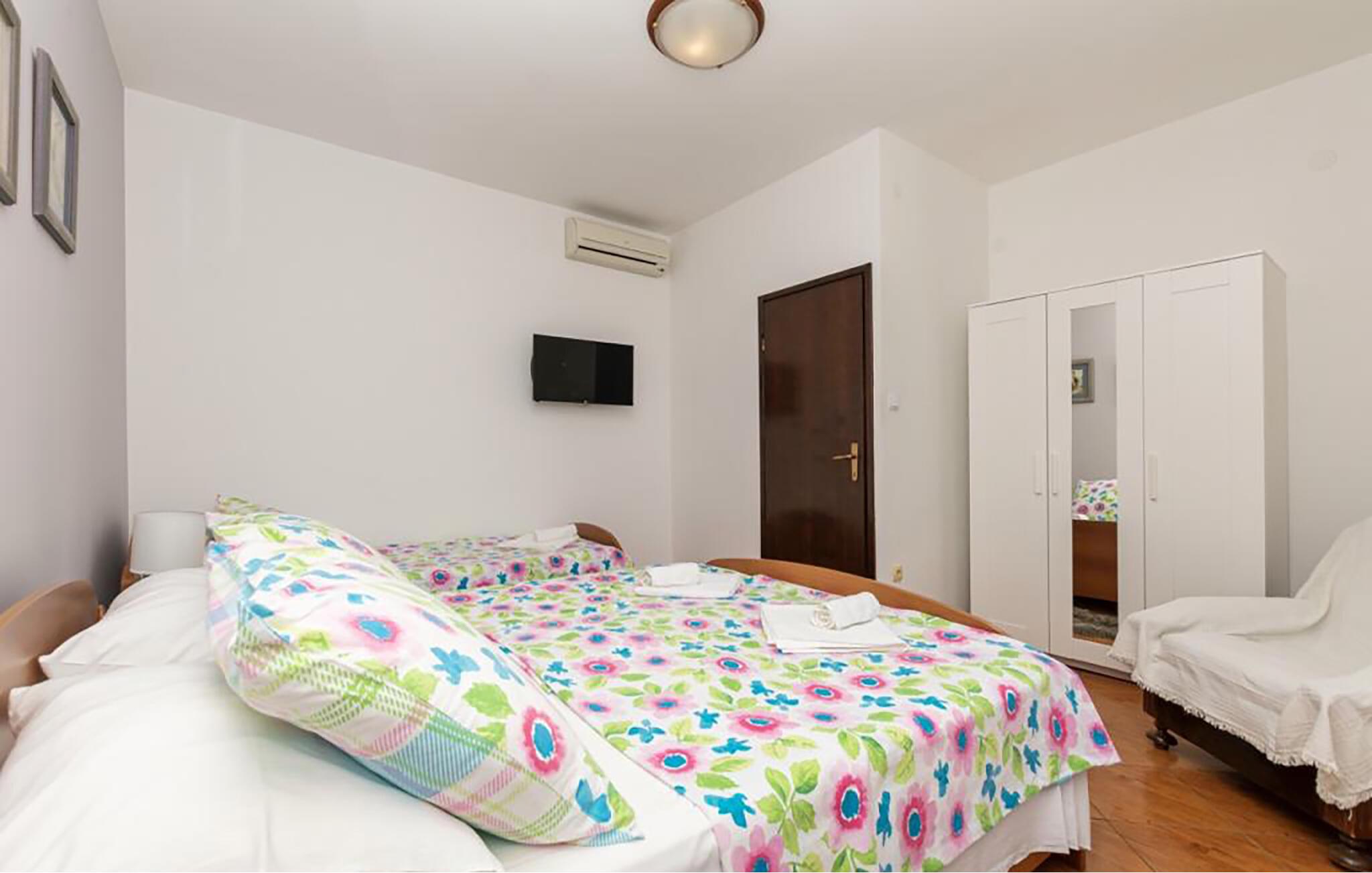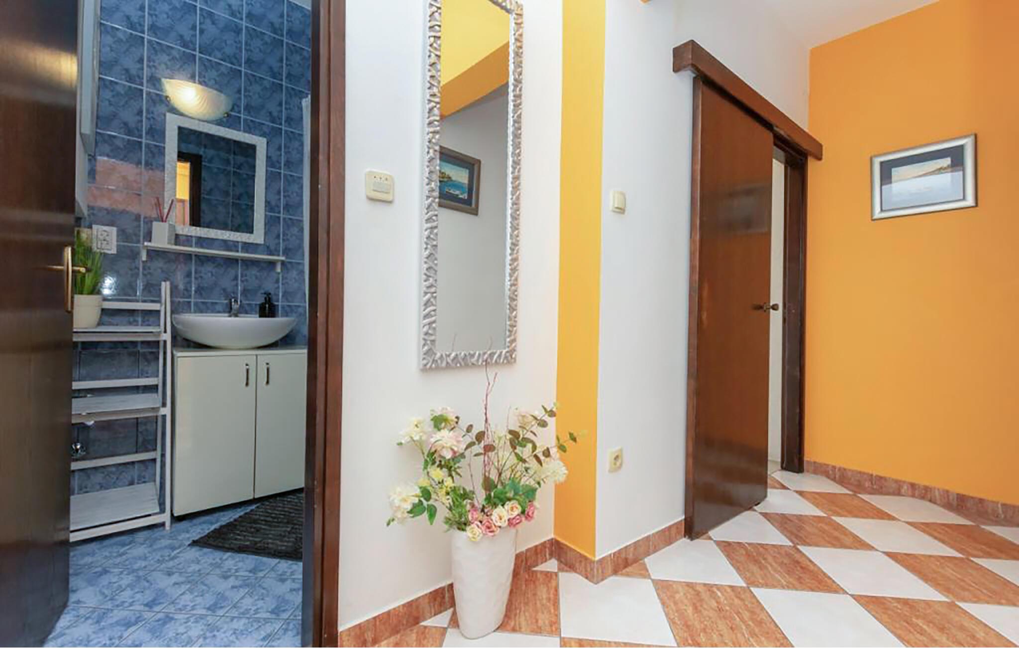 Tilbring en afslappende ferie i denne lejlighed med havudsigt og en imponerende bjergkulisse. Træd ind i det lyse interiør, nyd det funktionelle design, og brug jeres lejlighed til at slappe af i timevis efter en begivenhedsrig dag. Møblerne er rene og praktiske og tilbyder alt, hvad I behøver for et behageligt ophold. Tilbered nemt enkle måltider i det praktiske tekøkken. Gå udenfor og sæt jer ved det lille bord. Nyd morgenmaden her, eller lad aftenen slutte med udsigt over hustagene og havet. Udendørsområdet tilbyder et beskyttet tilflugtssted med en betagende udsigt. Udnyt den høje beliggenhed til rolige øjeblikke væk fra travlheden og nyd den friske luft i afslappede omgivelser. Oplev Omiš' varierede omgivelser. Slentr gennem den historiske gamle bydel med dens smalle gader, og besøg Starigrad-fæstningen, der tilbyder en betagende udsigt over kysten. Tilbring dage med at svømme ved sand- og stenstrandene langs Cetina-flodmundingen. Tag på rafting på Cetina-floden, eller tag på vandretur i de omkringliggende bjerge. Udforsk kystpromenaden med dens restauranter og caféer, eller planlæg udflugter til nærliggende byer langs den dalmatiske kyst.