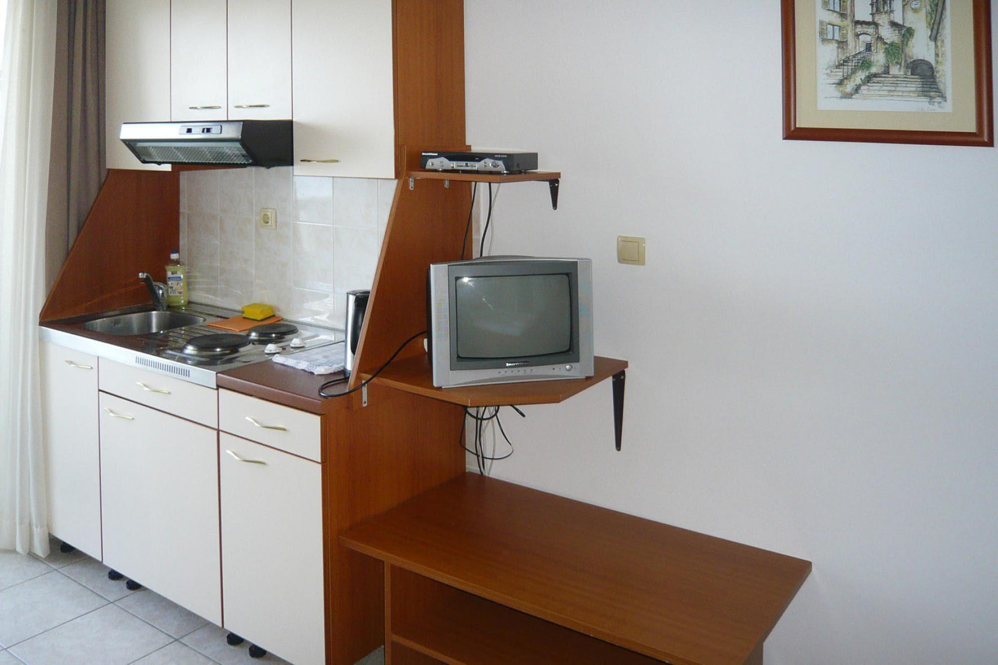 Tekøkken(spisebord, kakkelovn, elkedel, køle-fryseskab), Stue/soveværelse(enkeltseng, dobbeltseng, Fjernsyn(parabol)), badeværelse(bruser, toilet), fællesrum(Bordtennis), Internetadgang, Strand, balkon, klimaanlæg, terrasse, havemøbler, grill(deles med andre gæster), parkering