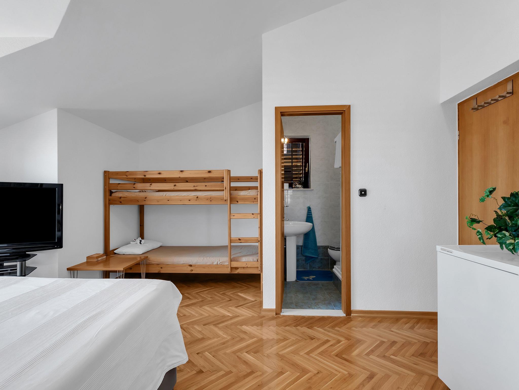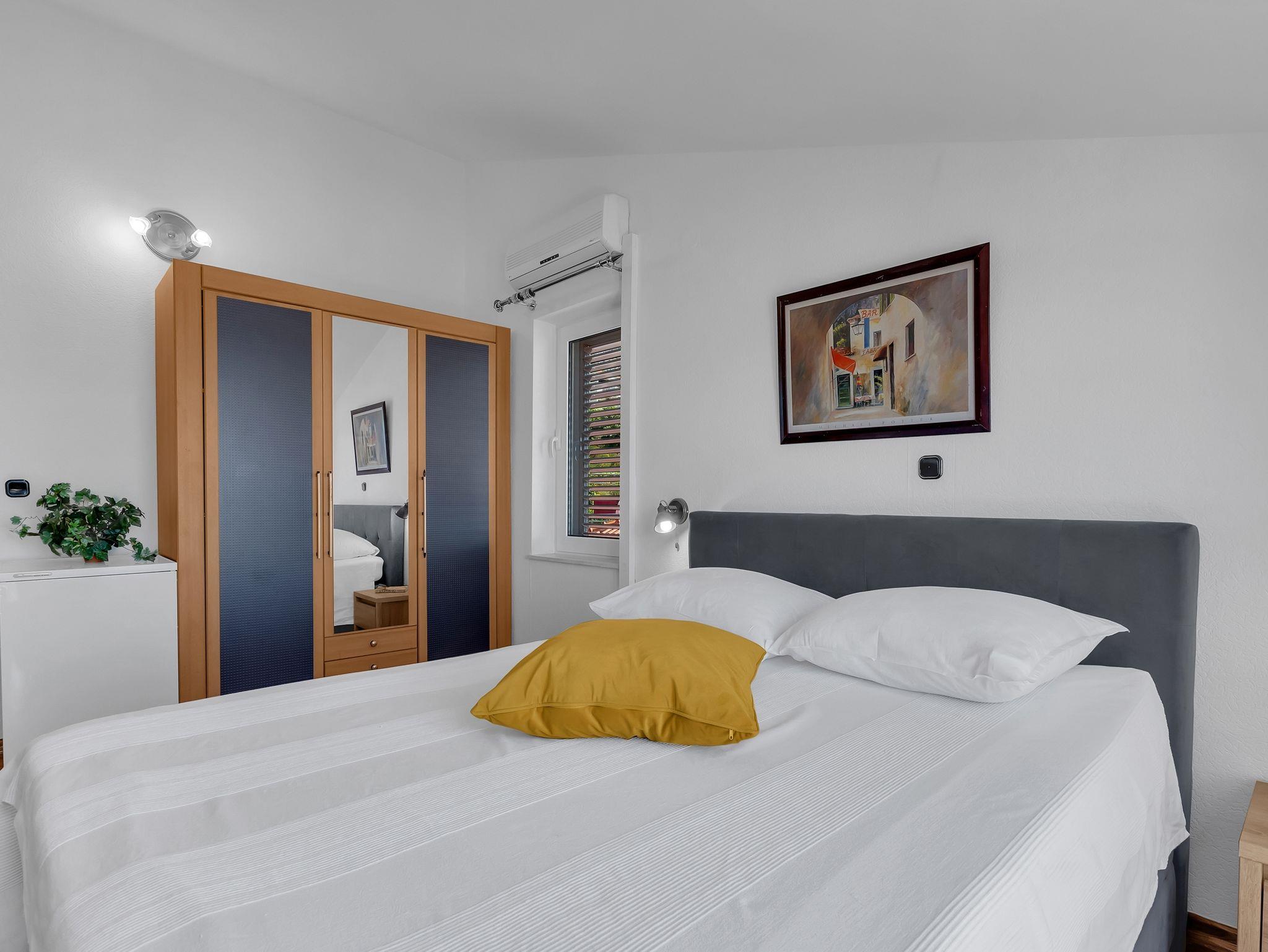 Zimmer bietet Platz für 4 Gäste. Die Betten sind in Schlafzimmern, die es 1 gibt, innerhalb einer Gesamtfläche von 21m2, angeordnet. Die Gäste haben einen eigenen Balkon zur Verfügung, auf der sie in warmen Sommernächten genießen können. Das Zimmer bietet Meerblick. In der Unterkunftseinheit besteht die Möglichkeit des Mitbringens von Haustieren gegen Aufpreis. Die reservierte Unterkunftseinheit ist ein Zimmer mit eigenem Badezimmer ohne die Möglichkeit der Nutzung einer Küche. Die reservierte Unterkunftseinheit verfügt über einen gemeinsame Terrasse. IM PREIS INBEGRIFFEN: Kurtaxe, Endreinigung, Klimatisierung, Parkplatz, Internet, Bügeleisen, Bügelbrett, Föhn. VERBINDLICHE ZUSÄTZLICHE KOSTEN: Aufzahlung für Kurzaufenthalte (prozentualer Zuschlag pro Nächtigungsanzahl: 30% - 1, 20% - 2, 10% - 3). UNVERBINDLICHE ZUSÄTZLICHE KOSTEN: Haustiere (10,00 € pro Nacht). Die Verfügbarkeit zusätzlicher Dienstleistungen in Ihrem reservierten Termin und die Preise derselben (falls nicht aufgeführt) müssen im Voraus überprüft werden. Zusätzliche Dienstleistungen die in der Zahlungsaufforderung nicht aufgeführt sind werden direkt beim Vermieter bezahlt, angenommen der Gast nutzt auch diese. Ermäßigung auf den Grundpreis: Gratistag 14=13 (bei einem Aufenthalt von 14 Tagen oder mehr erhalten Sie einen Gratistag für den Aufenthalt bis 31.12.26).