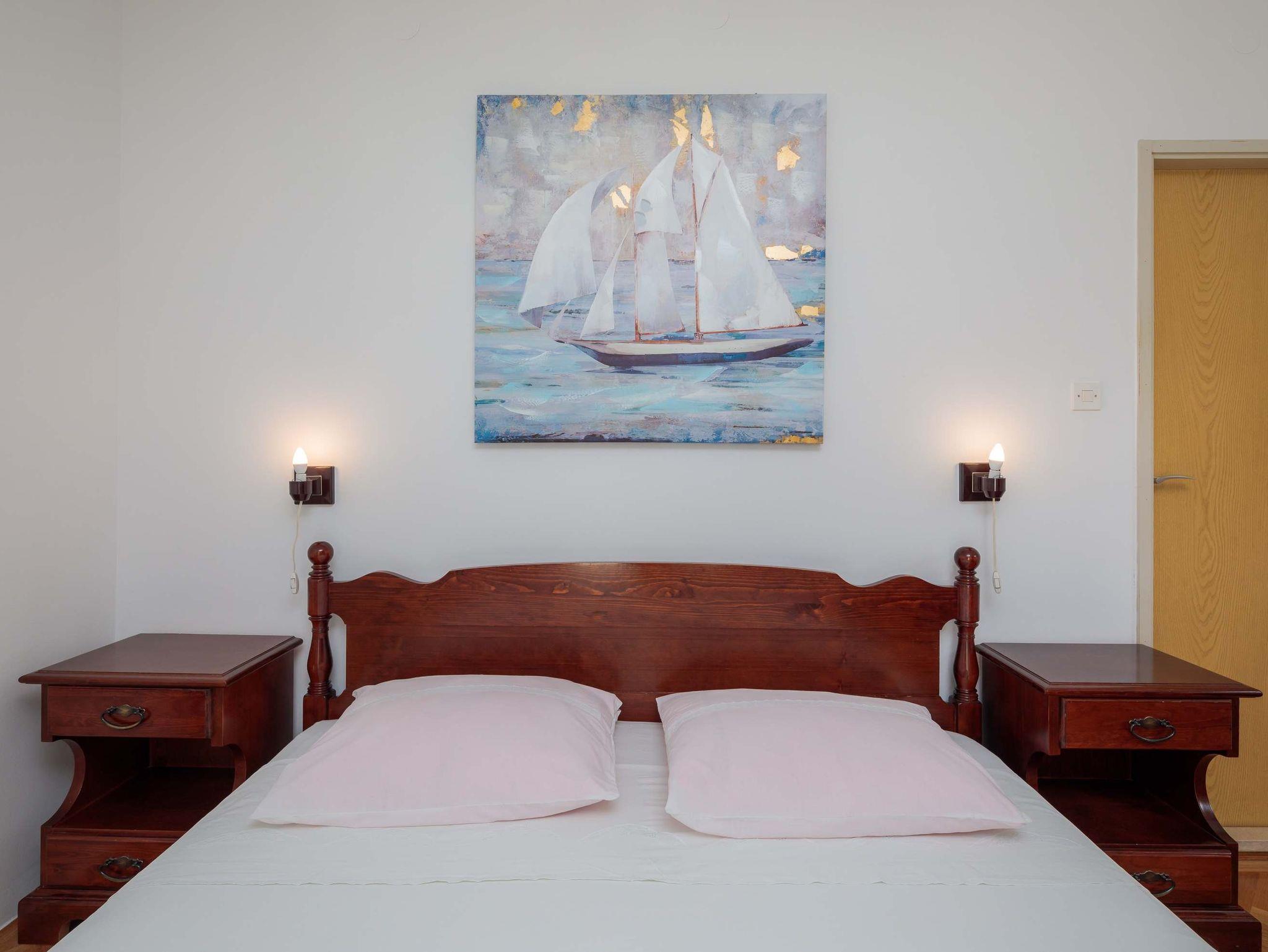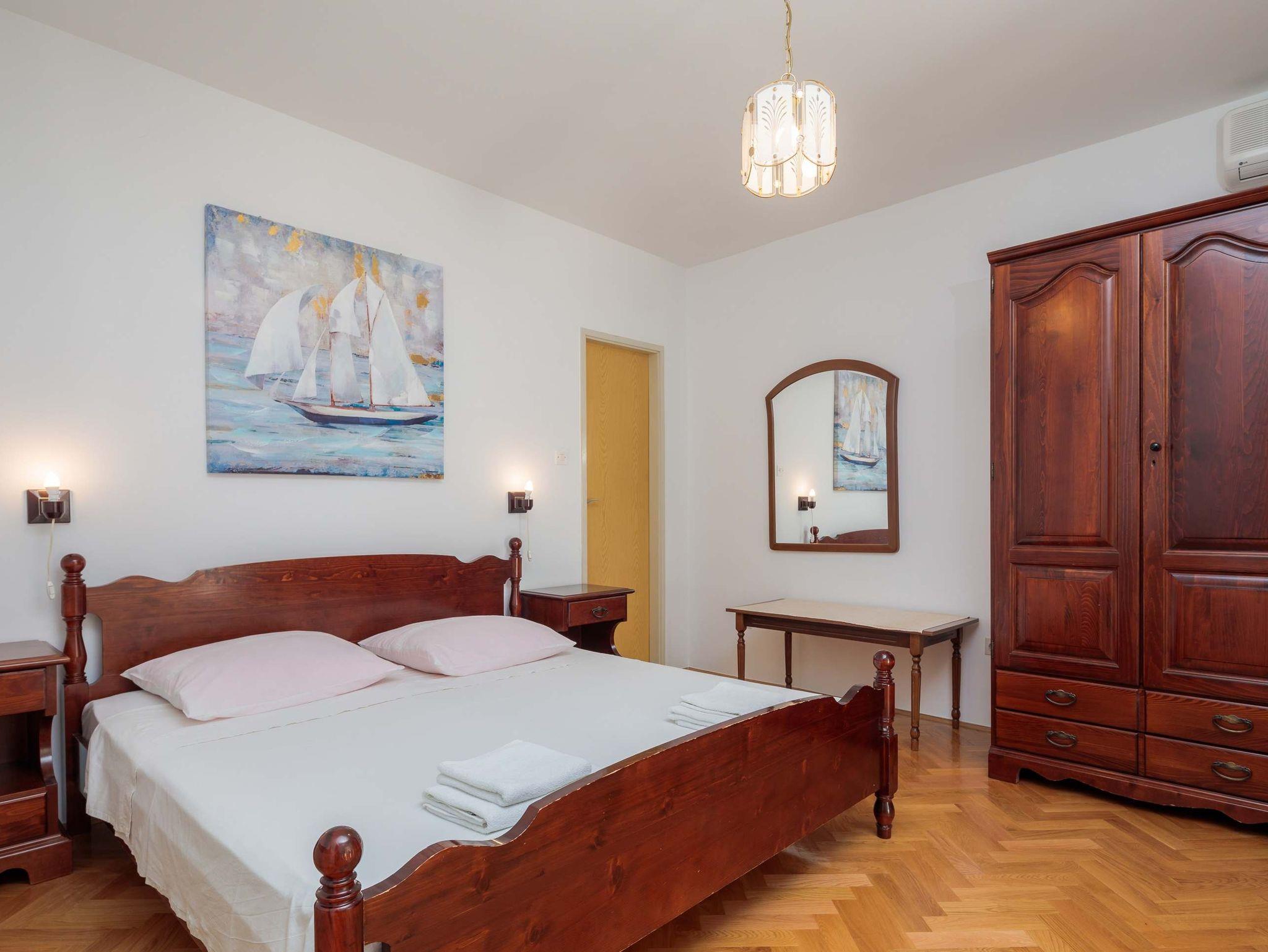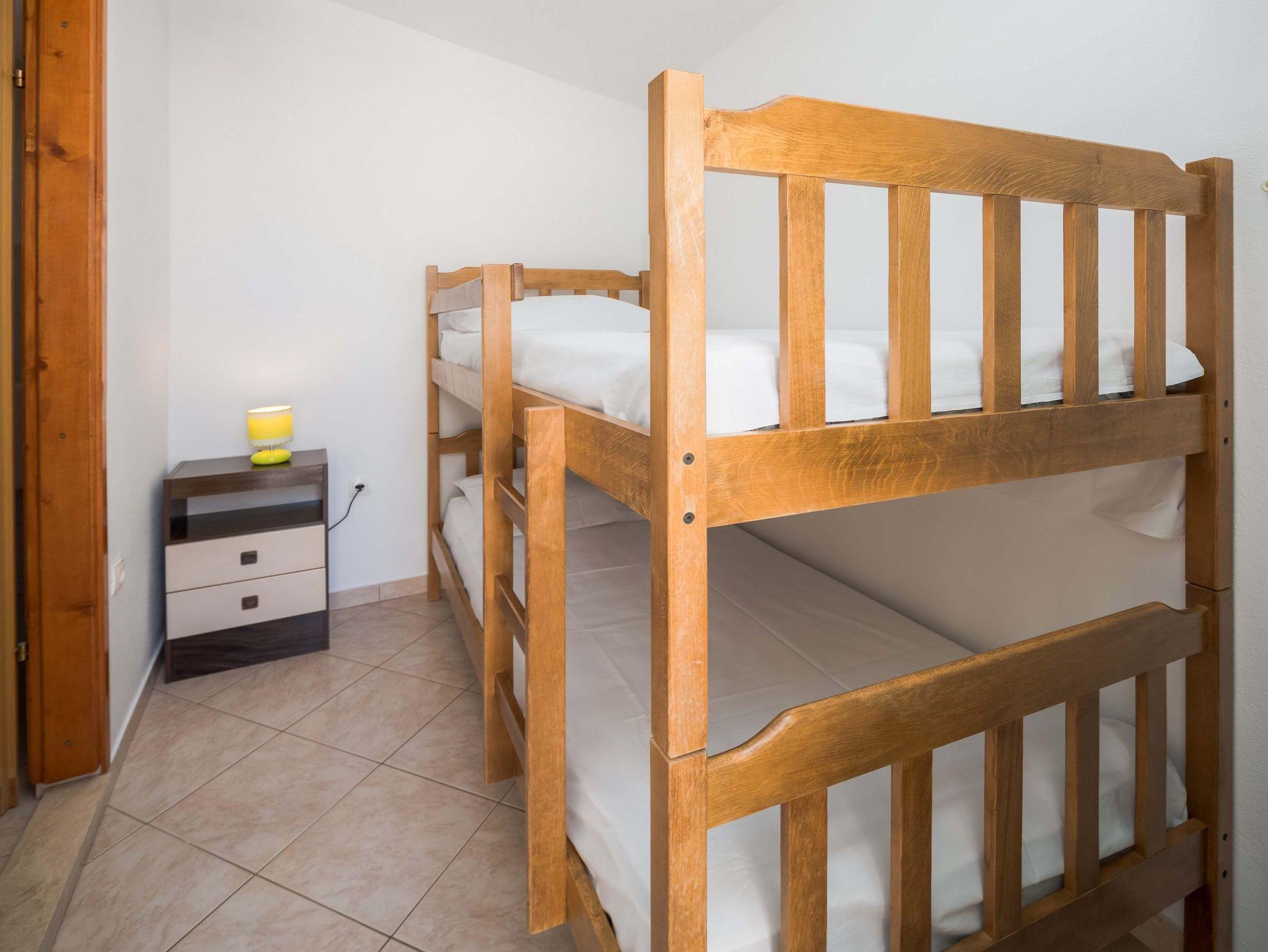 Ferienwohnung bietet Platz für 4 Gäste. Die Betten sind in Schlafzimmern, die es 2 gibt, innerhalb einer Gesamtfläche von 46m2, angeordnet. Die Gäste haben eine eigene Terrasse zur Verfügung, auf der sie in warmen Sommernächten genießen können. Das Apartment bietet Meerblick. IM PREIS INBEGRIFFEN: Kurtaxe, Endreinigung, Parkplatz, Internet, Kinderbett. VERBINDLICHE ZUSÄTZLICHE KOSTEN: Aufzahlung für Kurzaufenthalte (prozentualer Zuschlag pro Nächtigungsanzahl: 30% - 1, 20% - 2, 10% - 3). UNVERBINDLICHE ZUSÄTZLICHE KOSTEN: Klimatisierung (0,50 € pro Stunde), Zusatzbett (10,00 € pro Nacht). Die Verfügbarkeit zusätzlicher Dienstleistungen in Ihrem reservierten Termin und die Preise derselben (falls nicht aufgeführt) müssen im Voraus überprüft werden. Zusätzliche Dienstleistungen die in der Zahlungsaufforderung nicht aufgeführt sind werden direkt beim Vermieter bezahlt, angenommen der Gast nutzt auch diese.