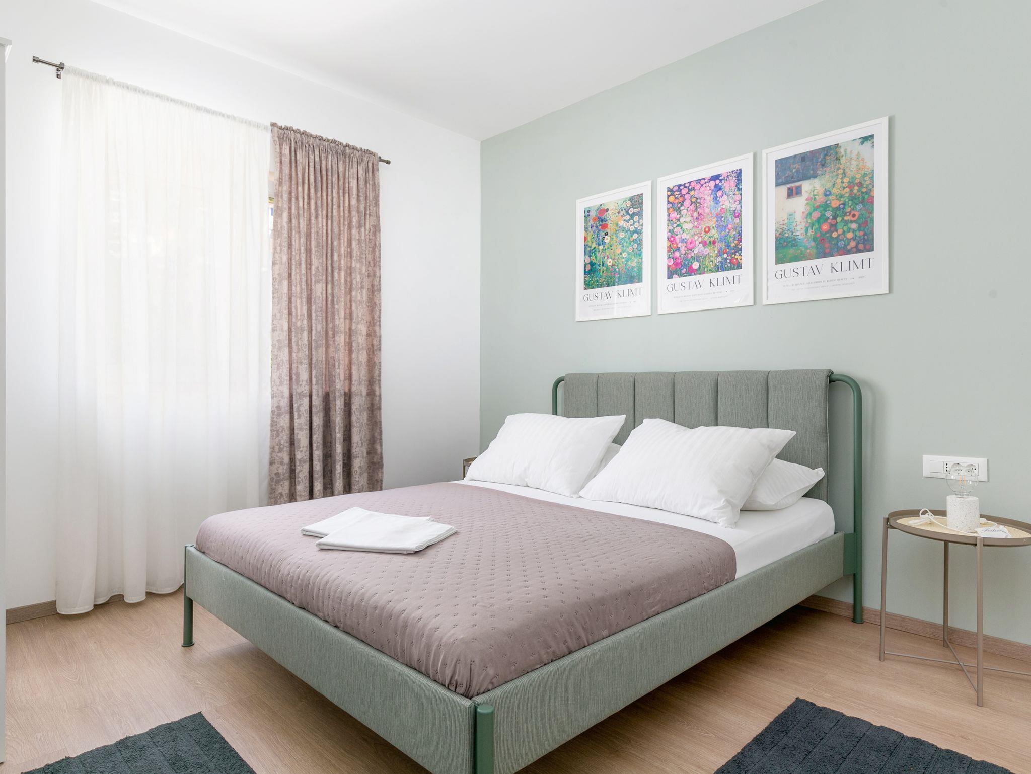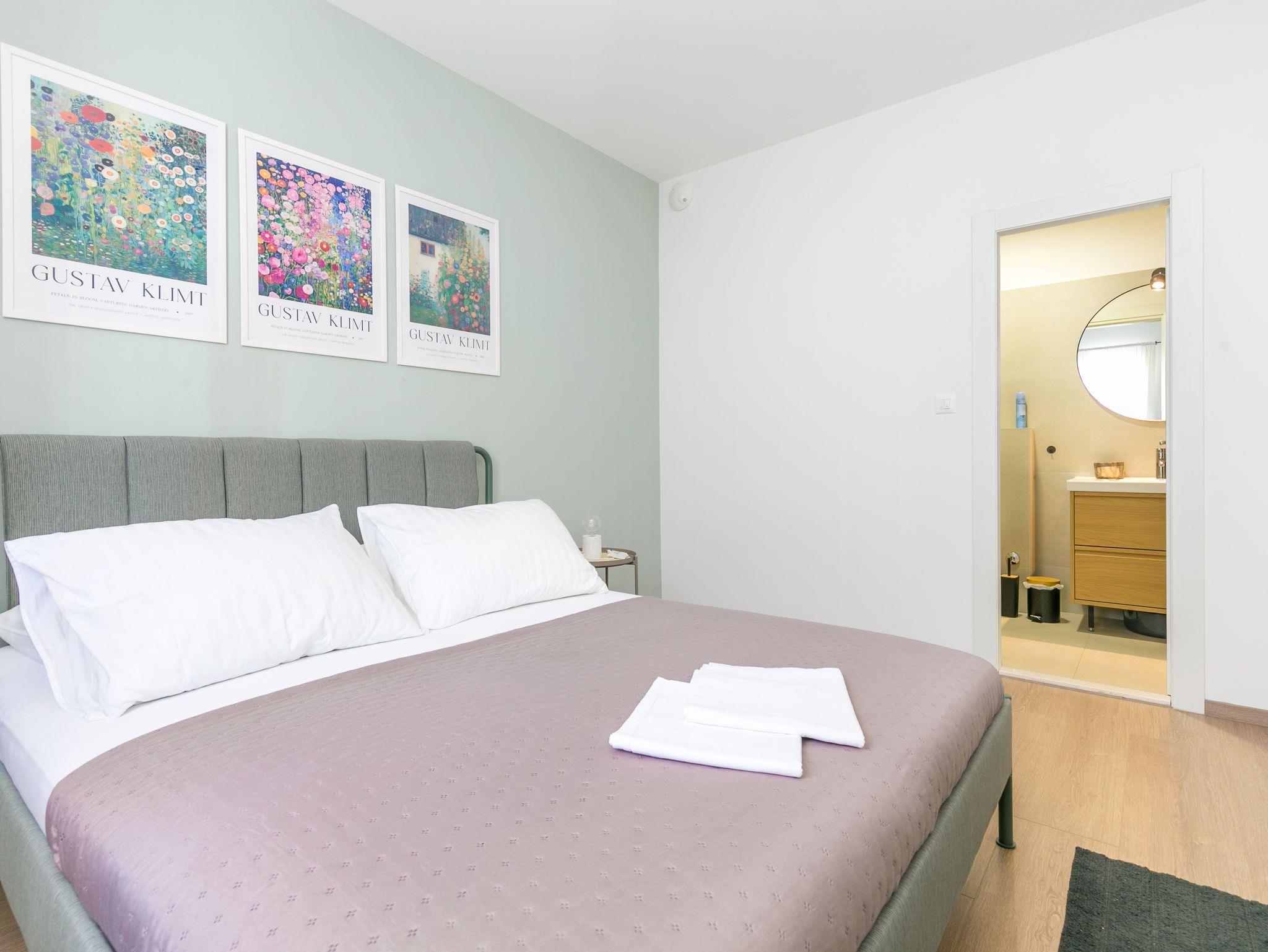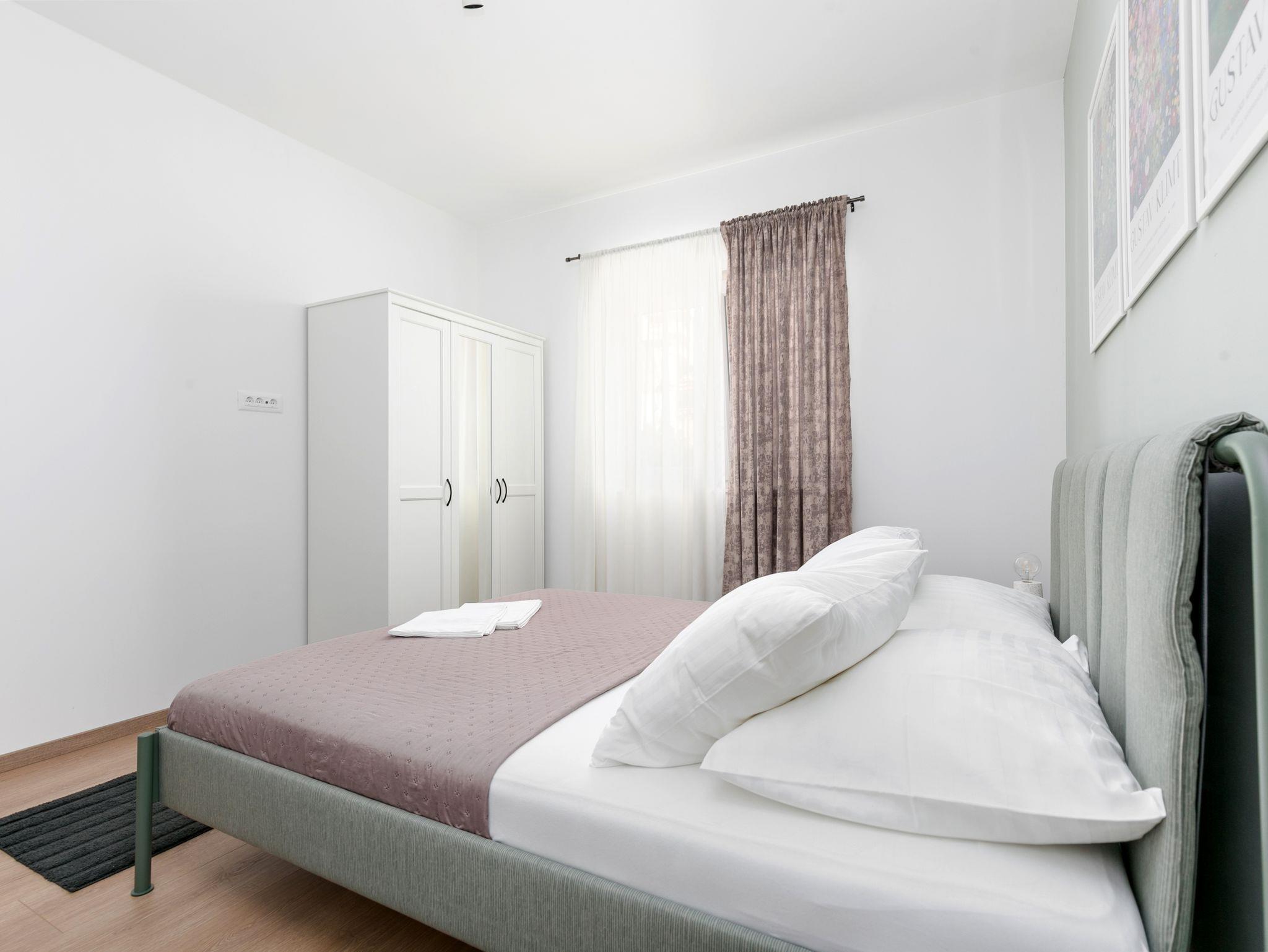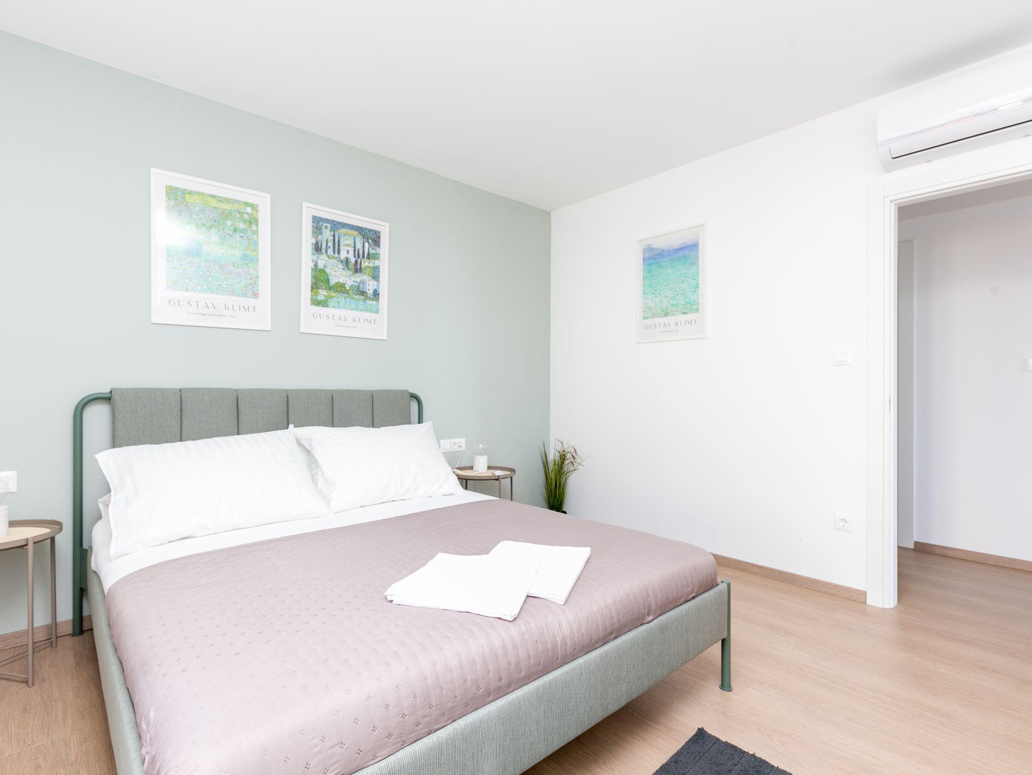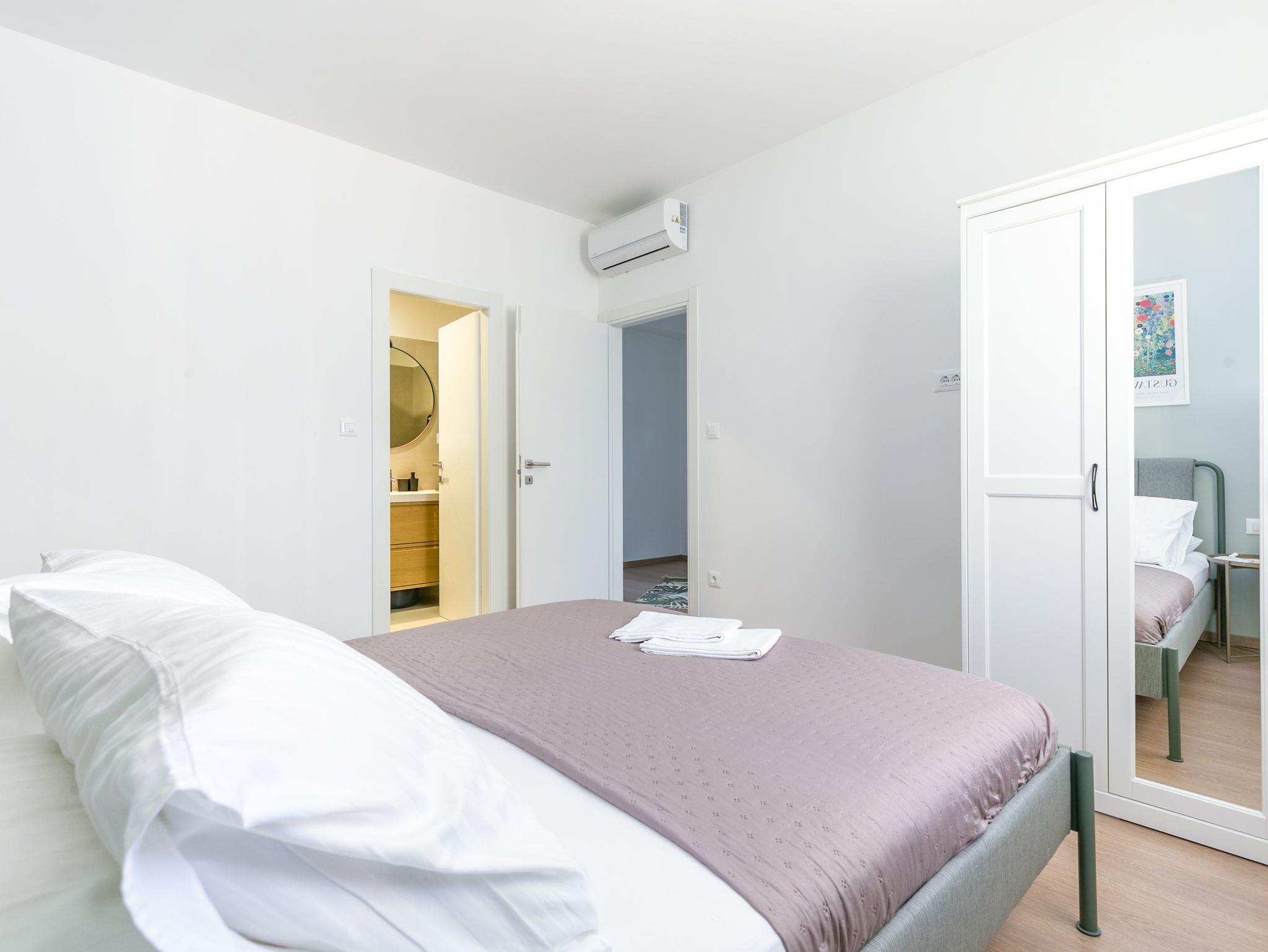 Ferienwohnung bietet Platz für 4 Gäste. Die Betten sind in Schlafzimmern, die es 2 gibt, innerhalb einer Gesamtfläche von 89m2, angeordnet. Die Gäste haben eine eigene Terrasse zur Verfügung, auf der sie in warmen Sommernächten genießen können. Das Apartment bietet Meerblick. Es ist erlaubt, Speisen auf dem Gemeinschafts-Grill vorzubereiten. IM PREIS INBEGRIFFEN: Kurtaxe, Endreinigung, Klimatisierung, Parkplatz, Internet, Bügeleisen, Bügelbrett, Föhn, 2 Kinderbettchen (im Preis enthalten). VERBINDLICHE ZUSÄTZLICHE KOSTEN: Aufzahlung für Kurzaufenthalte (prozentualer Zuschlag pro Nächtigungsanzahl: 30% - 1, 20% - 2, 10% - 3). Die Verfügbarkeit zusätzlicher Dienstleistungen in Ihrem reservierten Termin und die Preise derselben (falls nicht aufgeführt) müssen im Voraus überprüft werden. Zusätzliche Dienstleistungen die in der Zahlungsaufforderung nicht aufgeführt sind werden direkt beim Vermieter bezahlt, angenommen der Gast nutzt auch diese.