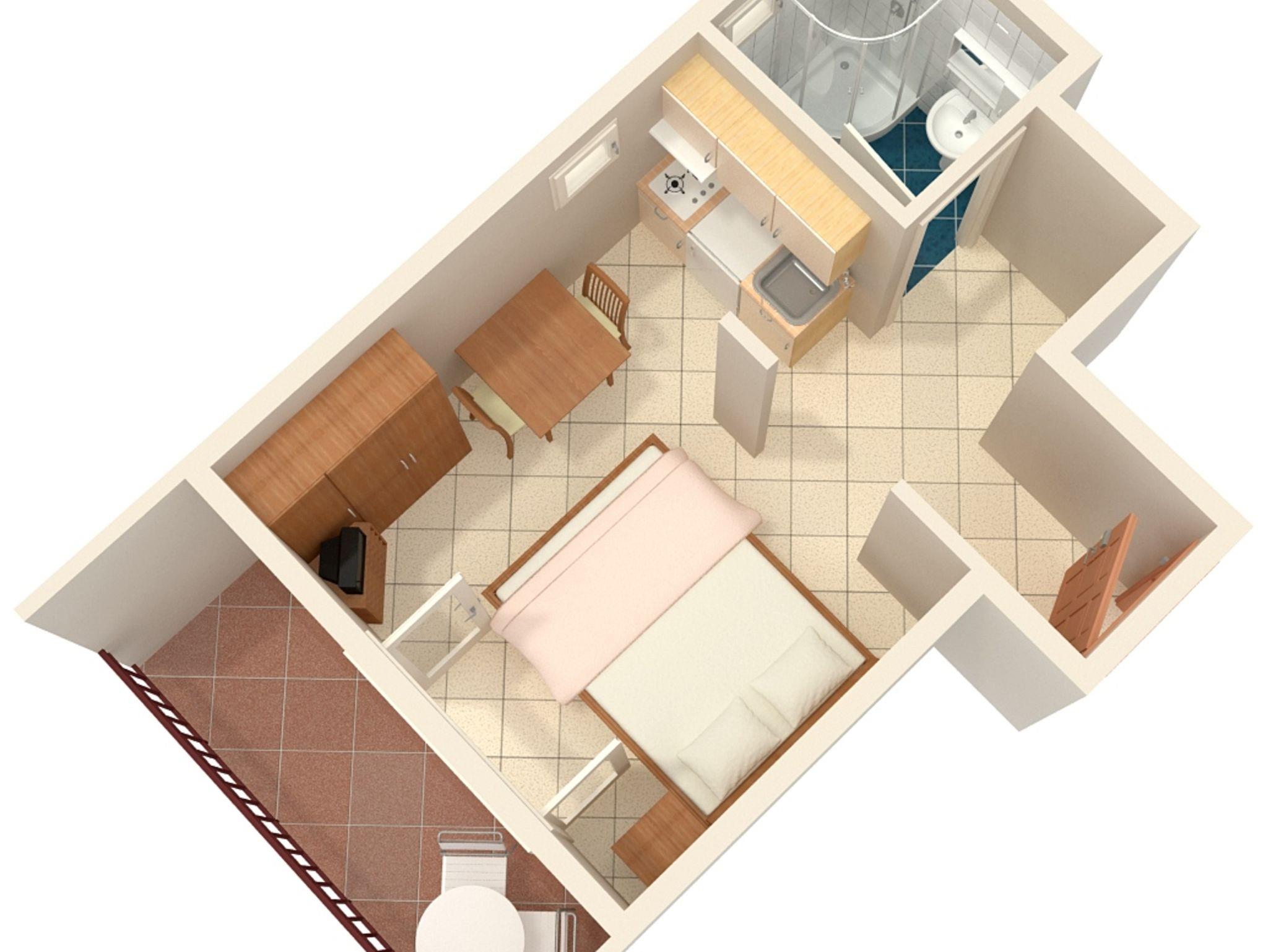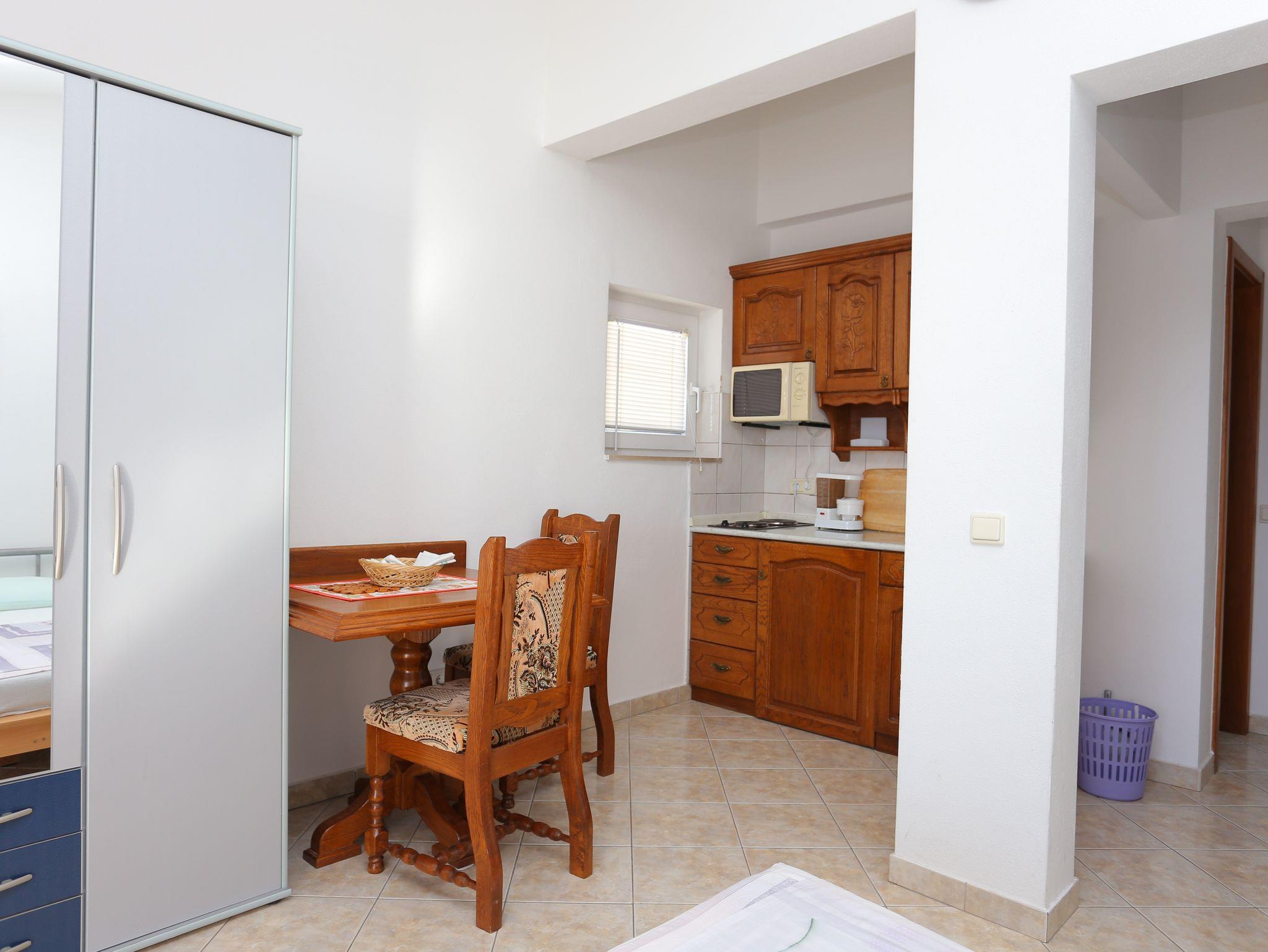 Studio bietet Platz für 2 Gäste. Die Betten sind in Schlafzimmern, die es 1 gibt, innerhalb einer Gesamtfläche von 19m2, angeordnet. Die Gäste haben einen eigenen Balkon zur Verfügung, auf der sie in warmen Sommernächten genießen können. Das Studio-Apartment bietet Meerblick. Es ist erlaubt, Speisen auf dem Gemeinschafts-Grill vorzubereiten. IM PREIS INBEGRIFFEN: Kurtaxe, Endreinigung, Parkplatz, Internet, Kinderbett, Bügeleisen, Bügelbrett, Föhn, tragbarer Grill. VERBINDLICHE ZUSÄTZLICHE KOSTEN: Aufzahlung für Kurzaufenthalte (prozentualer Zuschlag pro Nächtigungsanzahl: 30% - 1, 20% - 2, 10% - 3). UNVERBINDLICHE ZUSÄTZLICHE KOSTEN: Klimatisierung (5,00 € pro Nacht), Wäschewaschen (5,00 € Waschen). Die Verfügbarkeit zusätzlicher Dienstleistungen in Ihrem reservierten Termin und die Preise derselben (falls nicht aufgeführt) müssen im Voraus überprüft werden. Zusätzliche Dienstleistungen die in der Zahlungsaufforderung nicht aufgeführt sind werden direkt beim Vermieter bezahlt, angenommen der Gast nutzt auch diese. Ermäßigung auf den Grundpreis: Gratistag 14=13 (bei einem Aufenthalt von 14 Tagen oder mehr erhalten Sie einen Gratistag für den Aufenthalt bis 31.12.26).