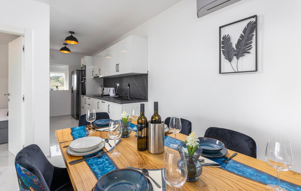 Velkommen til denne moderne lejlighed, der har en fantastisk beliggenhed ved havet, og hvor I får de bedst tænkelige rammer for en ferie med fred, sol og masser af vand. Indretningen fremtræder elegant og stilsikkert med et vellykket mix af det rustikke og det moderne. Lokalerne får et dejligt lysindfald gennem de mange vinduespartier, der samtidig giver en fantastisk udsigt over havet og landskabet. Efter en begivenhedsrig dag kan I sætte jer godt til rette i spabadet eller svede igennem i saunaen, som deles med de andre gæster.