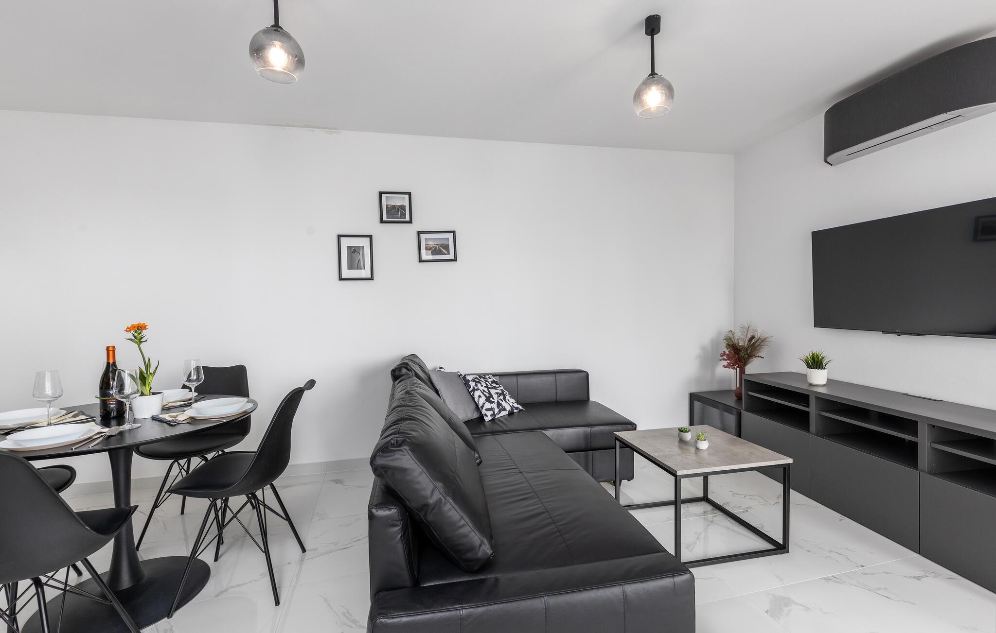 Velkommen til denne moderne lejlighed, der har en fantastisk beliggenhed ved havet, og hvor I får de bedst tænkelige rammer for en ferie med fred, sol og masser af vand. Indretningen fremtræder elegant og stilsikkert med et vellykket mix af det rustikke og det moderne. Lokalerne får et dejligt lysindfald gennem de mange vinduespartier, der samtidig giver en fantastisk udsigt over havet og landskabet. Efter en begivenhedsrig dag kan I sætte jer godt til rette og svede igennem i saunaen, som deles med de andre gæster.