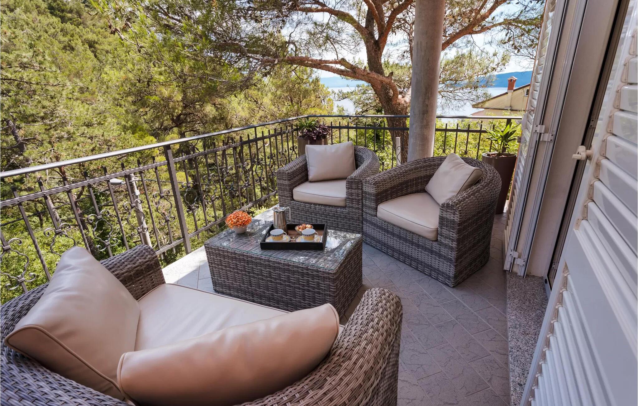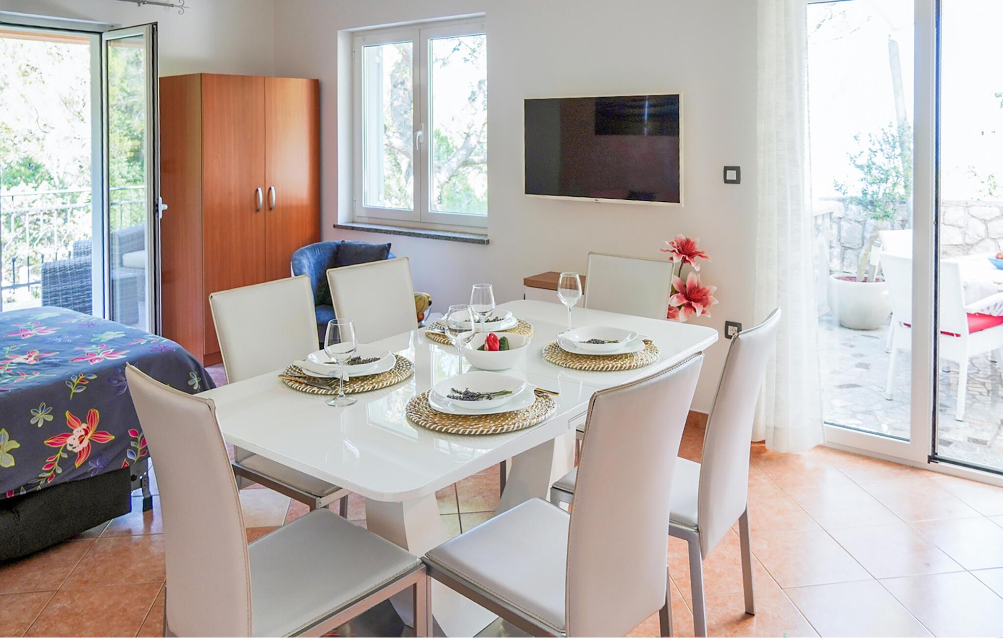 Tilbring en afslappende ferie i denne komfortable lejlighed med smuk havudsigt. Nyd at slappe af i den praktisk indrettede opholdsstue efter en dag på stranden. Indretningen er indbydende og fyldt med naturligt lys. Brug den åbne spisestue til fælles måltider eller rolige aftener med spil og stimulerende samtaler. Åbn altandørene og lad den rolige atmosfære skylle over jer. Gå udenfor og nyd udsigten over havet og de grønne omgivelser. Nyd en kop kaffe her, eller afslut dagen med et glas vin. Udnyt den fredelige beliggenhed til afslappende timer udenfor. Omgivet af træer og natur kan I tilbringe afslappende aftener langt fra byens travlhed. Den korte gåtur til indkvarteringen gør spontane ture til stranden mulige når som helst. Udforsk området omkring Brsec, en charmerende by med udsigt over Kvarnerbugten. Slentr gennem den historiske gamle bydel med dens stenhuse og udsigtspunkter. Gå ned til Klancac-stranden, kun en kort gåtur væk, som betragtes som en af de smukkeste strande i Kroatien. Tilbring dage med at svømme i det klare vand eller udforske kysten til fods. Tag på udflugter langs kystvejen til Mošcenicka Draga eller Opatija.
