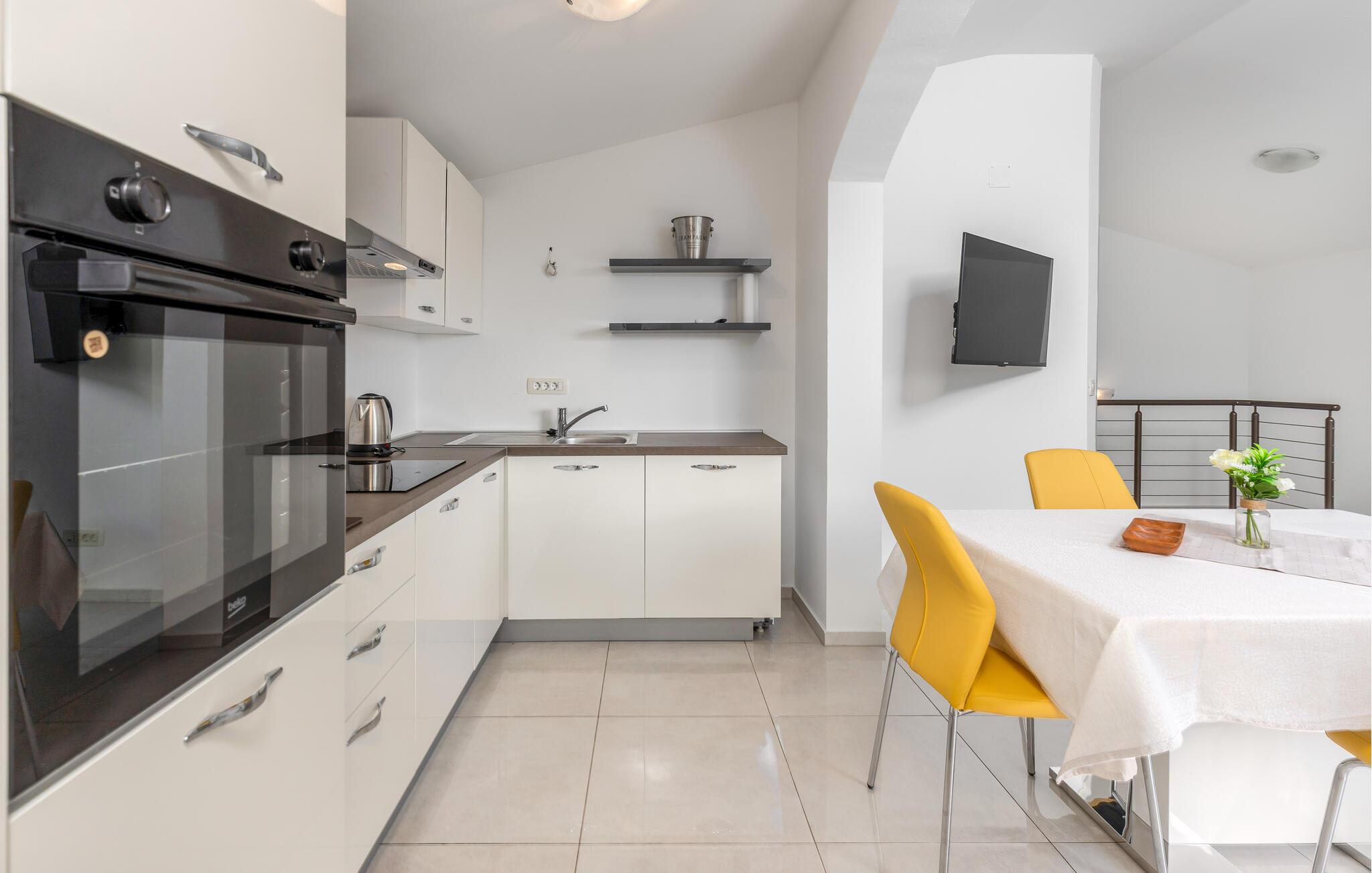 Beliggende i de grønne bakker syd for Dobrec inviterer dette komfortable feriehus jer til at tilbringe afslappende dage og forkæler jer med fortryllende udsigter helt ned til havet. Tilbered middelhavsretter i det åbne køkken og nyd den friske, beroligende atmosfære over afslappede måltider. Efter en lang dag kan I streame en film eller slappe af på den behagelige sofa med en god bog.