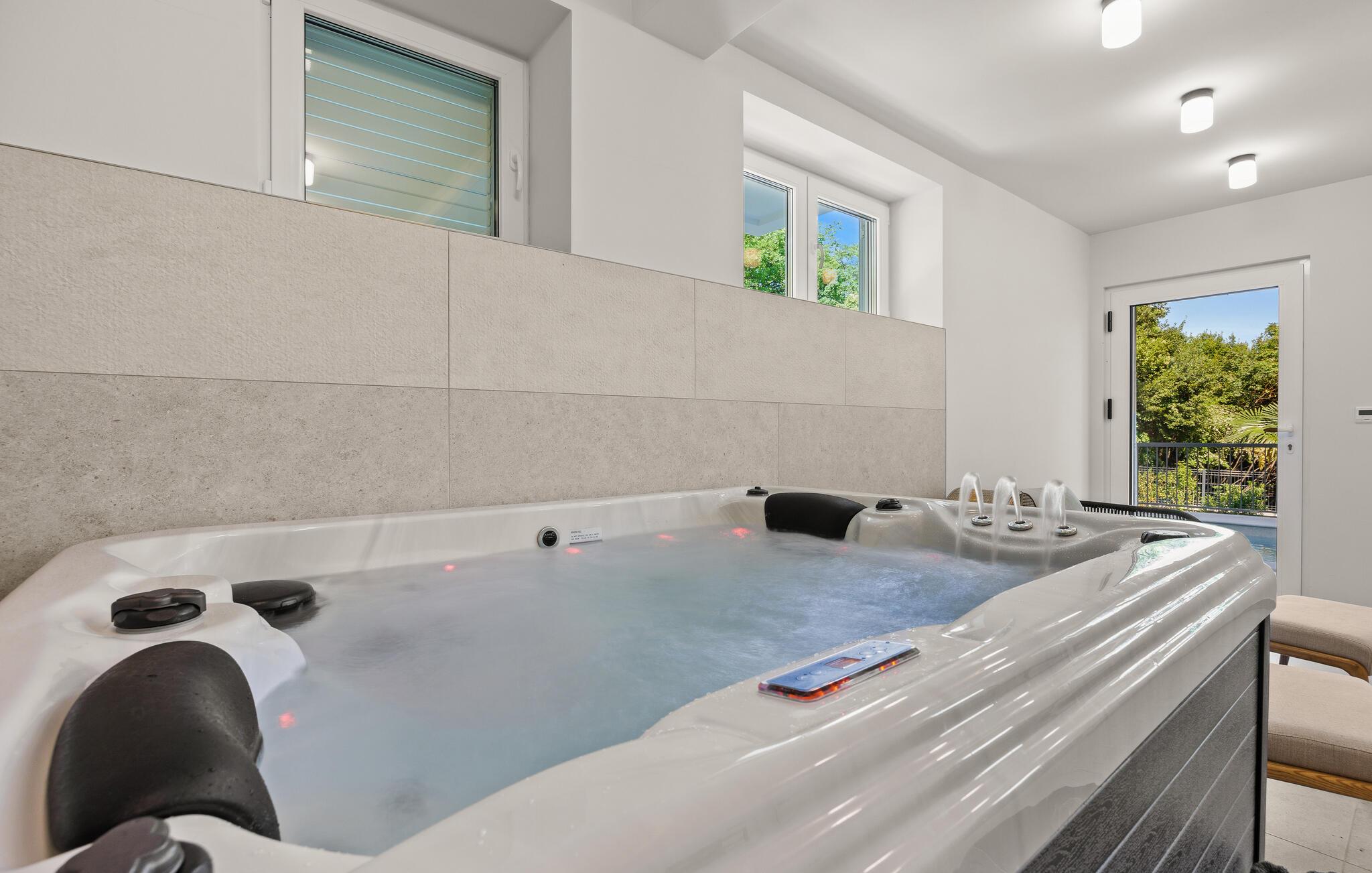 Nyd en afslappende wellness-ferie i dette feriehus med pool, sauna og spabad. Kun få skridt fra stranden tilbyder dette moderne feriehus, udstyret med charmerende ekstraudstyr, de perfekte rammer for en forfriskende pause med venner eller familie. Indenfor skaber smagfulde møbler en behagelig atmosfære, ideel til at nyde harmoniske måltider, stimulerende samtaler og hyggelige spilleaftener. Udfordr hinanden ved poolbordet, stream jeres yndlingsserie, eller forkæl jer selv med øjeblikke med skøn afslapning i saunaen og spabadet. Det frodige udendørsområde lokker med en pragtfuld pool, hvor I kan forfriske jer fra morgen til aften. Slap af på en liggestol, snak over et glas vin i loungen, og nyd lune sommeraftener med lækre grillmad. Udforsk Opatijas historiske centrum med dets elegante villaer og botaniske haver, tag en bådtur til øerne Krk eller Rab, og snorkel i rolige bugter med krystalklart vand. Besøg charmerende kystbyer som Lovran og Icici, og prøv lokale specialiteter i traditionelle konobas (taverner).