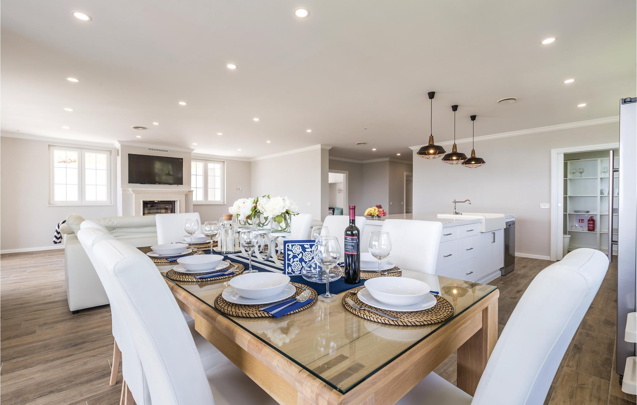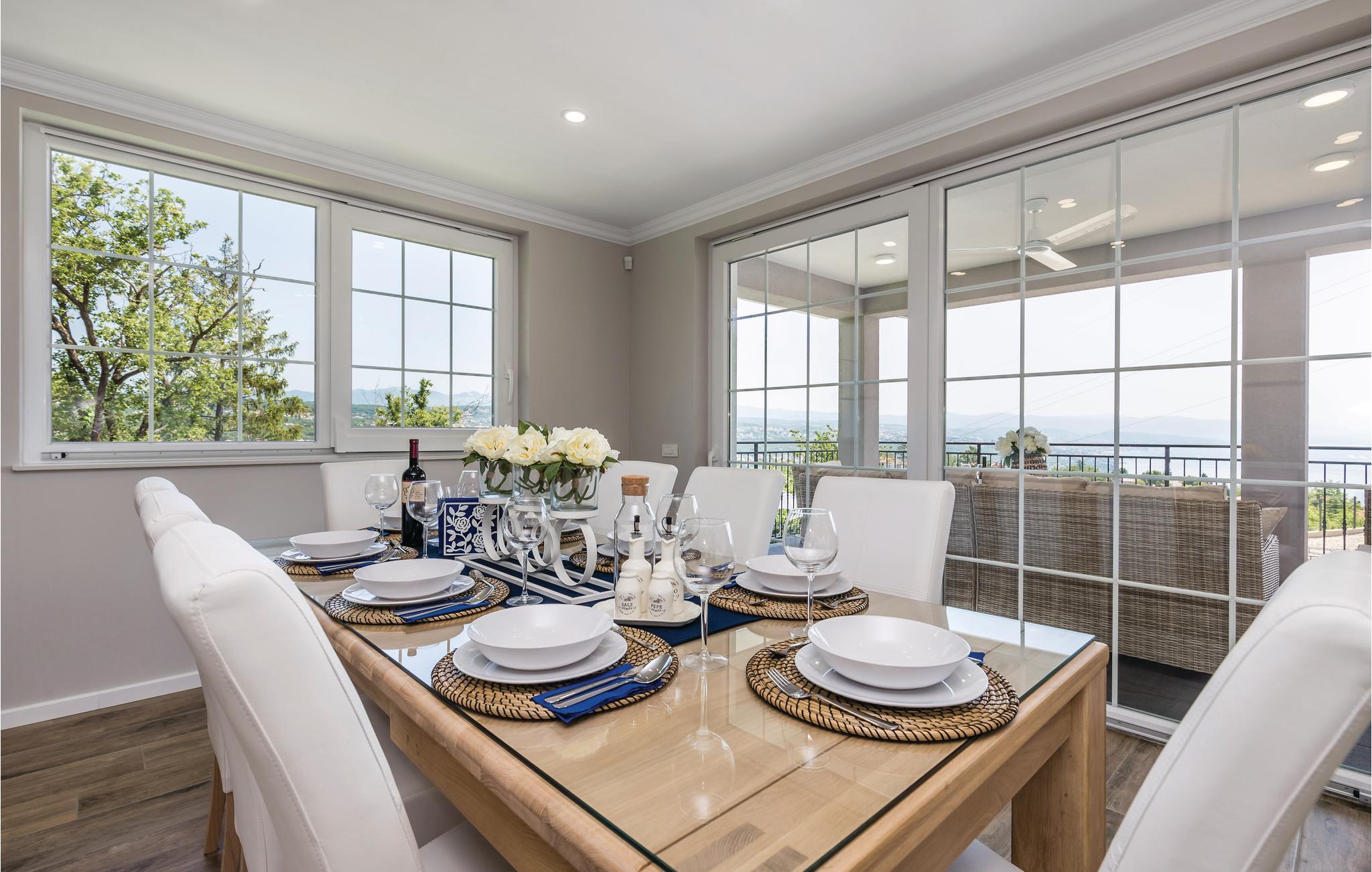 Dette fantastiske feriehus ligger ved foden af bjerget Ucka og over den smukke kystby Opatija. Det ligger i udkanten af en skov, langt væk fra byens støj, i Matulji, hvor I kan slappe af og genvinde kræfterne. Det stilfulde feriehus ligger på en 3000 m² stor og indhegnet grund. Husets store vinduer, der lukker lyset ind og giver en fornemmelse af at være tæt på naturen. Udendørs er der privat pool, liggestole og grill til nem og lækker madlavning. Huset er fordelt på to etager. I stueetagen er der stue med billard, soveværelse, badeværelse og stue, mens spisekøkken, fire soveværelser, to badeværelser og et separat bryggers med vaskemaskine mv. ligger ovenpå. Aktive feriegæster kan udforske området på cykel- og vandrestier. Det tager kun få minutters kørsel at komme til Opatija, med mange restauranter, barer og strande. Den ca. 12 km lange promenade inviterer til gåture. Parkering i garagen.