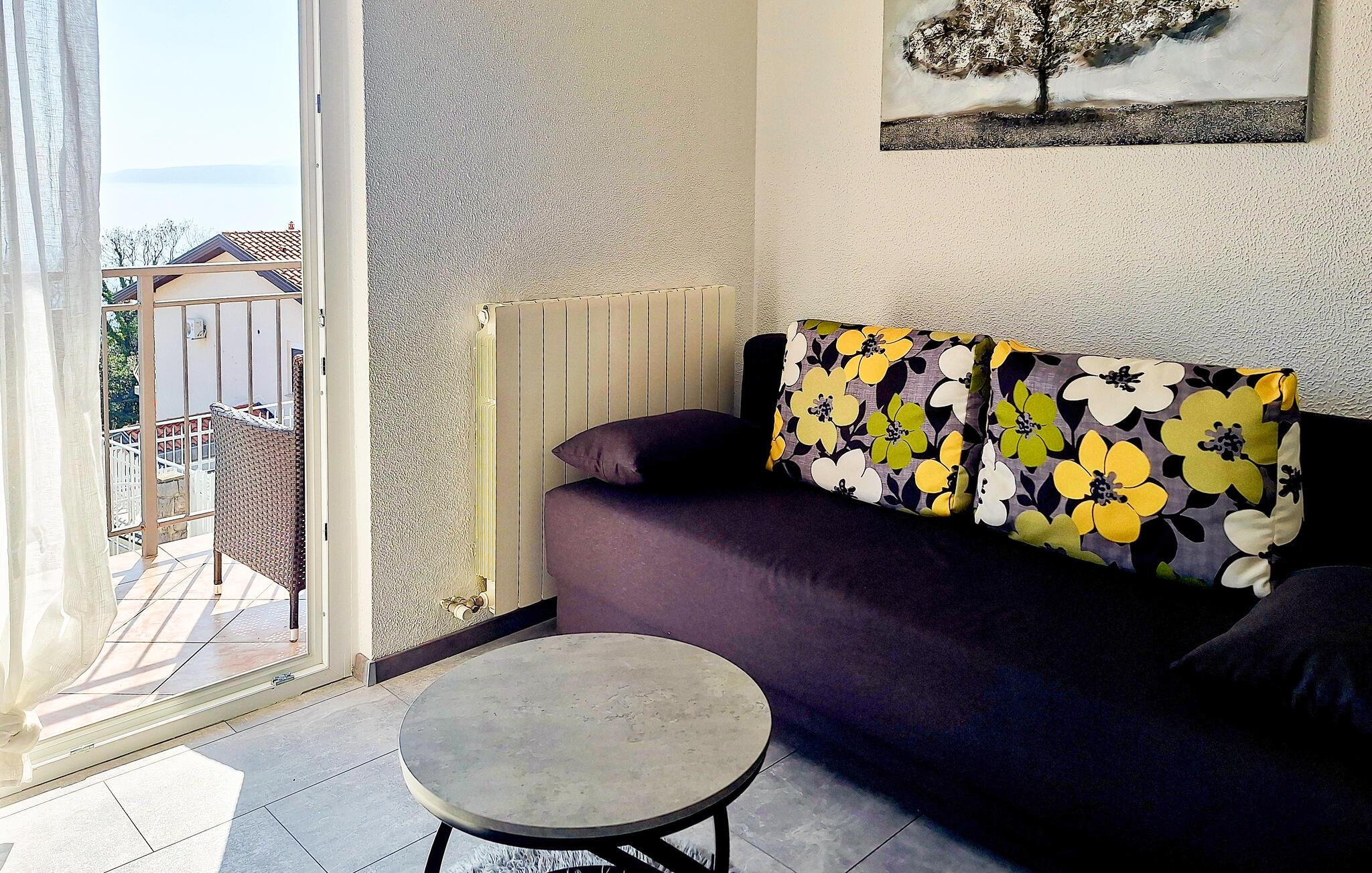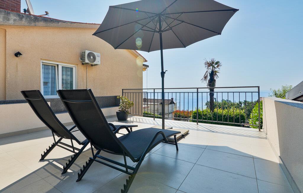 Denne skønne lejlighed har to soveværelser og er derfor velegnet til et par med børn. Den er udstyret til et behageligt og behageligt ophold, og I kan glæde jer til at træde ud på den smukke altan med panoramaudsigt over det blå hav, byerne Rijeka og Opatija og Kvarnerbugtens-øer. Udsigten til havet kan nydes fra stuen og det ene soveværelse. I indgangspartiet er der en dejlig stor overvejende lukket terrasse, og I har desuden en ekstra åben terrasse med 2 liggestole. Tilbered lækre ferieretter på grillen og nyd den smukke natur, mens I spiser og deler dagens indtryk og højdepunkter.