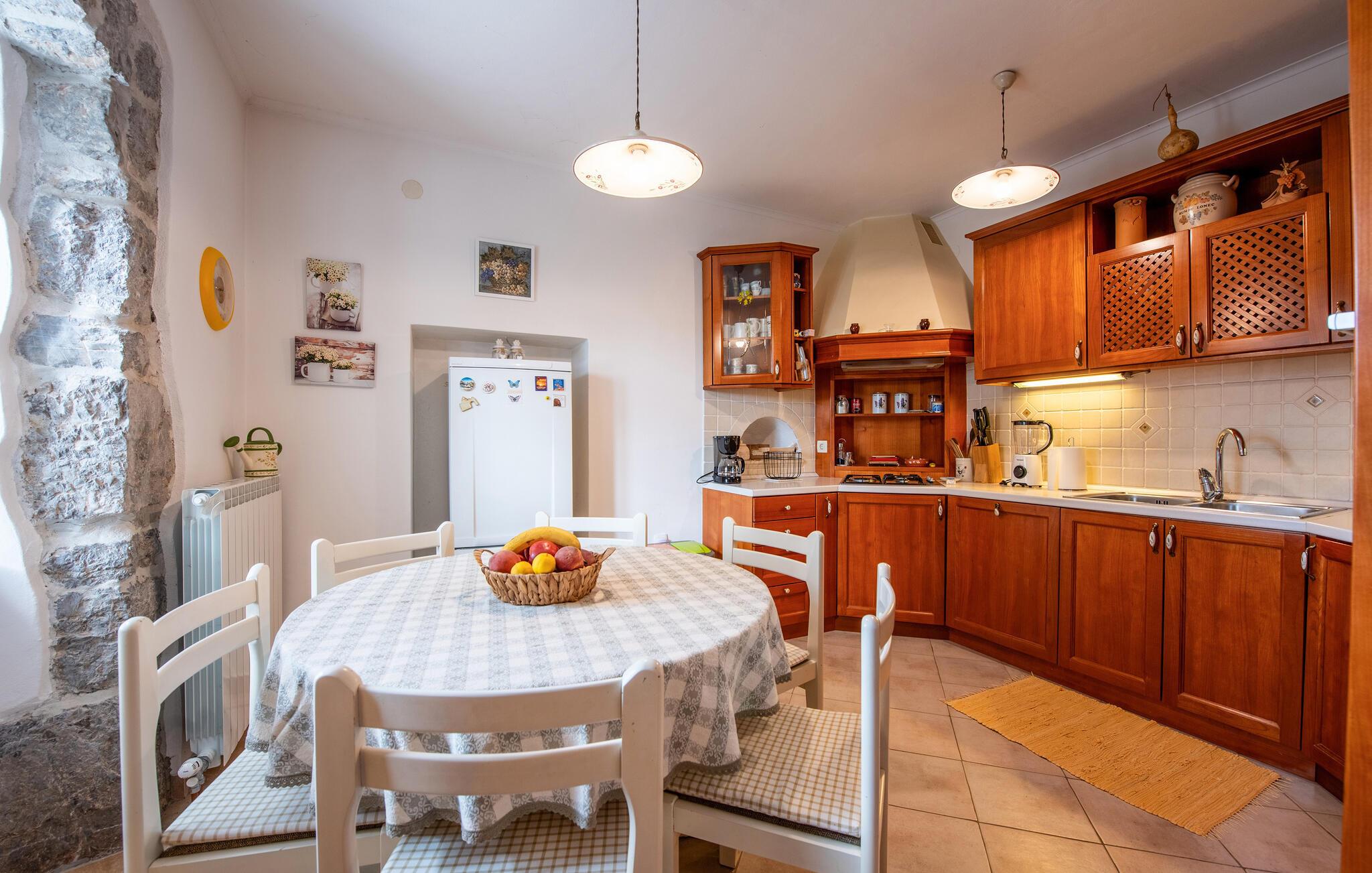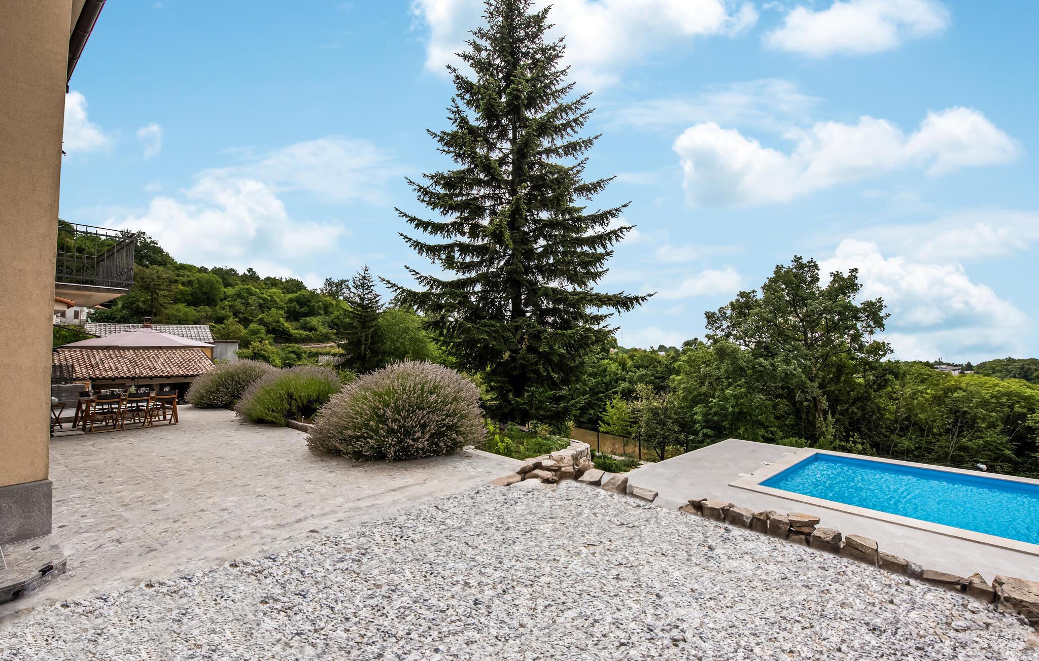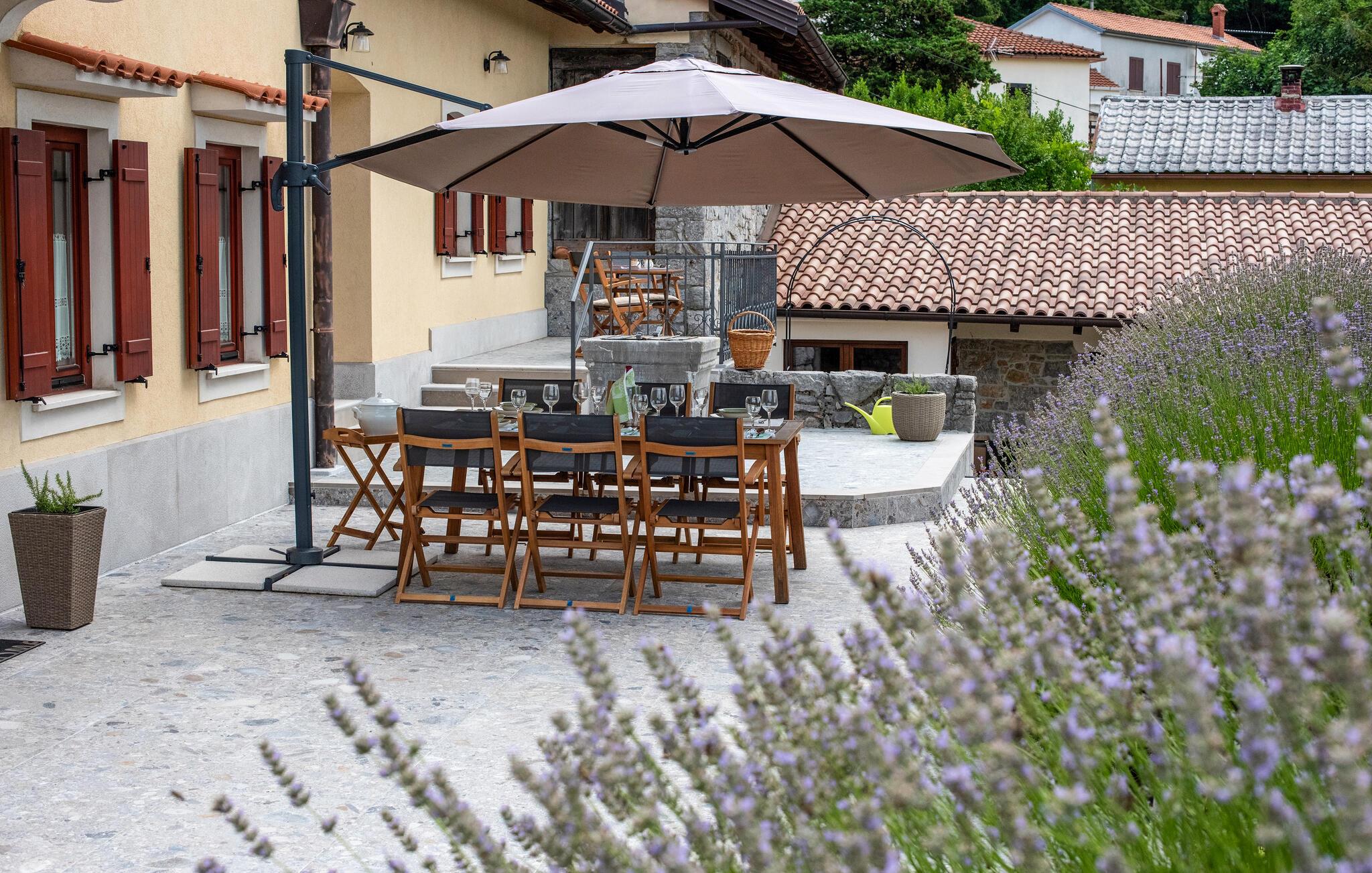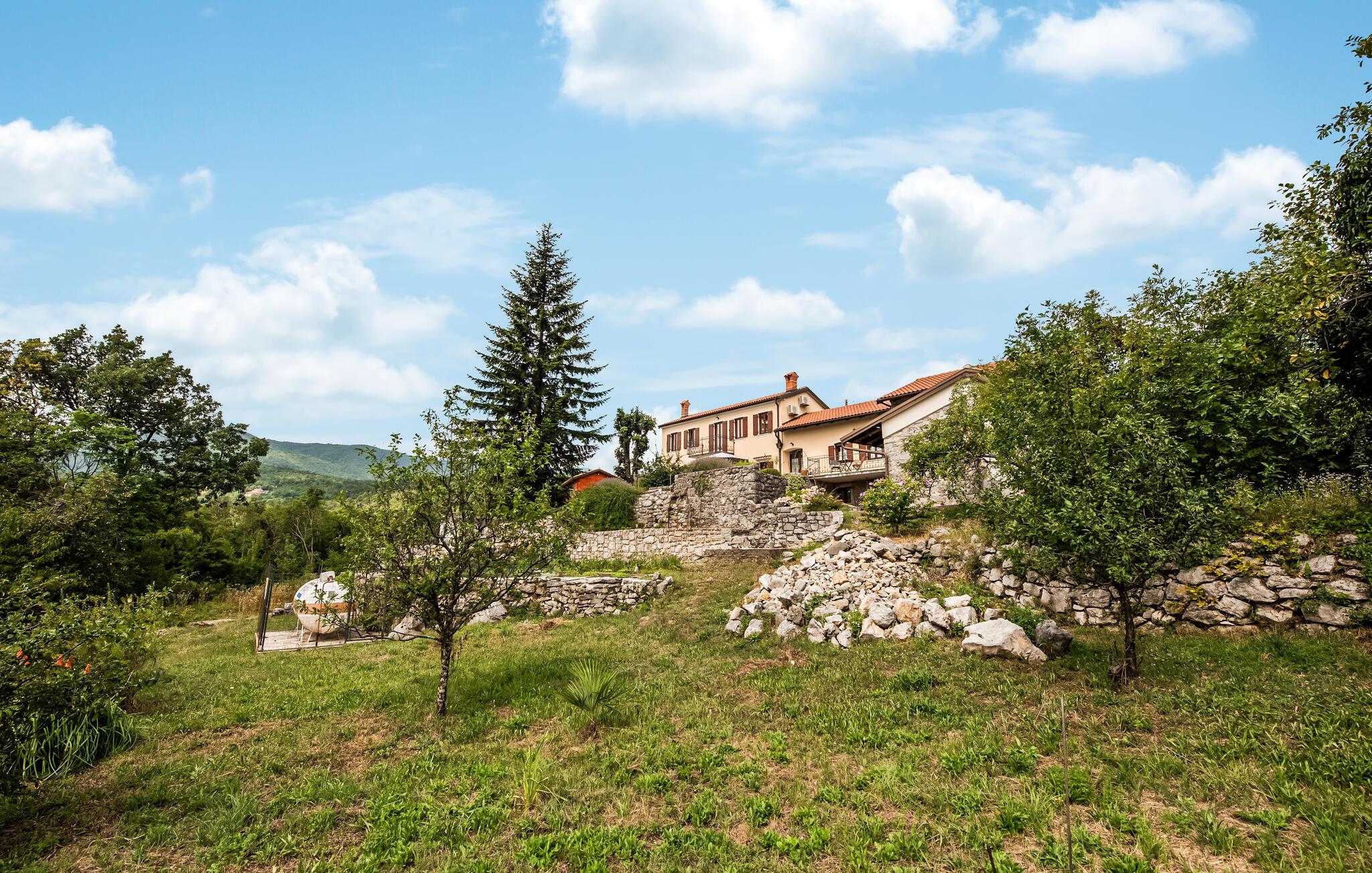Denne charmerende ferievilla ligger i den idylliske landsby Jusici, kun nogle få kilometer fra kystbyen Opatija. På den rummelige grund kan I nyde naturens fred og ro og finde jeres egen oase. Der er plads nok til alle, uanset om I rejser med familie eller venner. Nyd muligheden for at begynde hver dag med en frisk svømmetur i den udendørs pool, som ligger lige ved siden af huset. Tilbered lækre grillretter på den store terrasse til frokost eller middag. Nyd de smukke ferieøjeblikke ved at spise sammen udendørs, mens I mærker sommerbrisen.