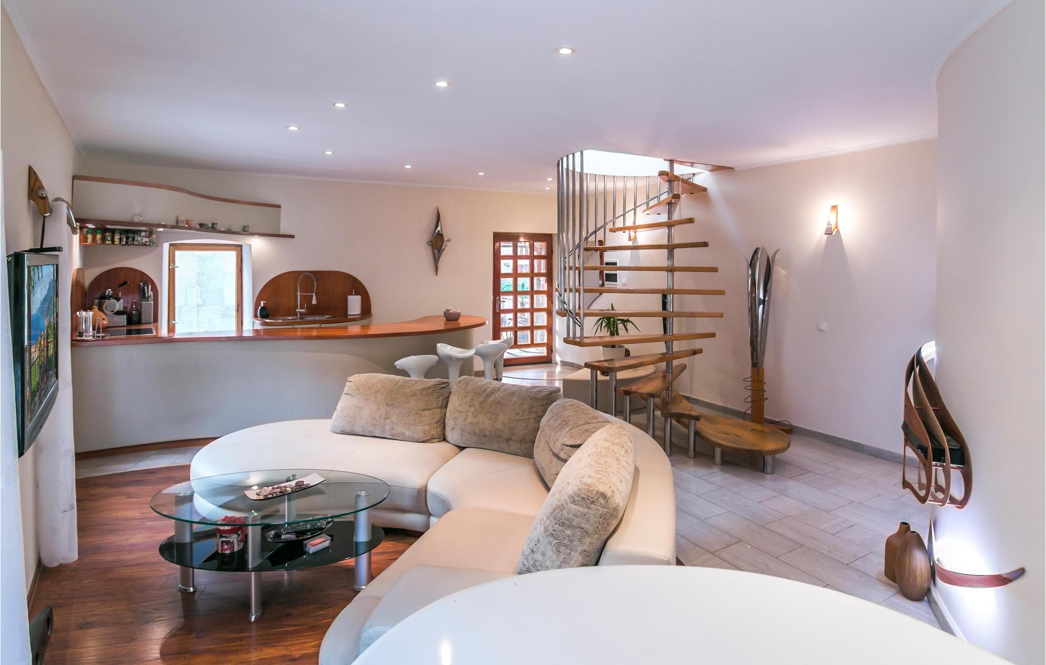 Denne rummelige lejlighed ligger i gågaden og imponerer med sin charme. Den består af et køkken og stue, badeværelse og en vindeltrappe, der fører til soveværelset. Ferielejlighedens blidt afrundede linjer og usædvanlige former er en fryd for øjnene.