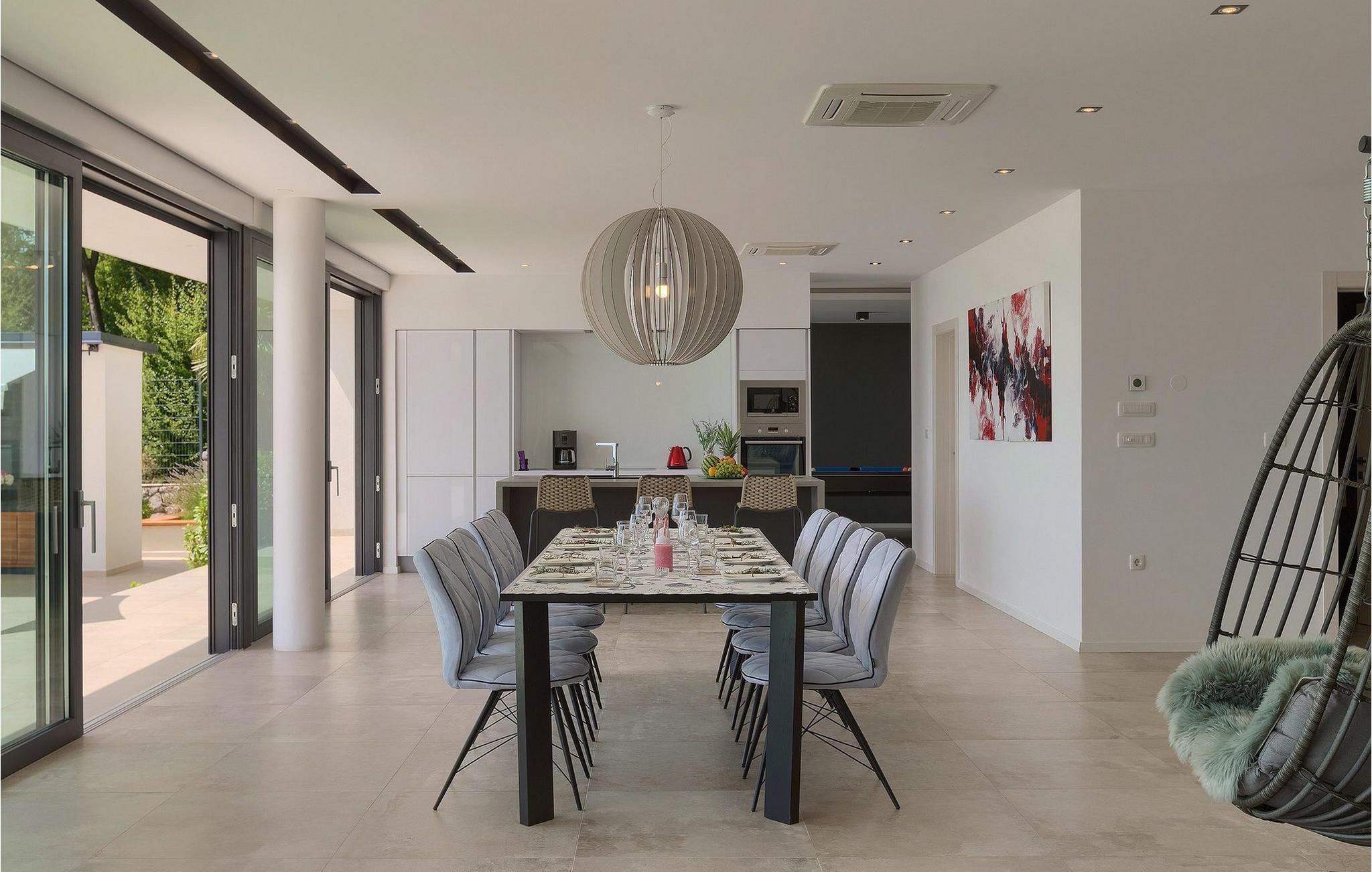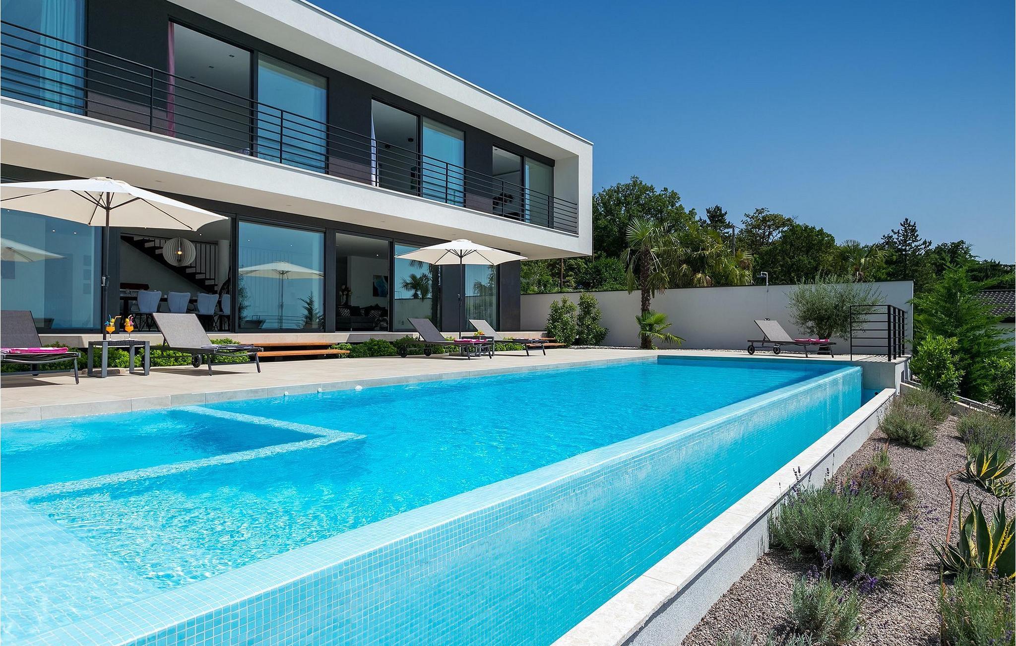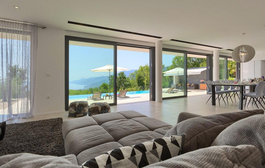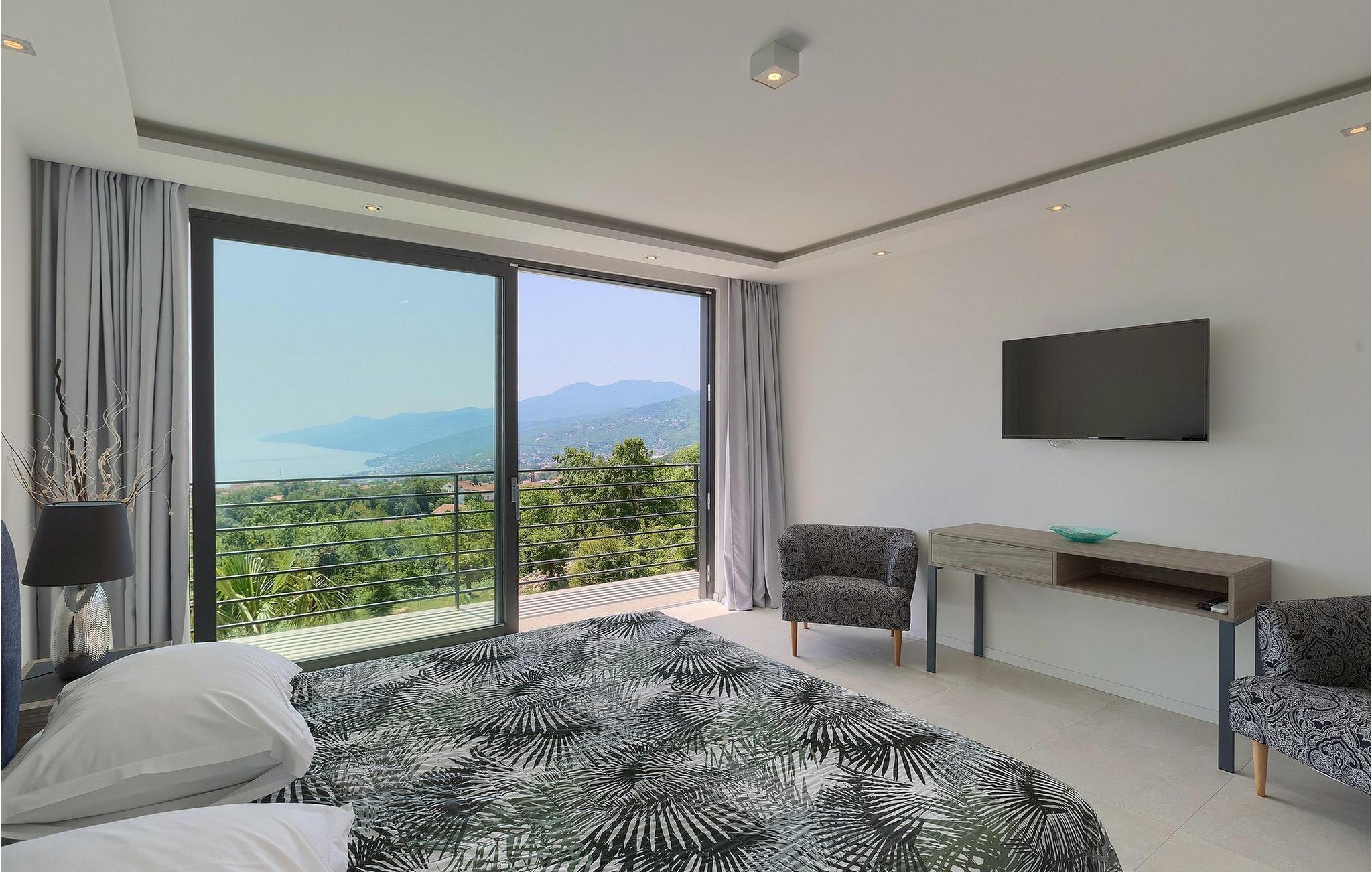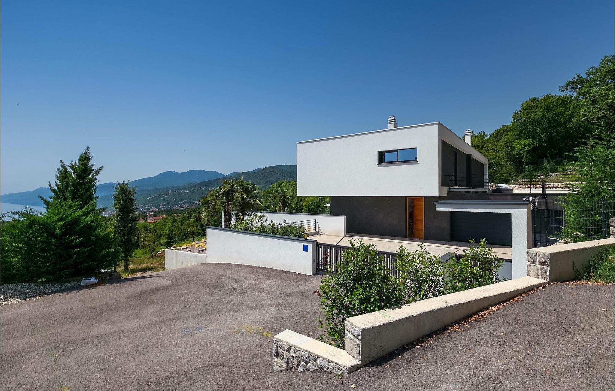 Denne fantastiske villa vil forbløffe dig med sit moderne design og sin fantastiske havudsigt, med udsigt over Opatija og Kvarner-bugten. Villaen ligger på en 1400 m2 stor grund og består af 4 soveværelser, alle beliggende på øverste etage og med eget badeværelse, tv og aircondition, hvilket gør det til et perfekt feriehus, der byder på optimal komfort for 8 gæster. Stueetagen er et meget stilfuldt indrettet åbent rum, der består af spise- og opholdsstue og et rummeligt fuldt udstyret køkken. Her er også et separat værelse med jacuzzi, bruser og sauna samt et værelse med poolbord til lidt mere underholdning. Stuen er forbundet direkte til terrassen, hvor du kan nyde den drømmeagtige udsigt fra den private pool eller fra det hyggelige loungeområde. En udendørs spiseplads med kulgrill er også til din rådighed. Denne funktionelle villa tilbyder alt, hvad du behøver for en afslappende og sjov ferie, mens beliggenheden giver dig mulighed for at opdage alle skønhederne i Kvarner-regionen. Denne smukke villa er beliggende nær den lille by Kastav, kun ca. 6 km fra Opatija og 10 km. fra Rijeka. Rijeka er kendt som Kroatiens største havn, men også for sine mange restauranter, caféer, klubber, barer og arrangementer. Oplev bystemningen ved at gå en tur langs Korzo, udforske den gamle bydel og besøge helligdommen i Trsat på en bakke over byen Rijeka. Gå ikke glip af karnevallet i Rijeka, et af de fem største karnevaler i verden! Lufthavnen Rijeka ligger på øen Krk, kun en kort køretur fra villaen. For større oplevelse, tag en tur ned ad den smukke havnefront 'Lungo mare' og nyd romantiske solnedgangsture rundt i byen Opatija - kendt som "Adriaterhavets perle".