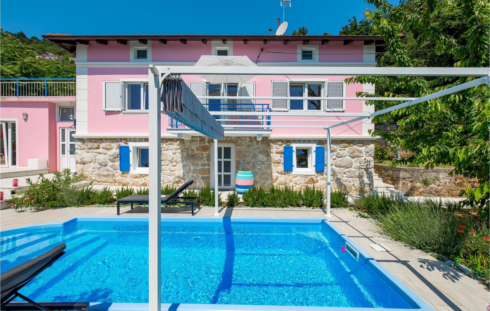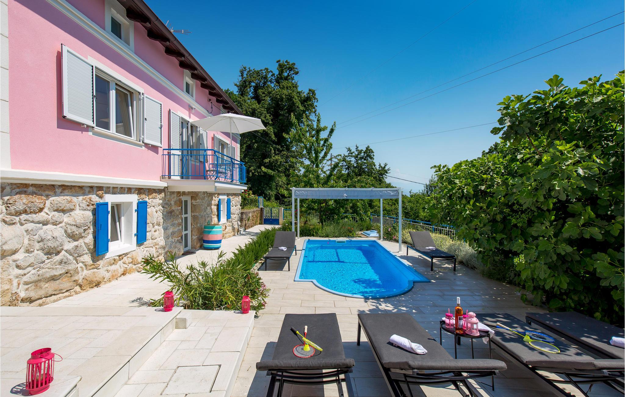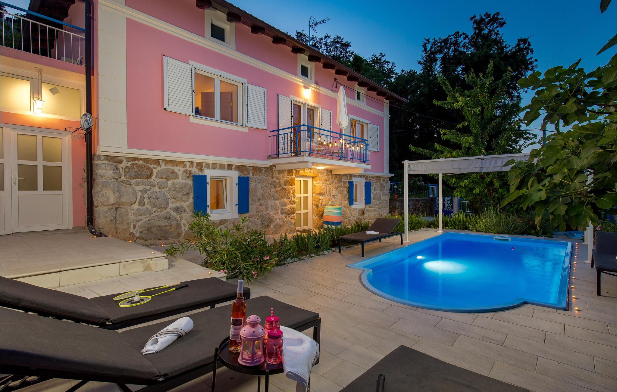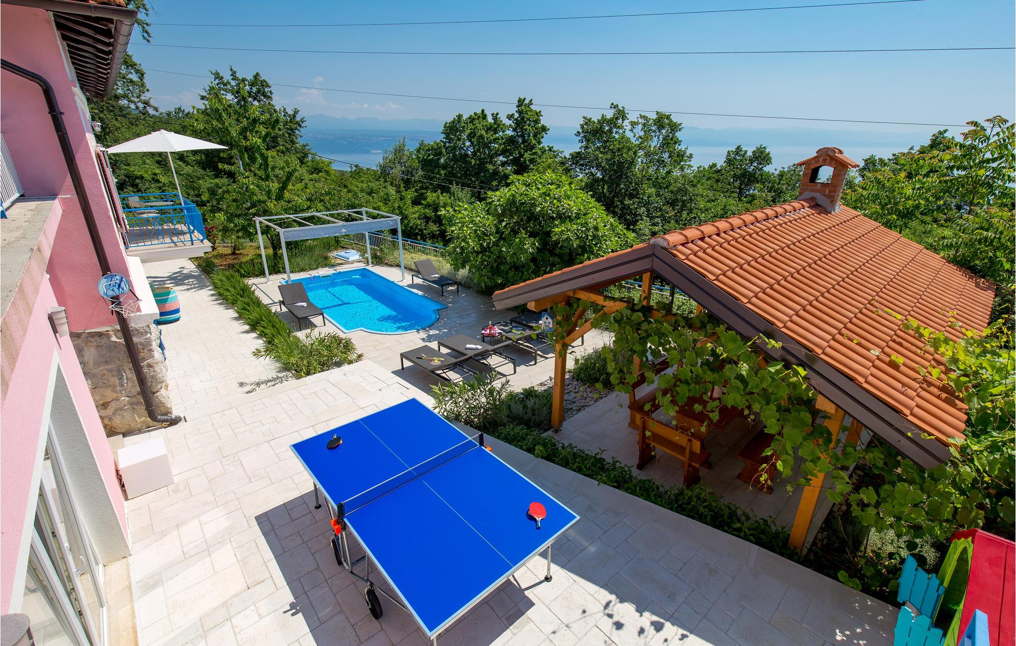 Tilbring en uforglemmelig ferie i dette renoverede feriehus med pool i den charmerende kystby Lovran ved Opatijas riviera. Det ligger på en stor grund over Lovran, med en flot panoramaudsigt over havet fra øverste etage. Huset består af to etager, som er forbundet med en udvendig trappe. På hver etage er en fuldt udstyret lejlighed, og derfor er denne feriebolig ideel til to familier, der ønsker at rejse sammen, samtidig at kunne bevare privatlivets fred. I haven er der to rummelige terrasser, en grill og en udendørs pool med solterrasse og bruser. I stueetagen er der et aktivitetsrum med billard, bordfodbold og dart. Her er også tænkt på legetøj til de yngste gæster. Et basketballnet og bueskydningssæt er også tilgængelige. Huset er møbleret med stor omhu og indrettet med moderne og praktiske møbler. Langs ejendommen fører en gågade direkte til centrum i Lovran og fører også til havet og stranden.