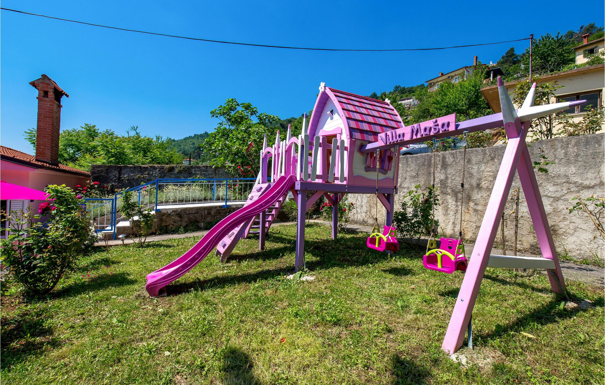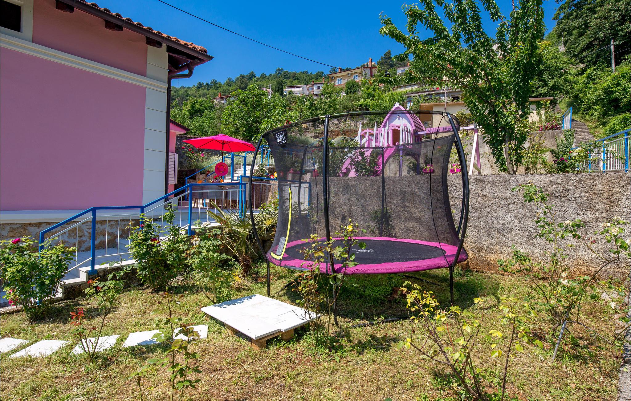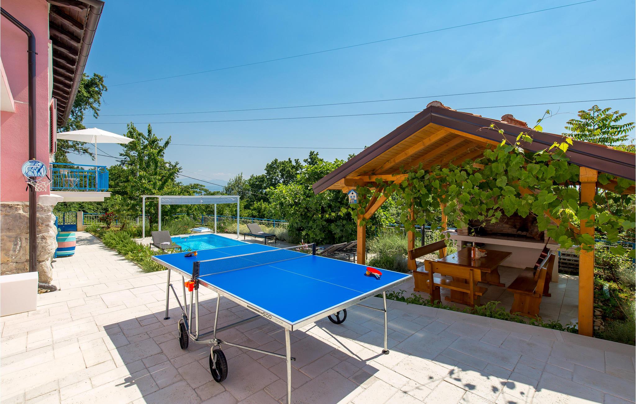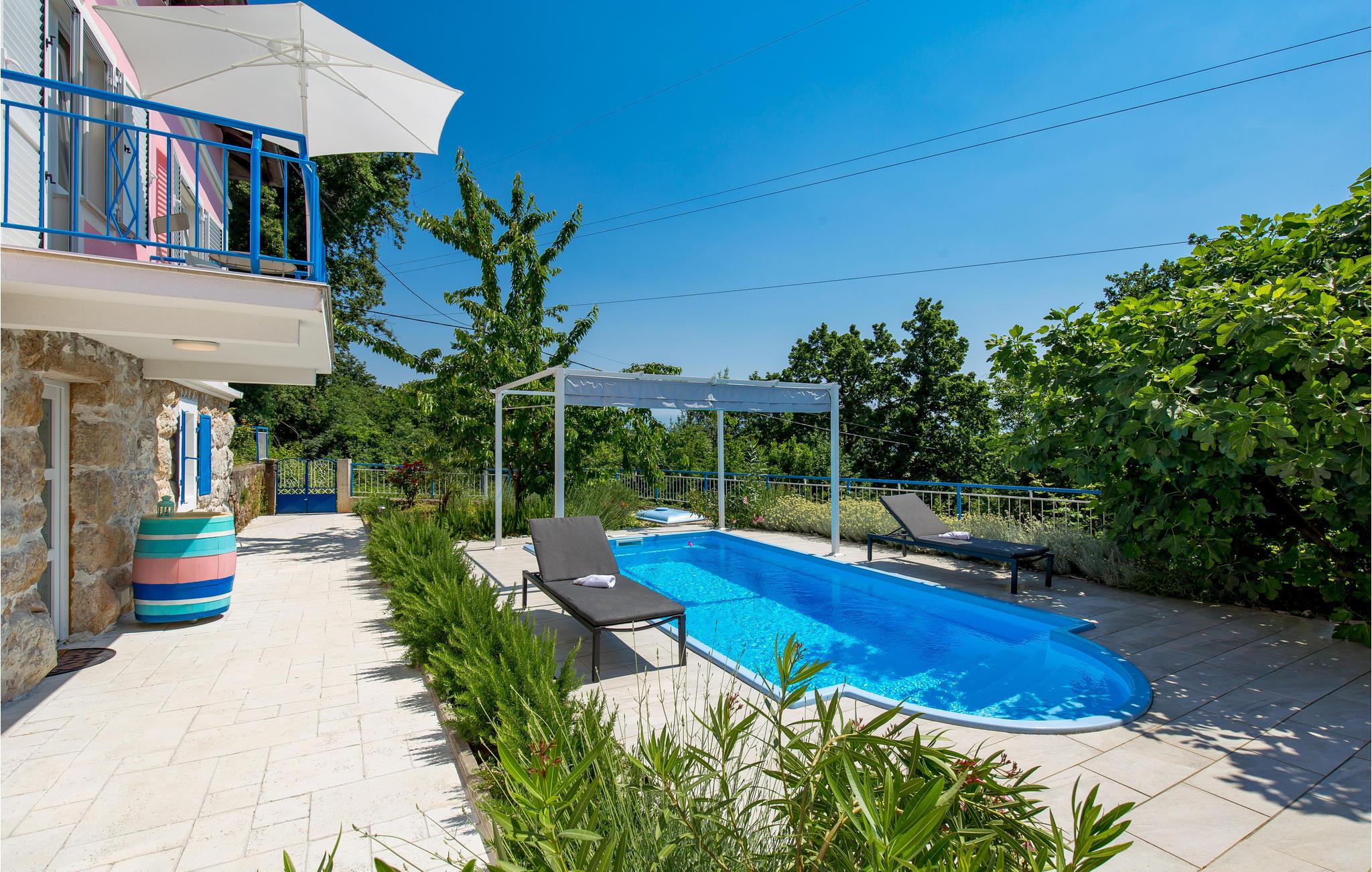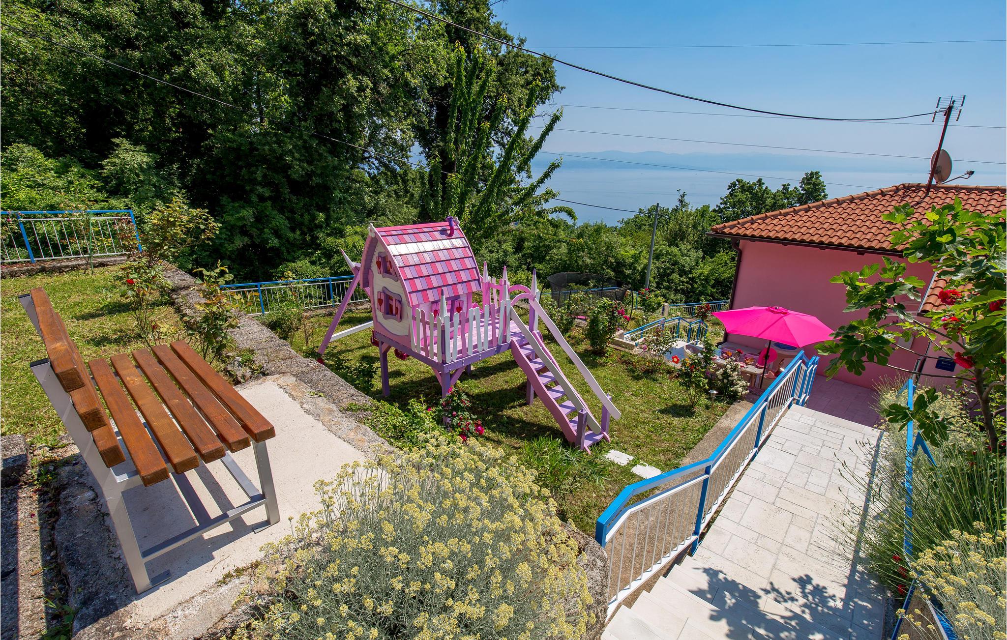 Tilbring en uforglemmelig ferie i dette renoverede feriehus med pool i den charmerende kystby Lovran ved Opatijas riviera. Det ligger på en stor grund over Lovran, med en flot panoramaudsigt over havet fra øverste etage. Huset består af to etager, som er forbundet med en udvendig trappe. På hver etage er en fuldt udstyret lejlighed, og derfor er denne feriebolig ideel til to familier, der ønsker at rejse sammen, samtidig at kunne bevare privatlivets fred. I haven er der to rummelige terrasser, en grill og en udendørs pool med solterrasse og bruser. I stueetagen er der et aktivitetsrum med billard, bordfodbold og dart. Her er også tænkt på legetøj til de yngste gæster. Et basketballnet og bueskydningssæt er også tilgængelige. Huset er møbleret med stor omhu og indrettet med moderne og praktiske møbler. Langs ejendommen fører en gågade direkte til centrum i Lovran og fører også til havet og stranden.