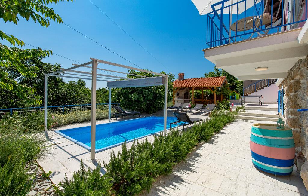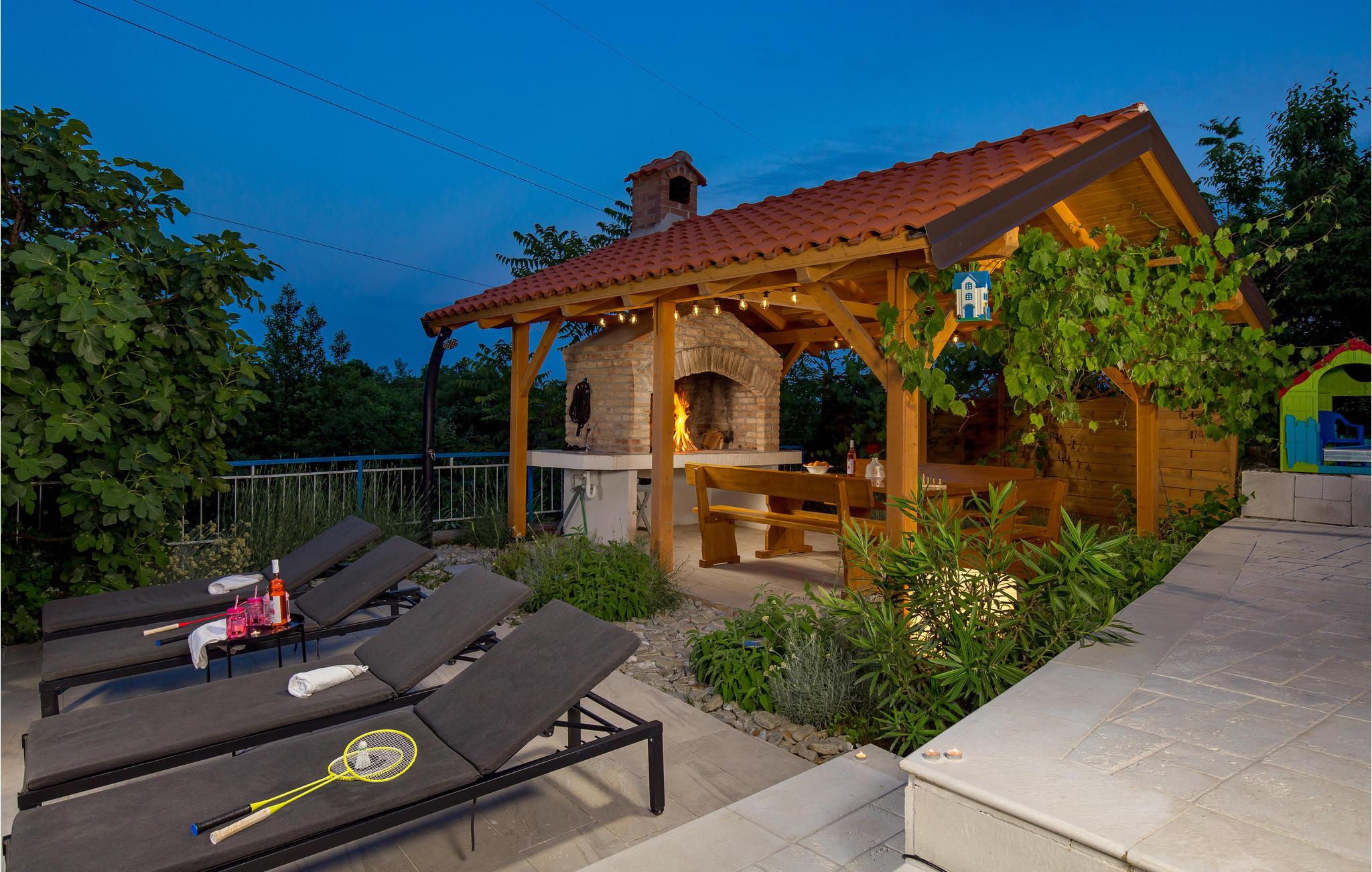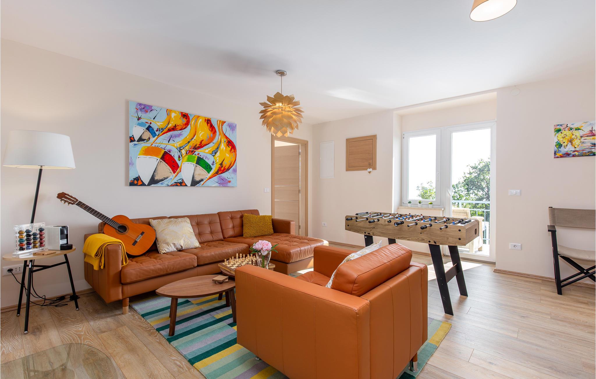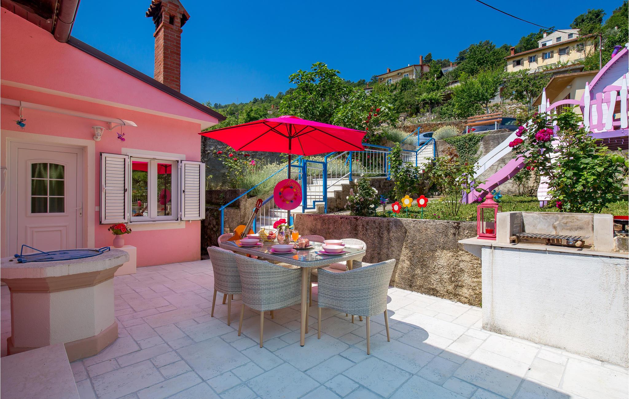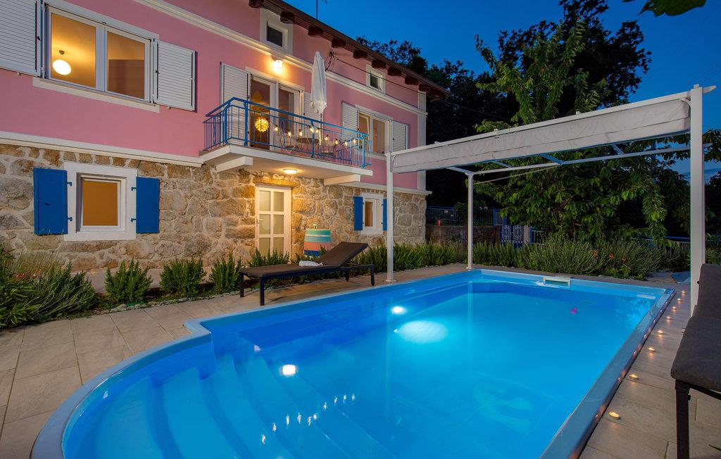 Tilbring en uforglemmelig ferie i dette renoverede feriehus med pool i den charmerende kystby Lovran ved Opatijas riviera. Det ligger på en stor grund over Lovran, med en flot panoramaudsigt over havet fra øverste etage. Huset består af to etager, som er forbundet med en udvendig trappe. På hver etage er en fuldt udstyret lejlighed, og derfor er denne feriebolig ideel til to familier, der ønsker at rejse sammen, samtidig at kunne bevare privatlivets fred. I haven er der to rummelige terrasser, en grill og en udendørs pool med solterrasse og bruser. I stueetagen er der et aktivitetsrum med billard, bordfodbold og dart. Her er også tænkt på legetøj til de yngste gæster. Et basketballnet og bueskydningssæt er også tilgængelige. Huset er møbleret med stor omhu og indrettet med moderne og praktiske møbler. Langs ejendommen fører en gågade direkte til centrum i Lovran og fører også til havet og stranden.