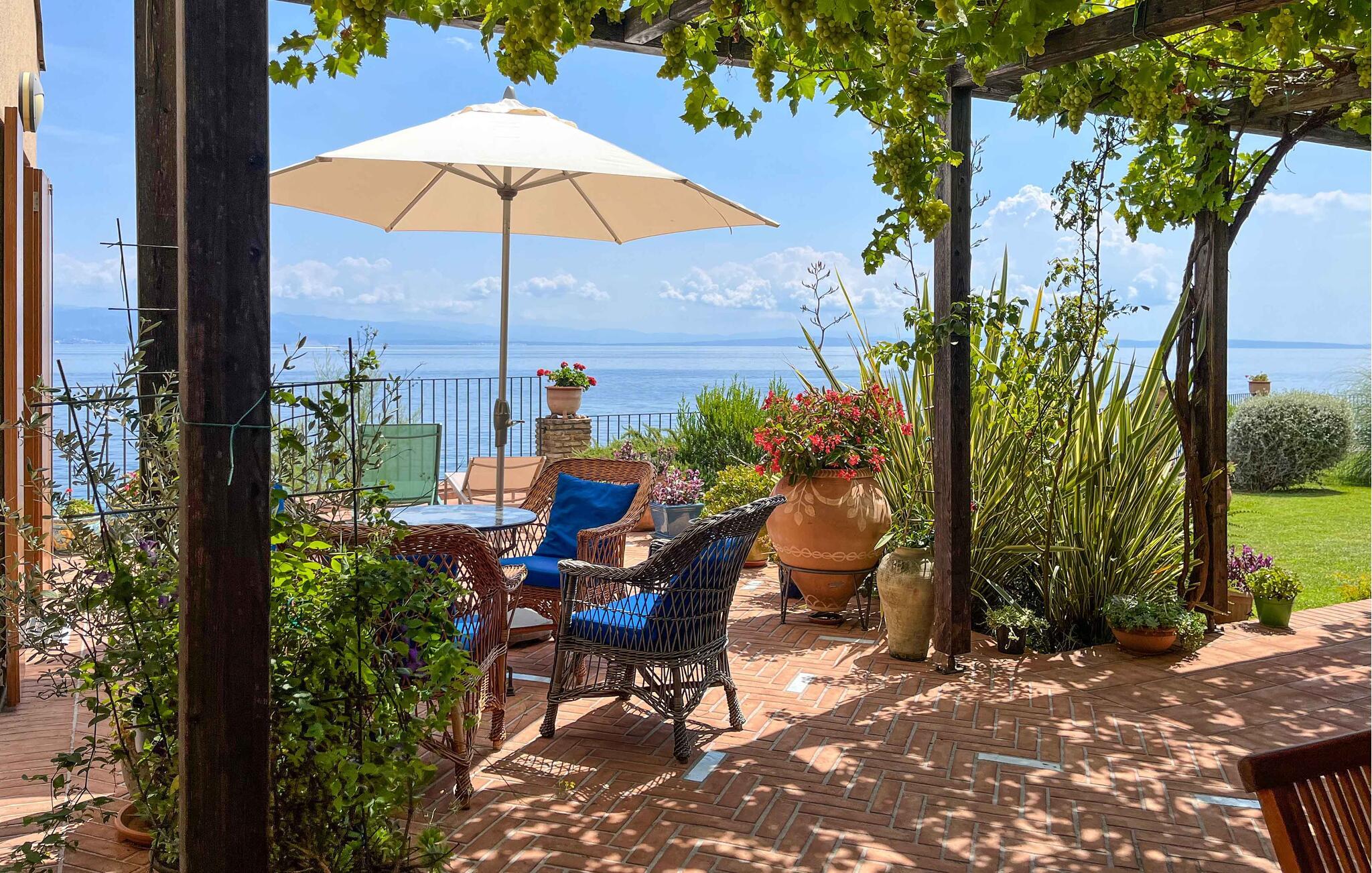 Villa Mirvami Lovran besteht aus 3 Ebenen: der ersten Ebene, wo sich die Parkplätze befinden, der zweiten, Hauptebene und der dritten, der so genannten Meeresebene. Von der ersten Ebene geht es hinunter zur Hauptebene, wo sich ein großer Wohnbereich mit Küche und Essbereich befindet. Die große Terrasse über dem Meer ist von einem wunderschönen mediterranen Garten umgeben (mit einem speziellem Bereich für Gemüse und Kräuter). Hier werden Sie auch eine geräumige Sommerküche mit einem schönen Essbereich unter der Pergola sowie einen Grill und eine separatenAußentoilette vorfinden. Von der Terrasse über dem Meer haben Sie einen spektakulären Blick über die Kvarner Bucht und die Inseln. Tagsüber können Sie sich am Esstisch und auf den Sofas im Schatten der Pergola vor der Sonne zurückziehen. Am Abend können Sie auf der schönen Terrasse direkt über der Klippe sitzen und erfrischende Brisen vom Berg Ucka genießen. An heißen Sommernächten ist da noch eine Terrasse oberhalb des privaten Strandes, wo Sie auch bei Nacht schwimmen können.