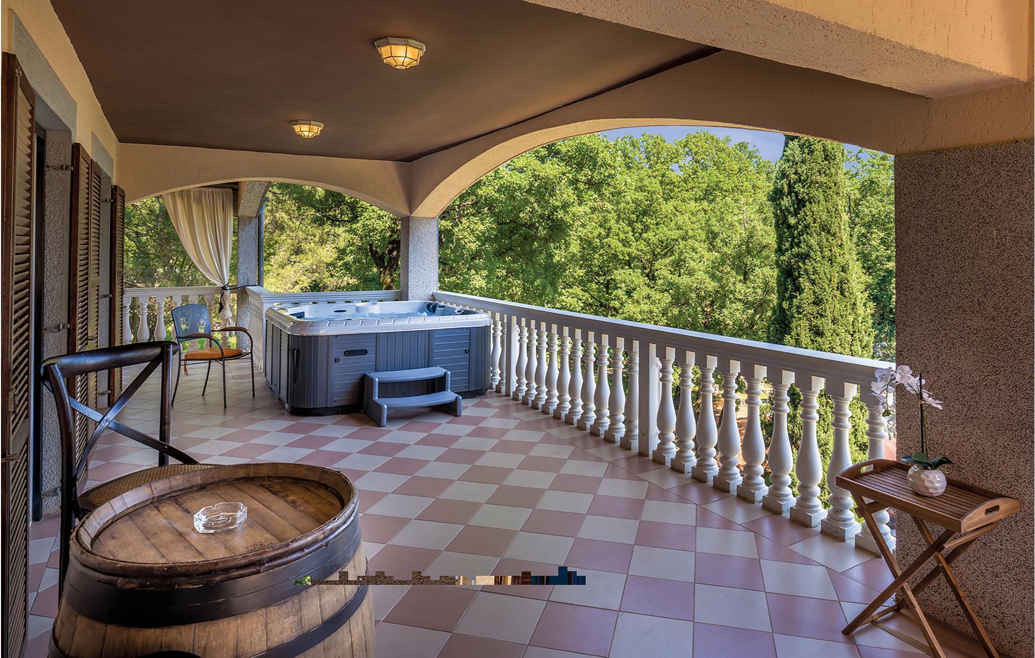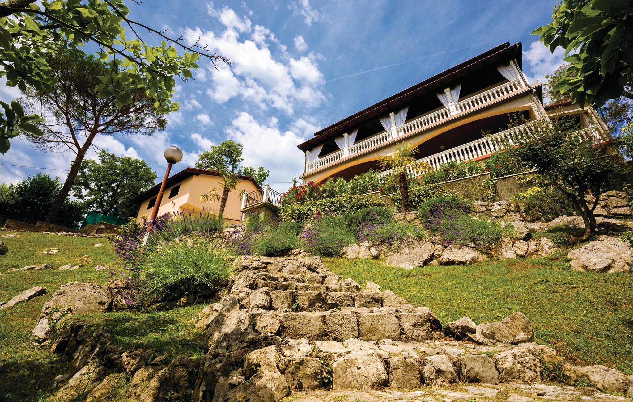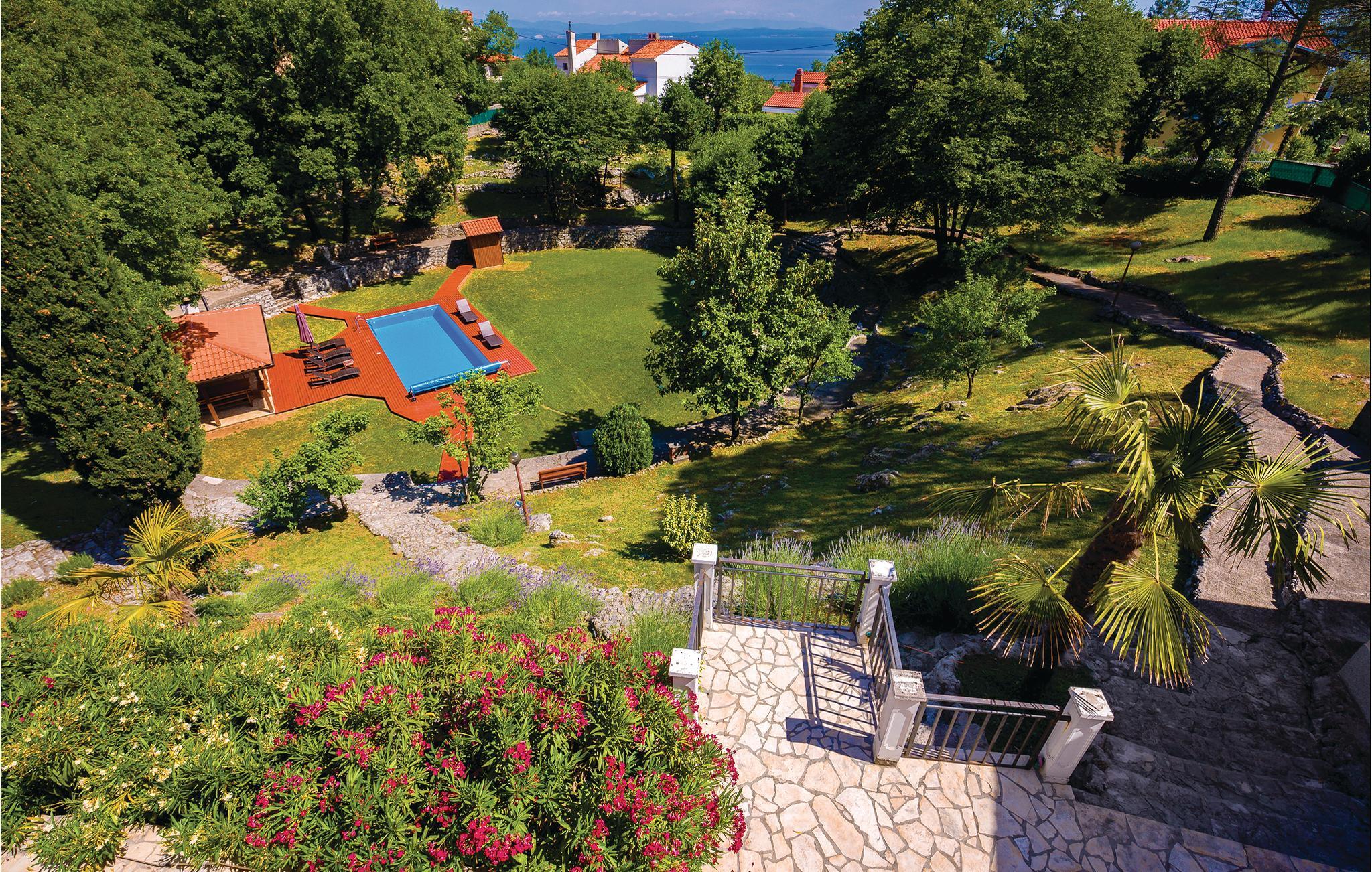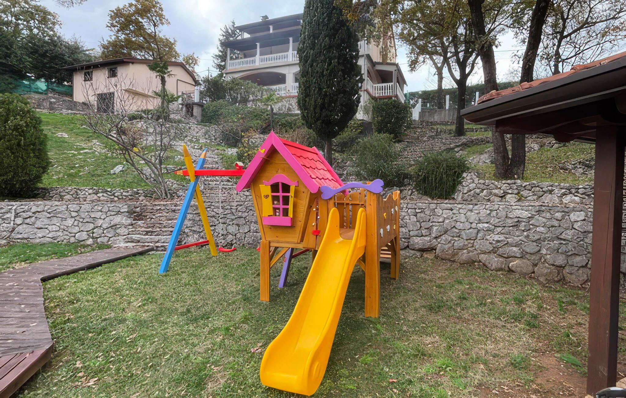 På en stor, indhegnet grund ligger dette komfortable feriehus. Det består af stueetage, første og anden sal og har indendørs trapper. På hver etage er der store terrasser med liggestole og havemøbler, hvor I kan nyde jeres morgenkaffe og den herlige udsigt. Centralt udenfor, omgivet af grønt, ligger også poolen, der vil sørge for afkøling på de varme sommerdage. I stueetagen kan I more jer i spillerummet med billard og bordfodbold. På kun få minutter kan I køre til Opatija og de første badestrande; skønne kiselstrande er der også ved Icici og Medveja.
