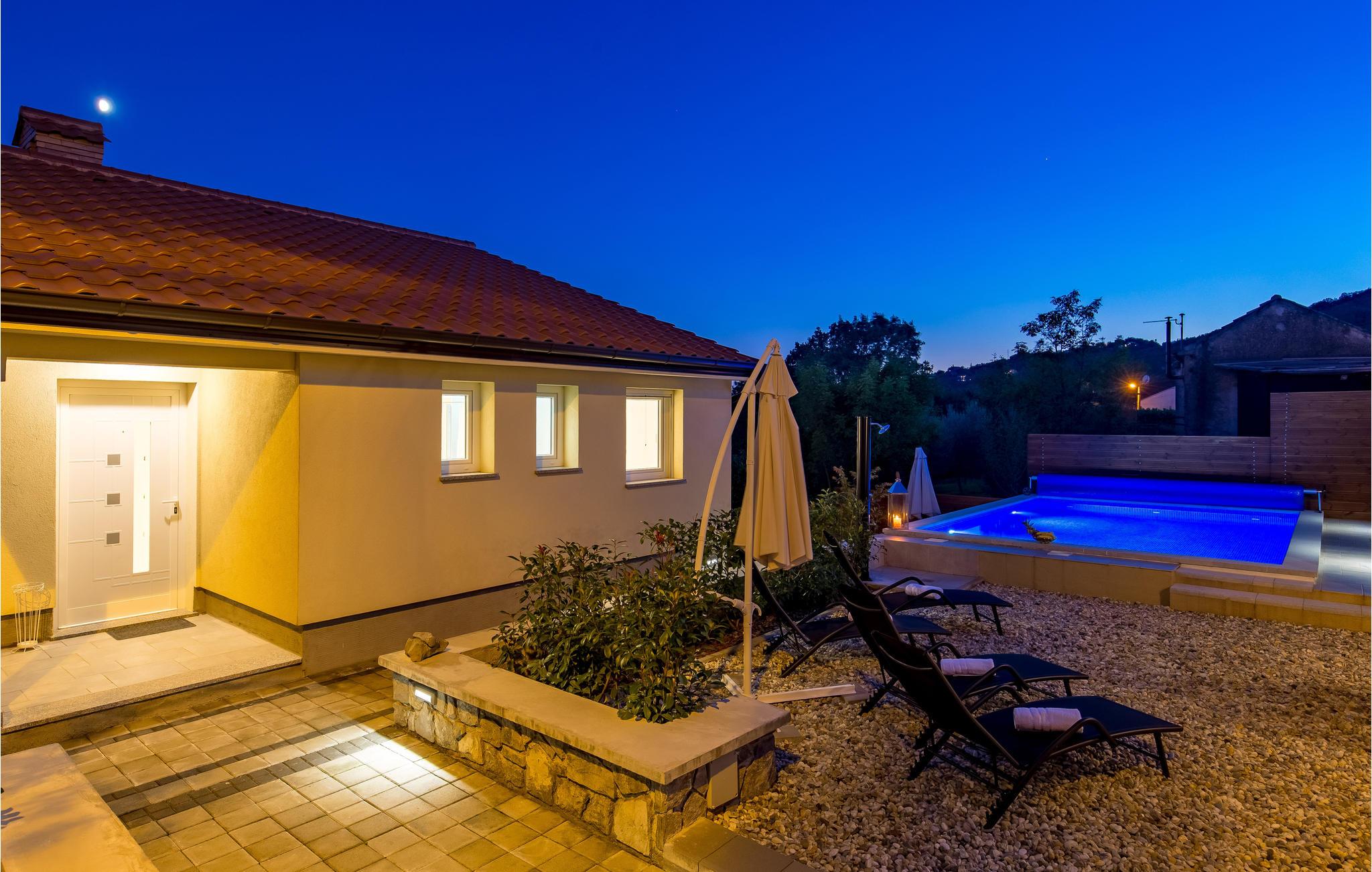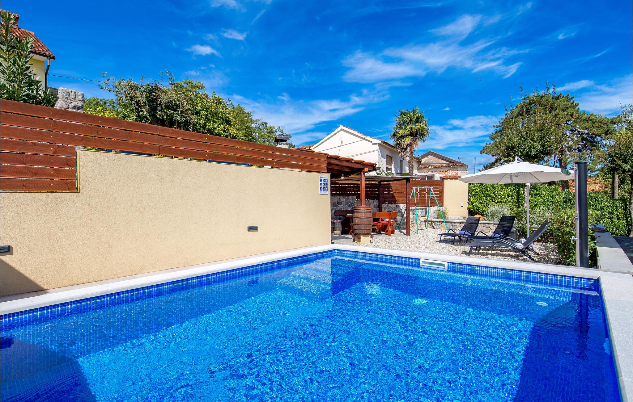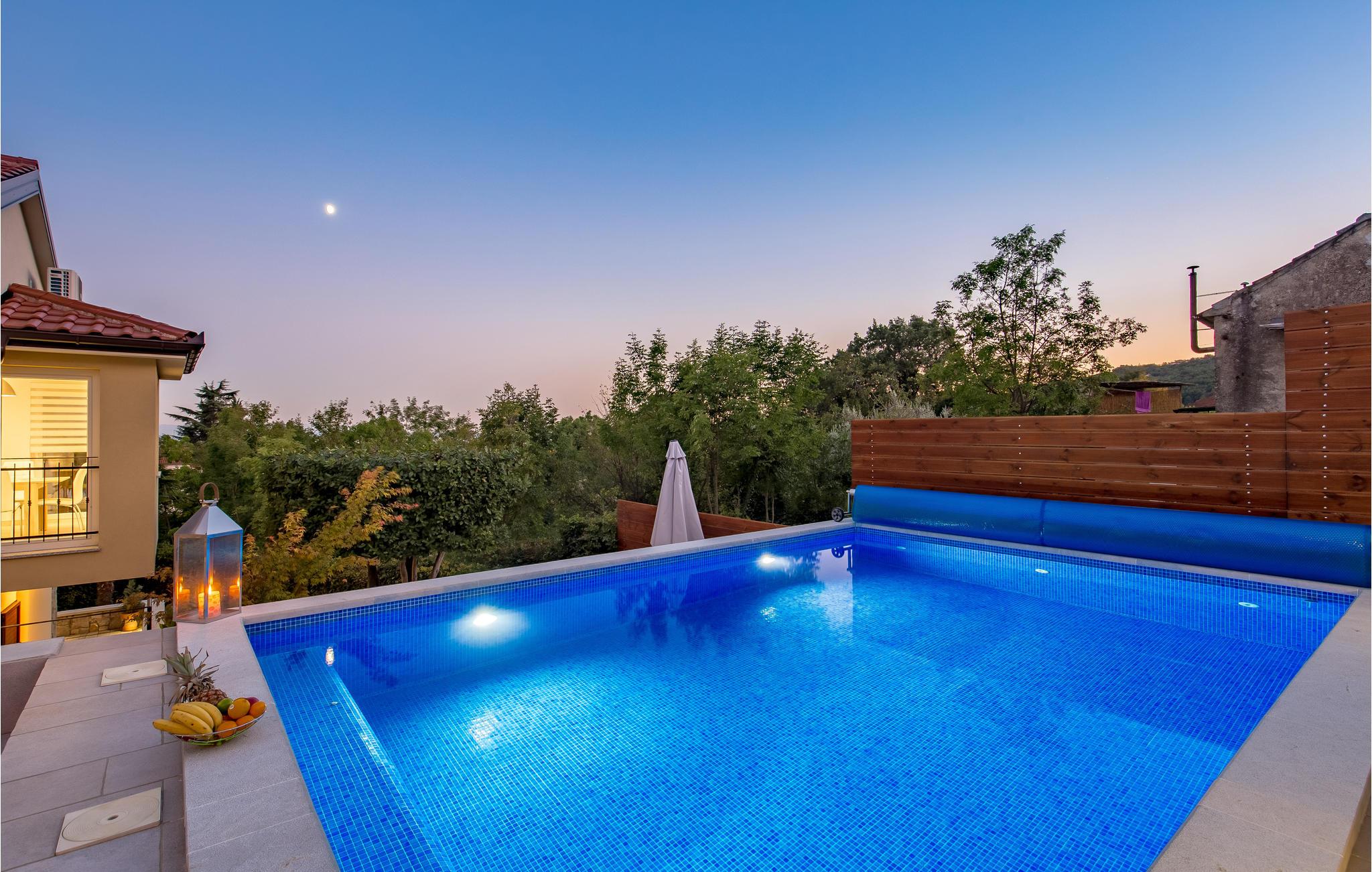 I den lille landsby Matulji ikke langt fra Opatija ligger dette smukke og moderne feriehus med udvendige trapper. I stueetagen er der en mindre lejlighed med egen opholdsstue, køkken, soveværelse og badeværelse. Derudover er der en rummelig stue med køkken, tre soveværelser og to badeværelser på øverste etage. Huset er derfor velegnet til to familier eller venner, der vil holde ferie sammen, men stadig vil have mulighed for privatliv. På ejendommen er der en skøn grillterrasse, som er velegnet til sociale sammenkomster, samt en pool, hvor I kan køle af på varme sommerdage. Ved siden af huset er der en olivenlund og en eng, hvor børnene kan lege i trygge rammer. Opatija byder på et væld af underholdningstilbud både i sommermånederne og resten af året. Husk at smage den lækre lokale gastronomi. Besøg også naturparken Ucka med talrige skov- og cykelstier.