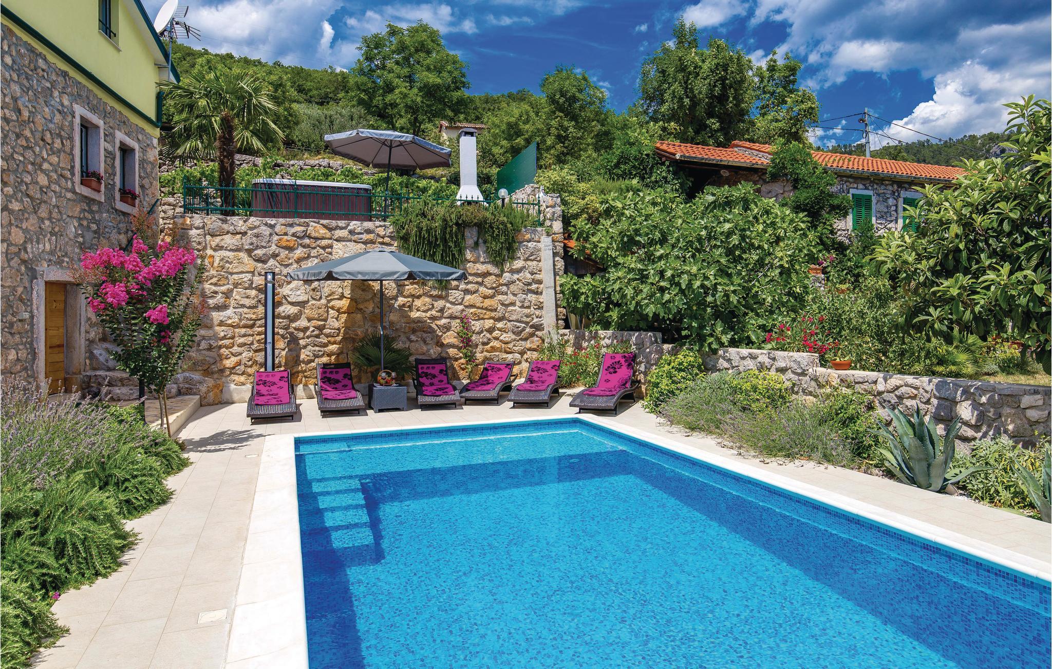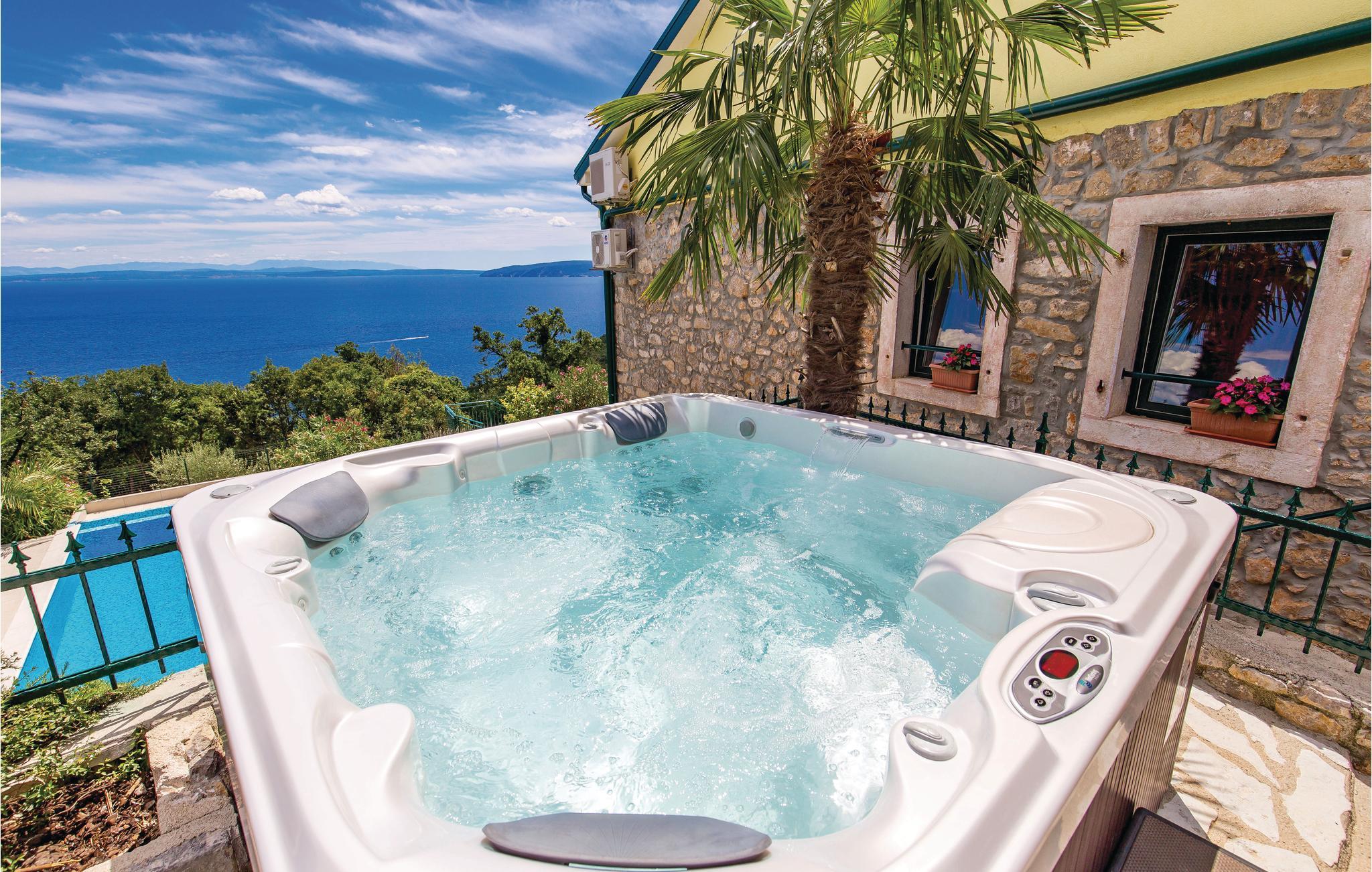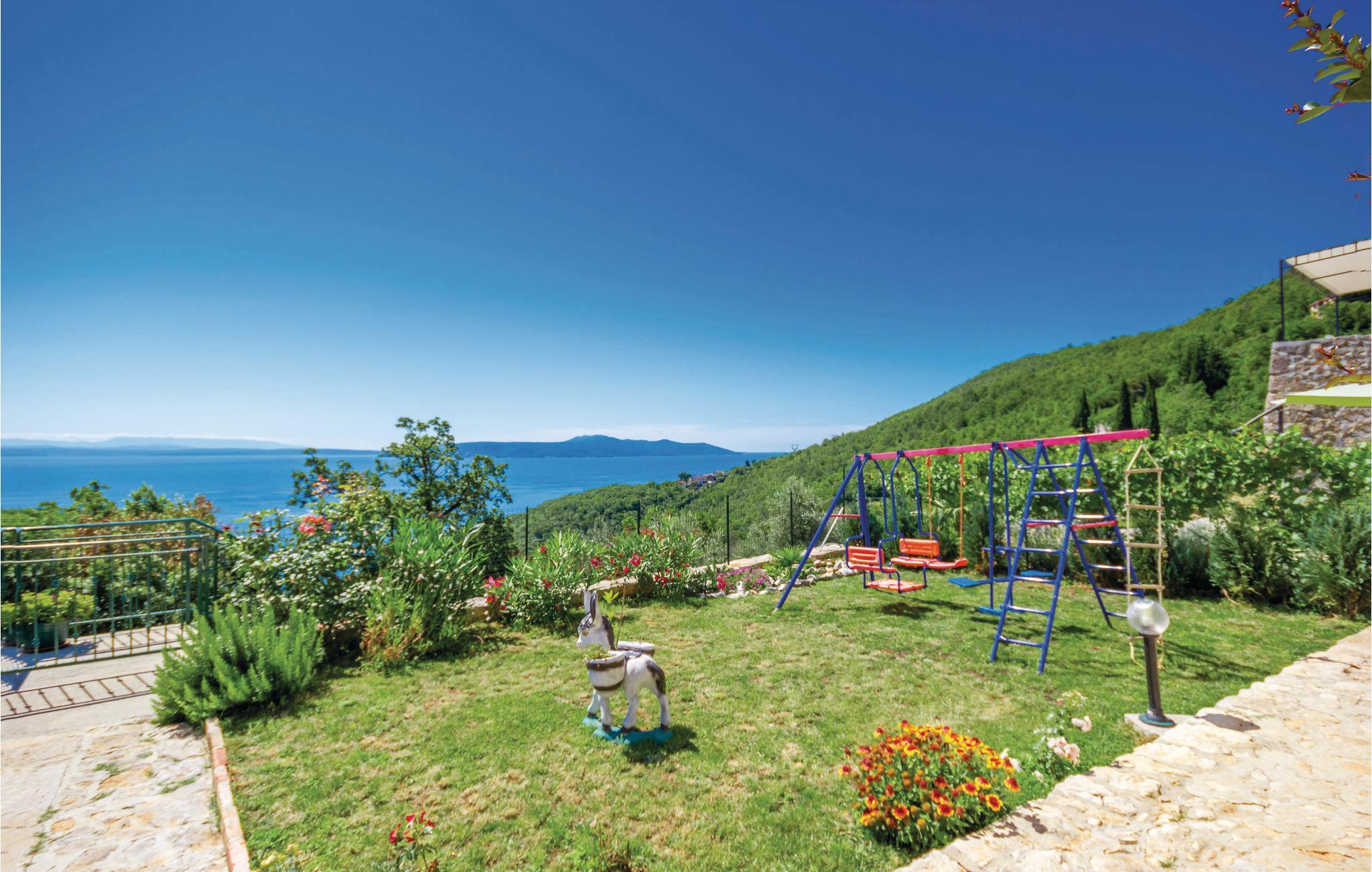 Dette autentiske halve dobbelthus er bygget i 1856, men komplet restaureret og nyindrettet i 2012. Det ligger i rolige omgivelser, omgivet af meget grønt, med en vidunderlig udsigt til havet og Kvarner-Bugten. Førstesalen har en stor dagligstue og køkkenet, mens soveværelserne er på tagetagen, laveste loftshøjde 30 cm. I stueetagen venter der jer et fitness- og fritidsrum, der er forbundet med første sal via en udendørs trappe. Afkøling byder poolen på, hvis særlige træk er, at den har både et dybt bassin (25 m²) og et børnebassin (5 m²). I behøver kun at køre til den nærmeste strand, Medveja, da der er mange fritidstilbud dér, der giver underholdning og sjov foruden et forfriskende bad. Stranden er ideel til alle aldersgrupper. Om aftenen kan I gå gennem gaderne i Opatija. Vi anbefaler jer også, at I smager fiskespecialiteter på en af de mange restauranter, der har et rigt gastronomisk tilbud. Huset er ideelt til fælles ferie for flere familier eller venner. Husets ejer bor ikke langt væk.