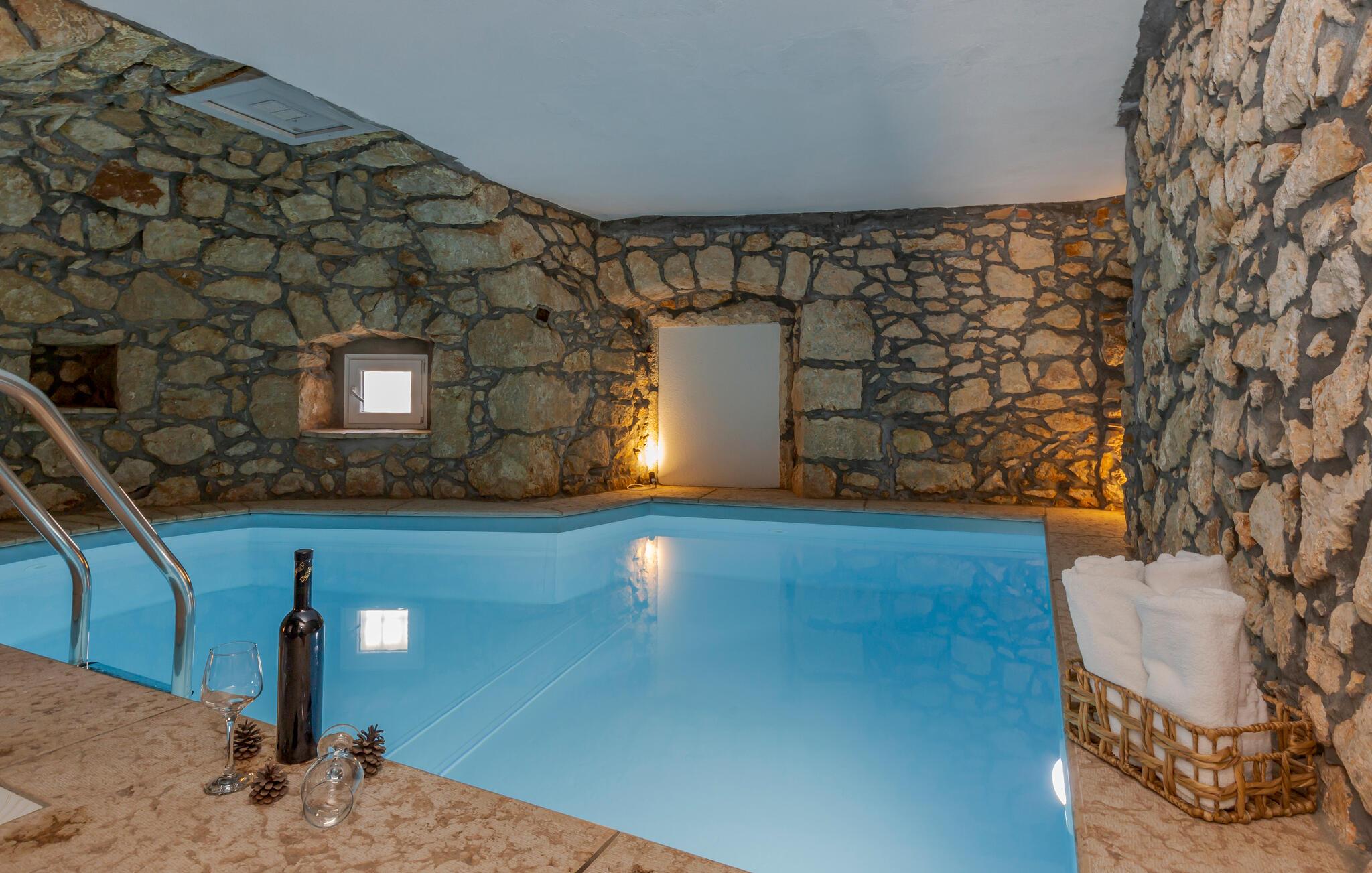Velkommen til dette hyggeligt indrettede feriehus. Indretningen er domineret af kombinationen af ??træ og sten, som bidrager til det lokale look og får jer til at slappe af. Der er lagt særlig vægt på detaljer, som afspejles i meget interessante møbler og dekorationer, hvilket gør boligen speciel. Tilbuddet rundes af af en opvarmet indendørs pool, som samtidig bidrager til et behageligt ophold og lover familien badehygge.