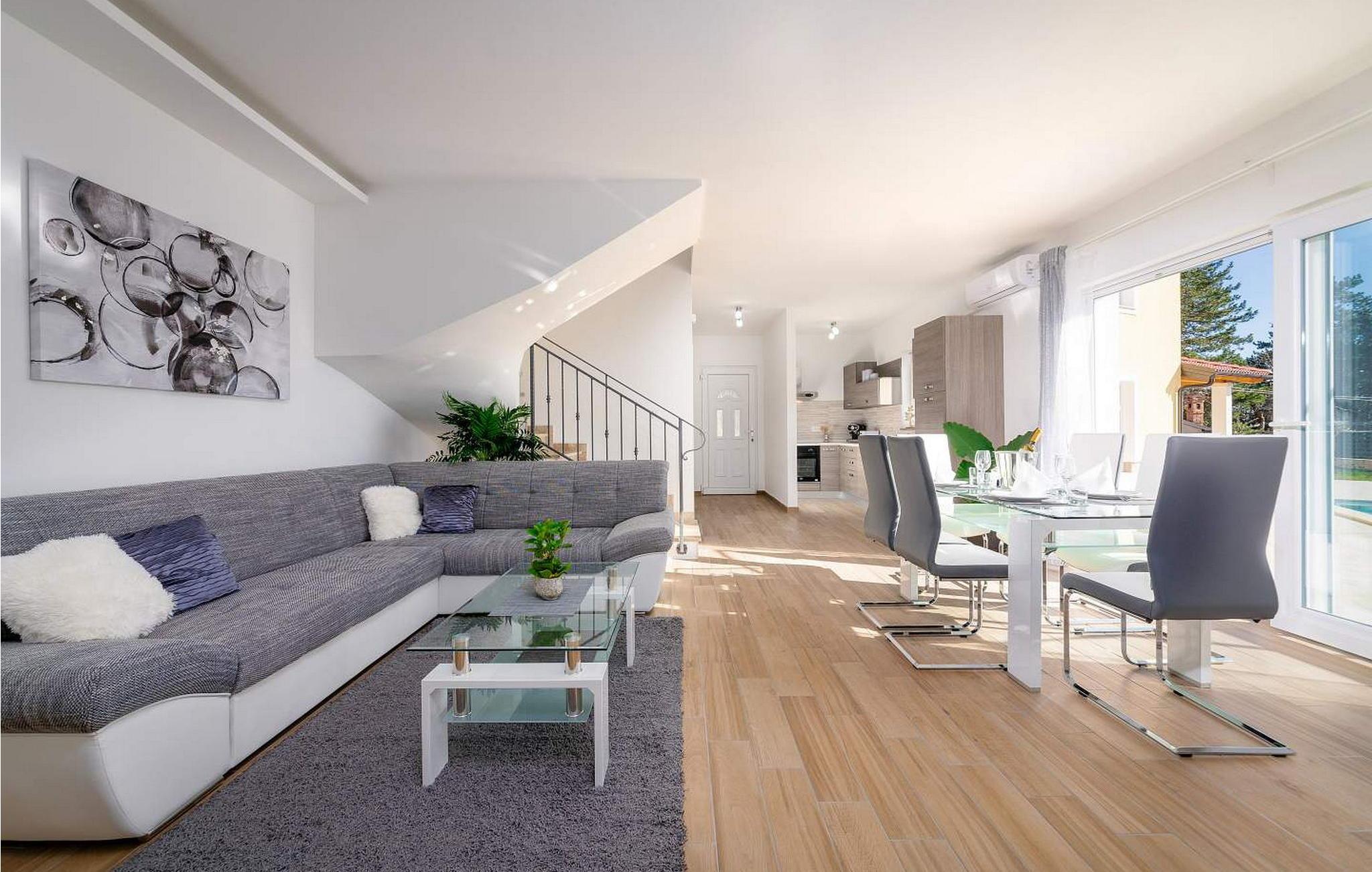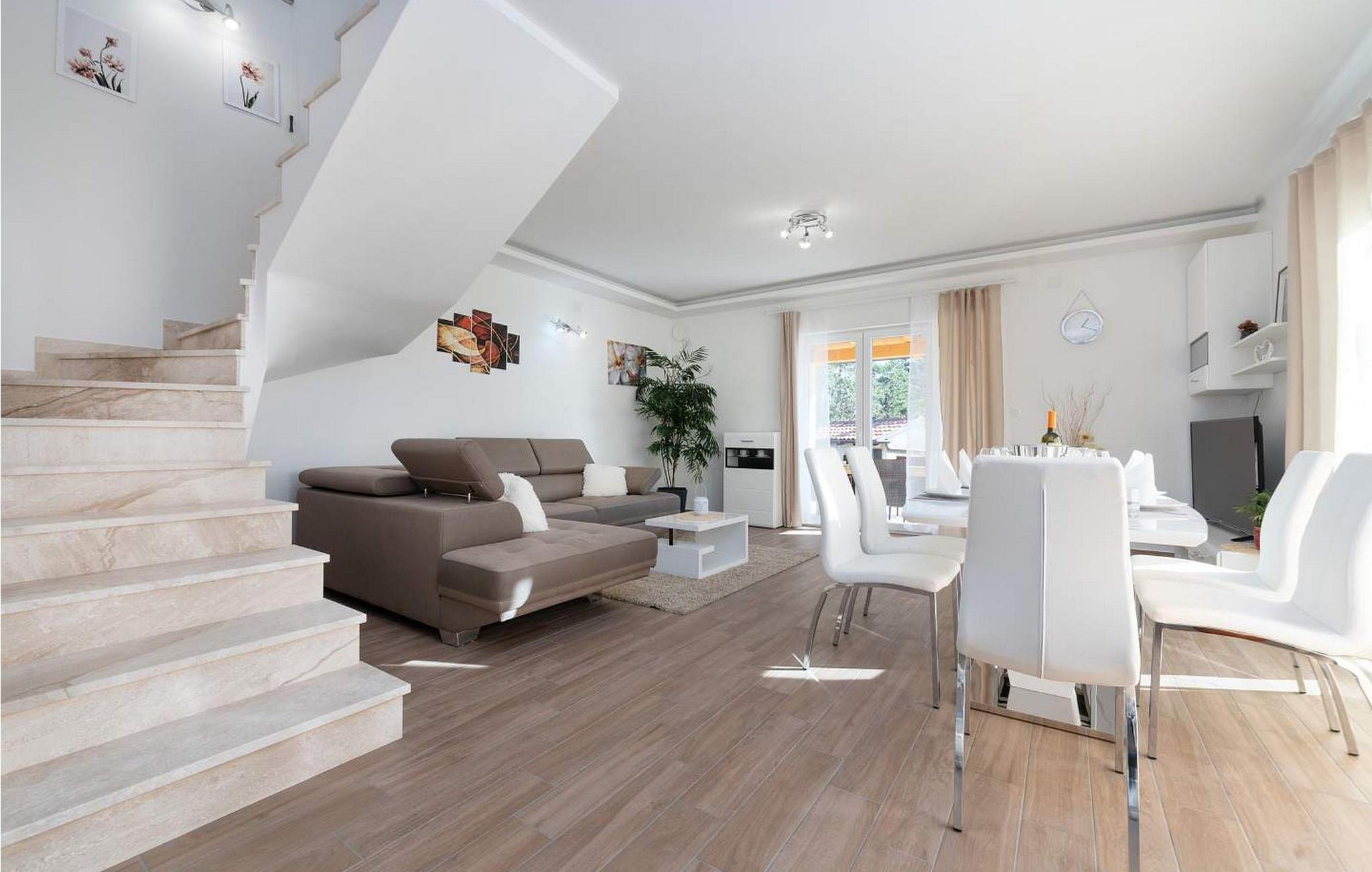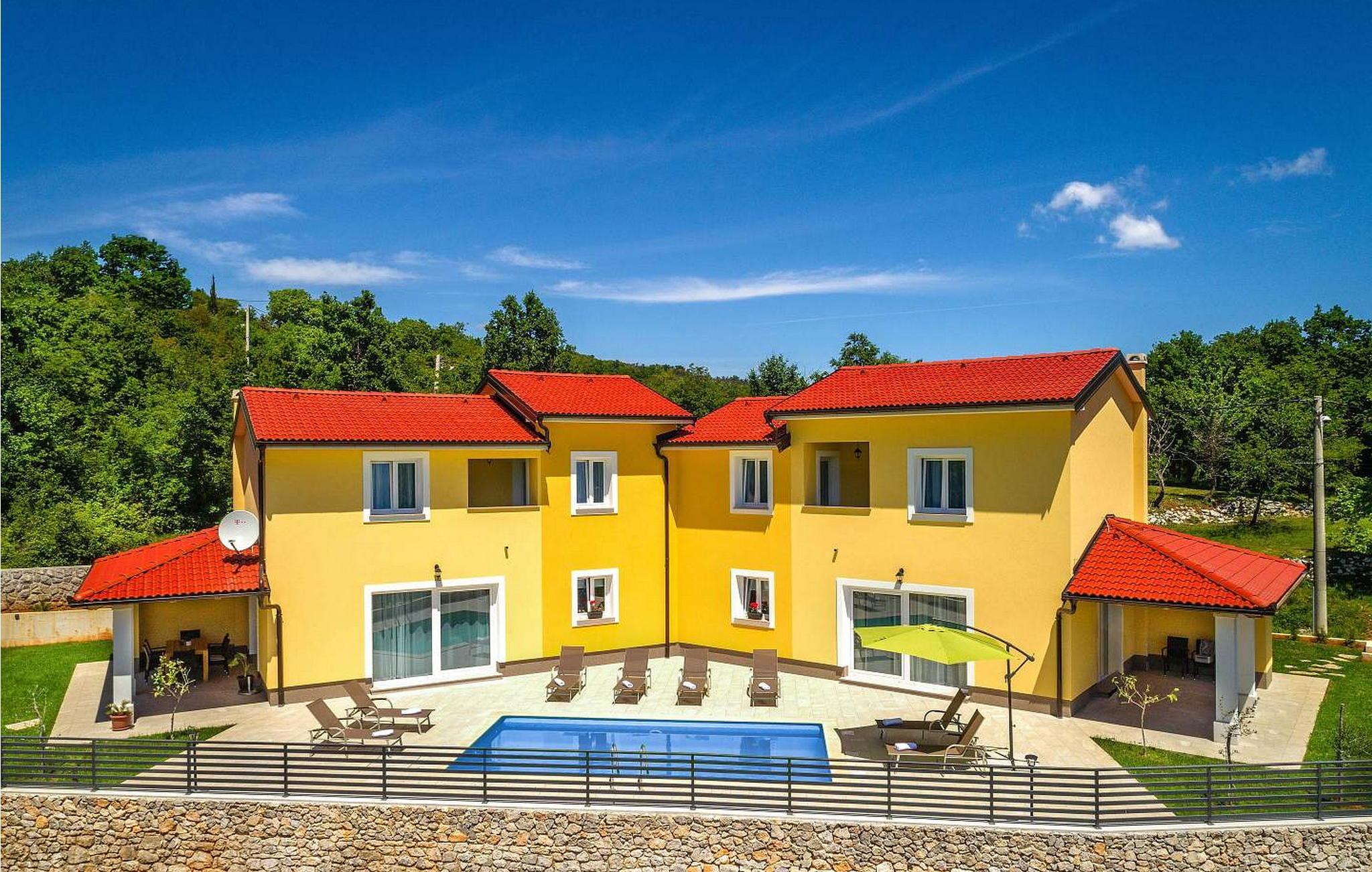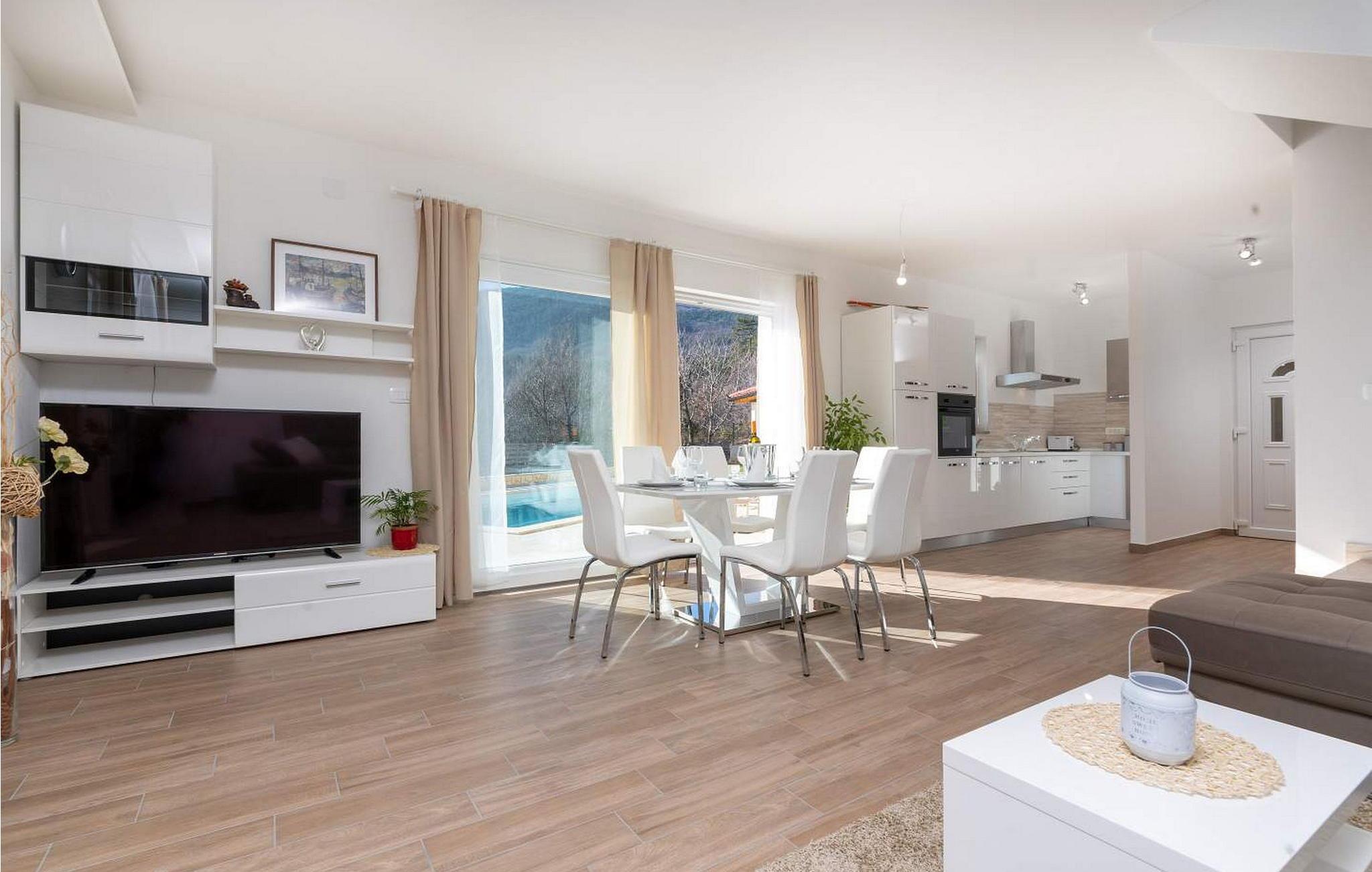 Villa Terra er et nybygget og rummeligt hus beliggende i en rolig beliggenhed, over den lille landsby Moscenice, nær kystbyen Moscenicka Draga med den smukke stenstrand Sipar. Ved siden af ??huset er der en bio-grøntsagshave til gæsternes rådighed. For dem, der ønsker at besøge den berømte Adriaterhavsperle Opatija eller byen Rijeka, vil det kun tage 30 - 40 minutter i bil. Denne unikke beliggenhed giver dig muligheden for en afslappende ferie væk fra de overfyldte, larmende veje med smuk panoramaudsigt over havet i uspoleret natur ved Ucka-bjerget nedad. Villa Terra ligger på en fuldt indhegnet have på 1300 kvm og tilbyder sine gæster en udendørs pool på 32 kvm med en rummelig solterrasse og liggestole, to overdækkede terrasser udstyret med bord og stole til 6 personer, en stor overdækket terrasse på forsiden af huset med grill og faciliteter såsom bordfodbold og bordtennis, 2 parkeringspladser inde i ejendommen og 2 mere på ydersiden og en legeplads. Villa Terra med et samlet areal på 220 kvm kan rumme op til 8 gæster. Den består af to separate boligenheder, hver enhed med følgende layout: i stueetagen er der stue, spisestue og udstyret køkken og et bad/toilet; på øverste etage er der to soveværelser, et med dobbeltseng og eget bad/toilet og et med separate senge og eget bad/toilet. Soveværelserne deler balkon med flot panoramaudsigt. Huset er fuldt airconditioneret. Bemærk venligst, at denne ejendom ikke accepterer ungdomsgrupper eller polterabends. En ungdomsgruppe på denne ejendom er en gruppe bestående af personer på 26 år eller derunder. Book ikke denne ejendom, hvis du er en ungdomsgruppe eller et polterabend, da din reservation vil blive afvist efter booking, hvilket kan omfatte ved ankomst til ejendommen eller under dit ophold, og du vil ikke blive refunderet.